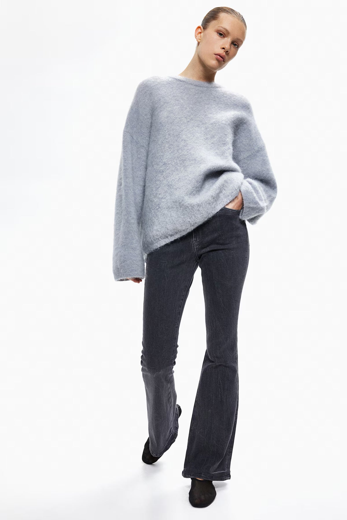 5-pocket jeans in denim with extra stretch for best comfort. Slim fit from waist to thigh and flared from knee to hem. Extra-high waist and zip fly with button. Regular length, designed to fall at top of foot with little or no stacking. Style with everything from crop tops to chunky knitwear.