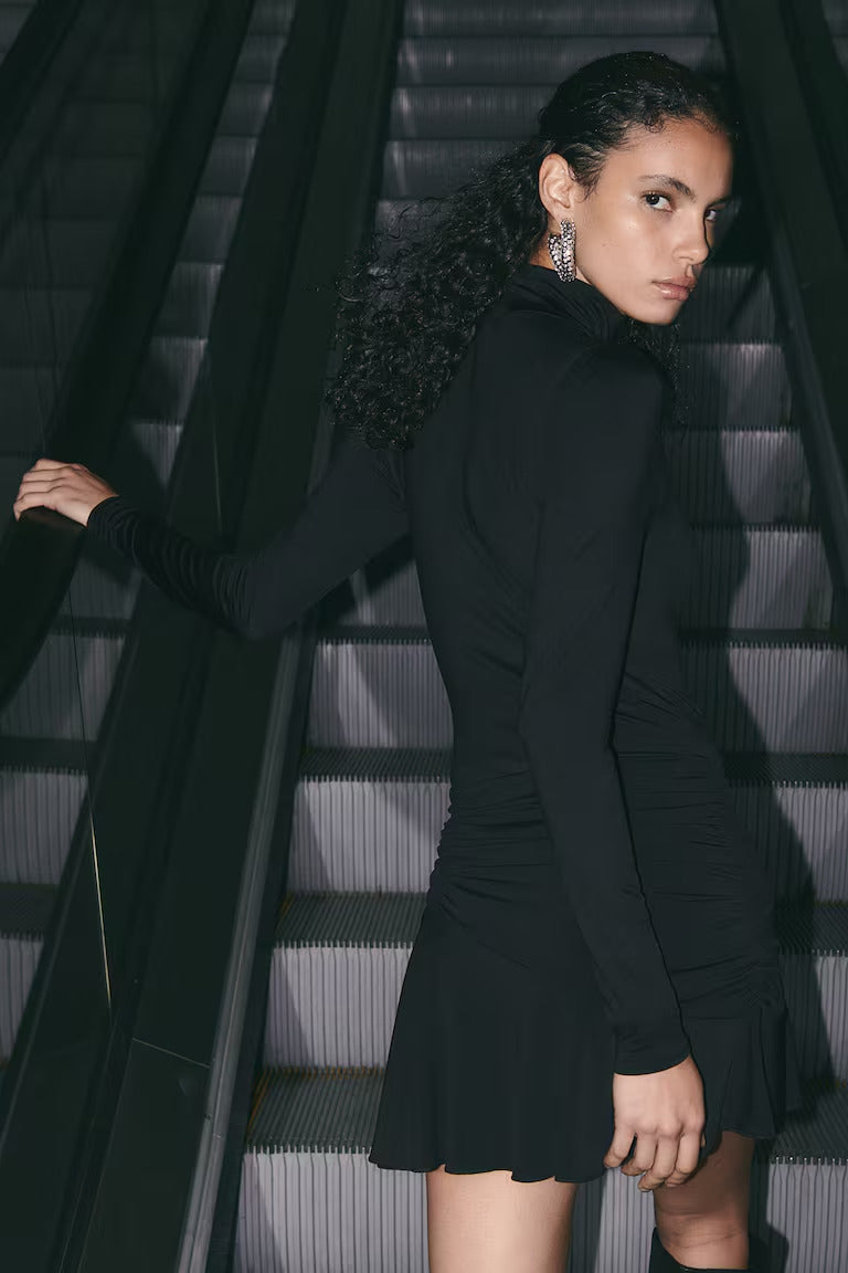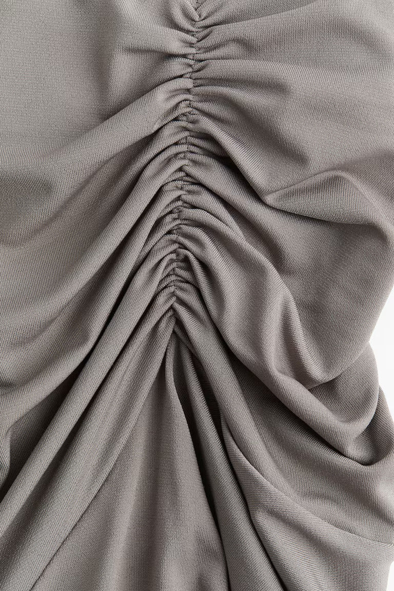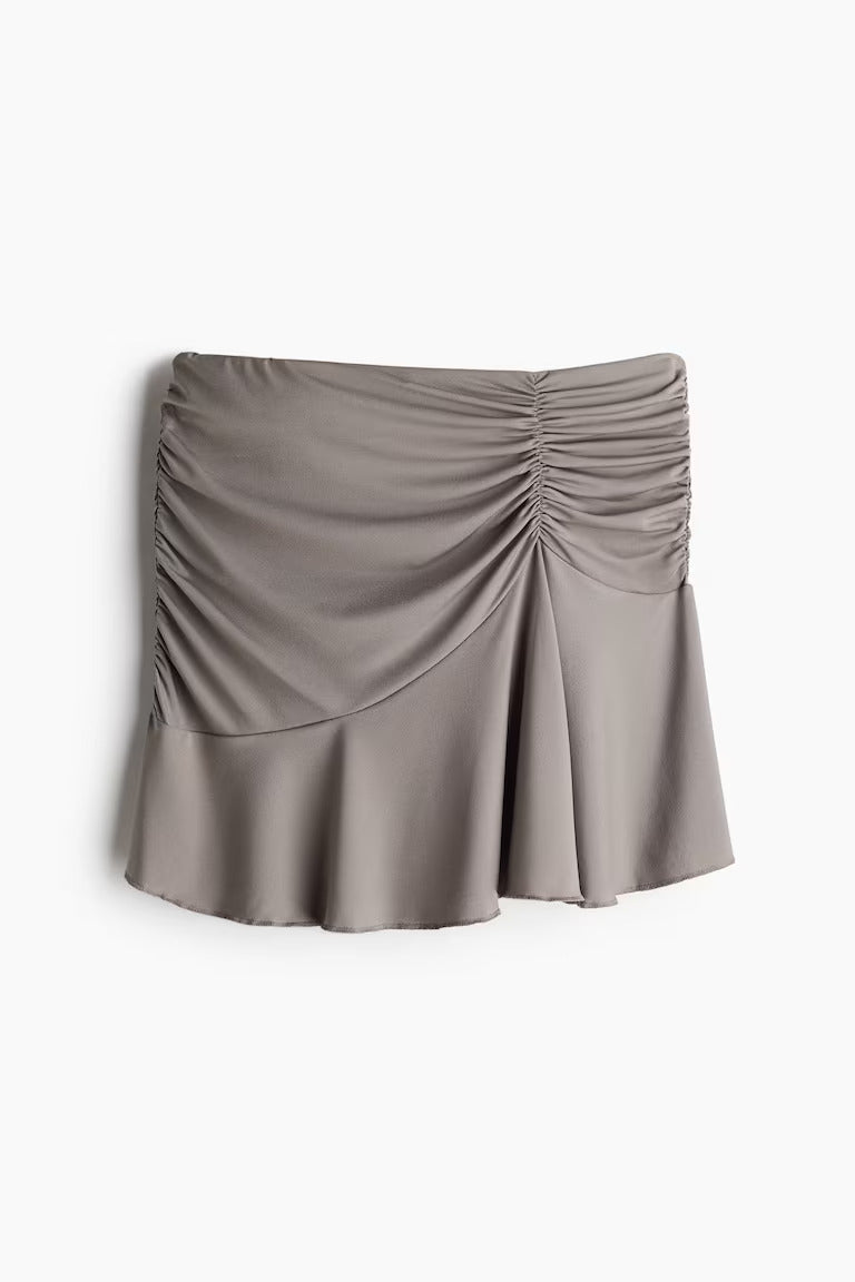 Fitted mini skirt in stretch jersey. Concealed, elasticized waistband, asymmetric seam over hips, and gathered seams at front, back, and sides for a gently draped effect. Wide, overlocked flounce at hem.