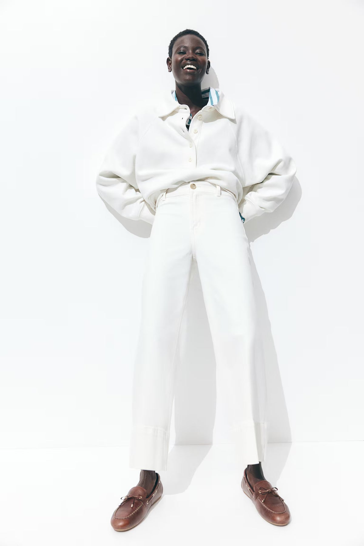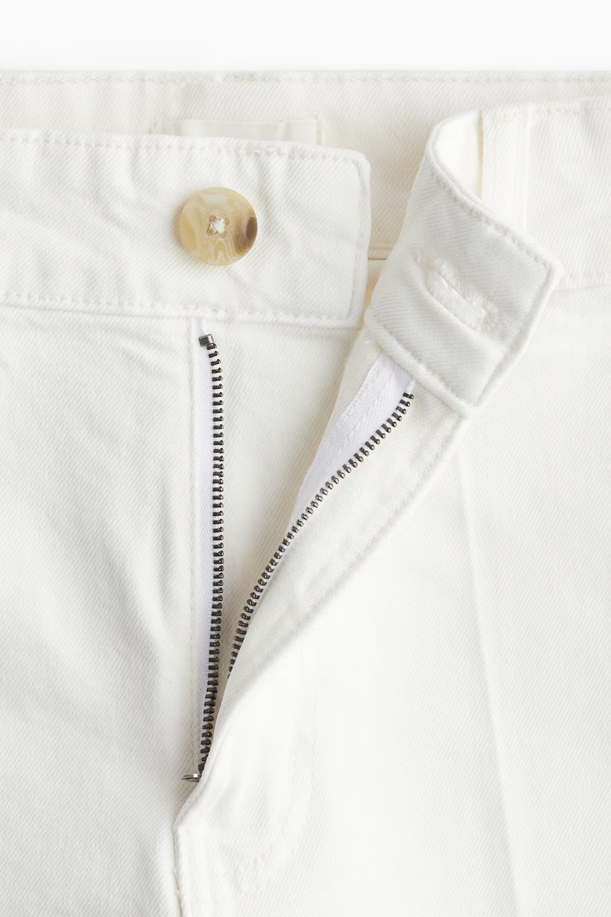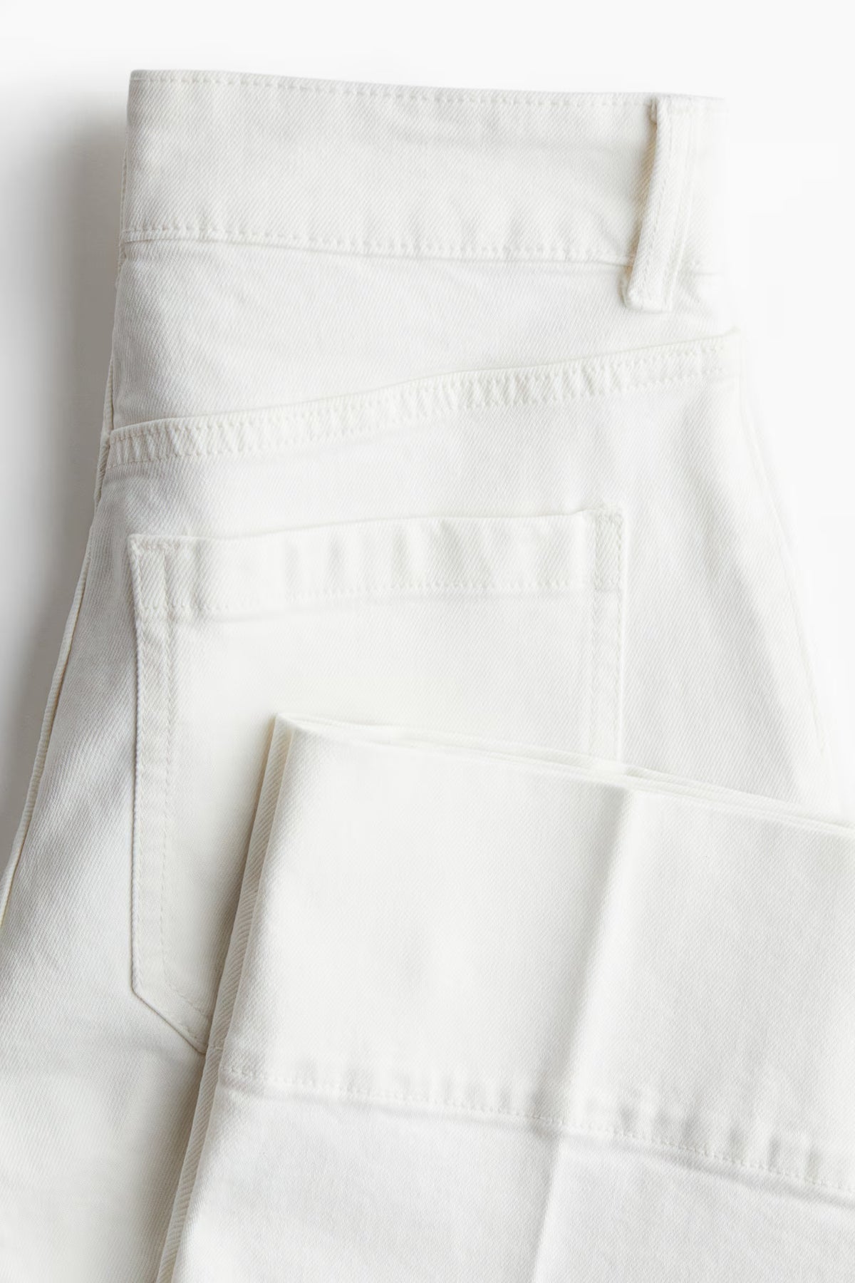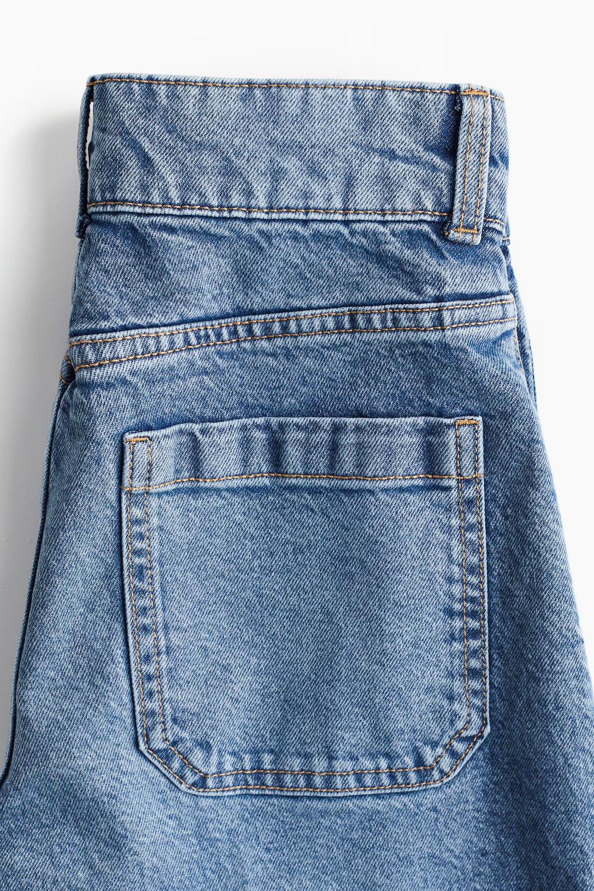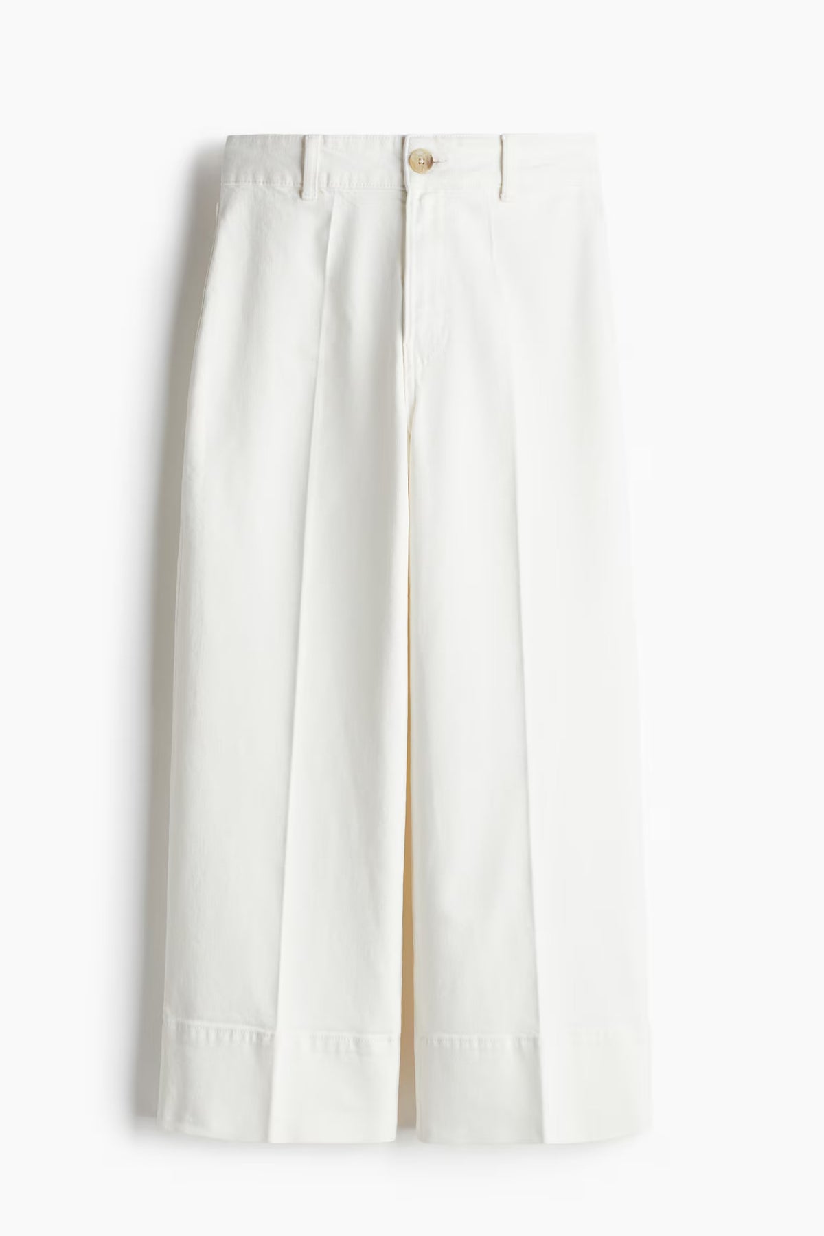 Wide-leg jeans in cotton denim with gentle stretch for added comfort. Regular fit from waist to hip and wide cut from thigh to hem. High waist and zip fly with button, patch back pockets, and shorter legs, designed to hit above ankle bone. A wardrobe essential.