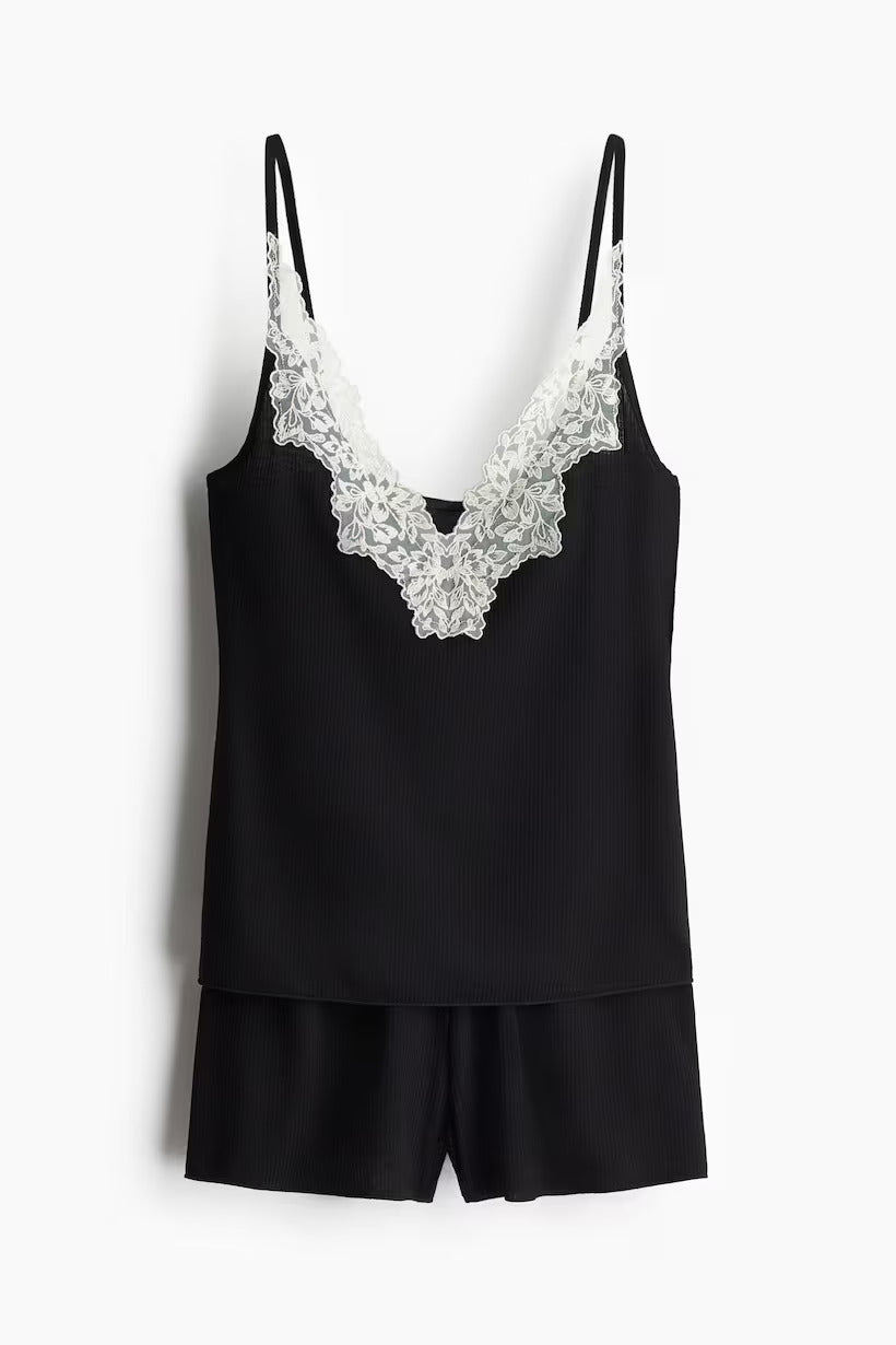 Pyjamas with a strappy top and pair of shorts in ribbed jersey. Top with a lace-trimmed V-neckline and an overlocked hem. Shorts with an elasticated waist and overlocked hems.