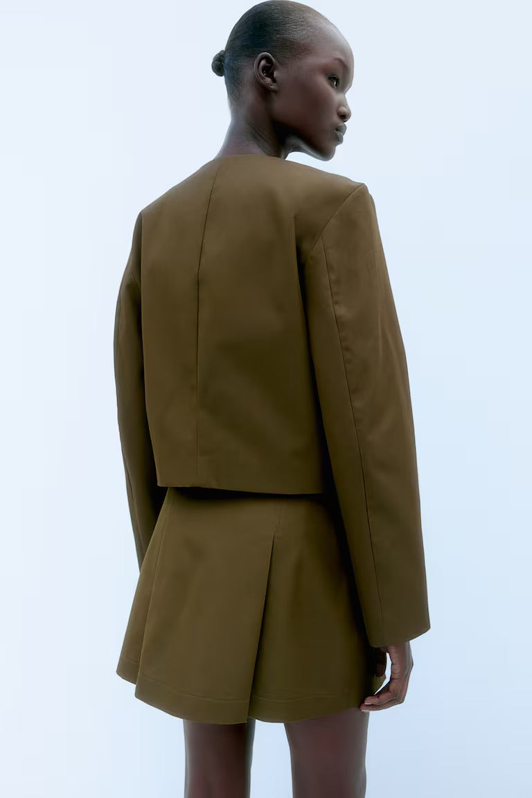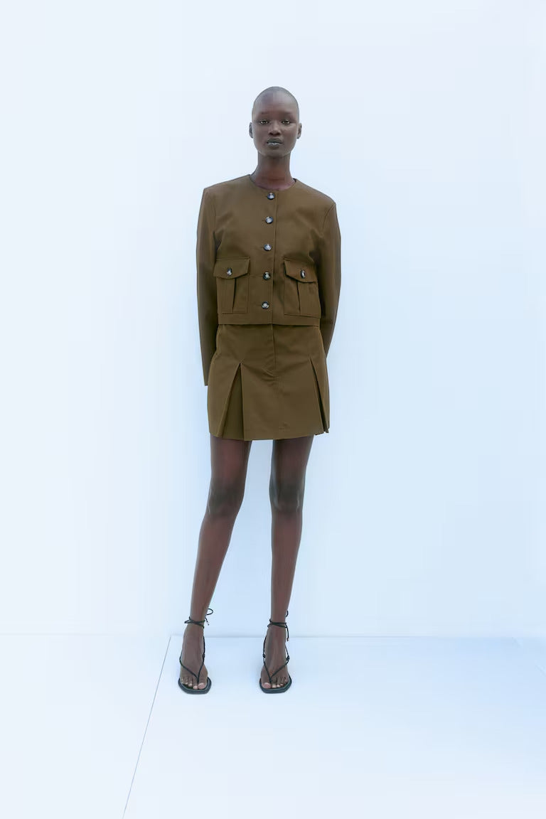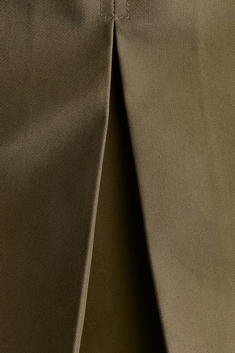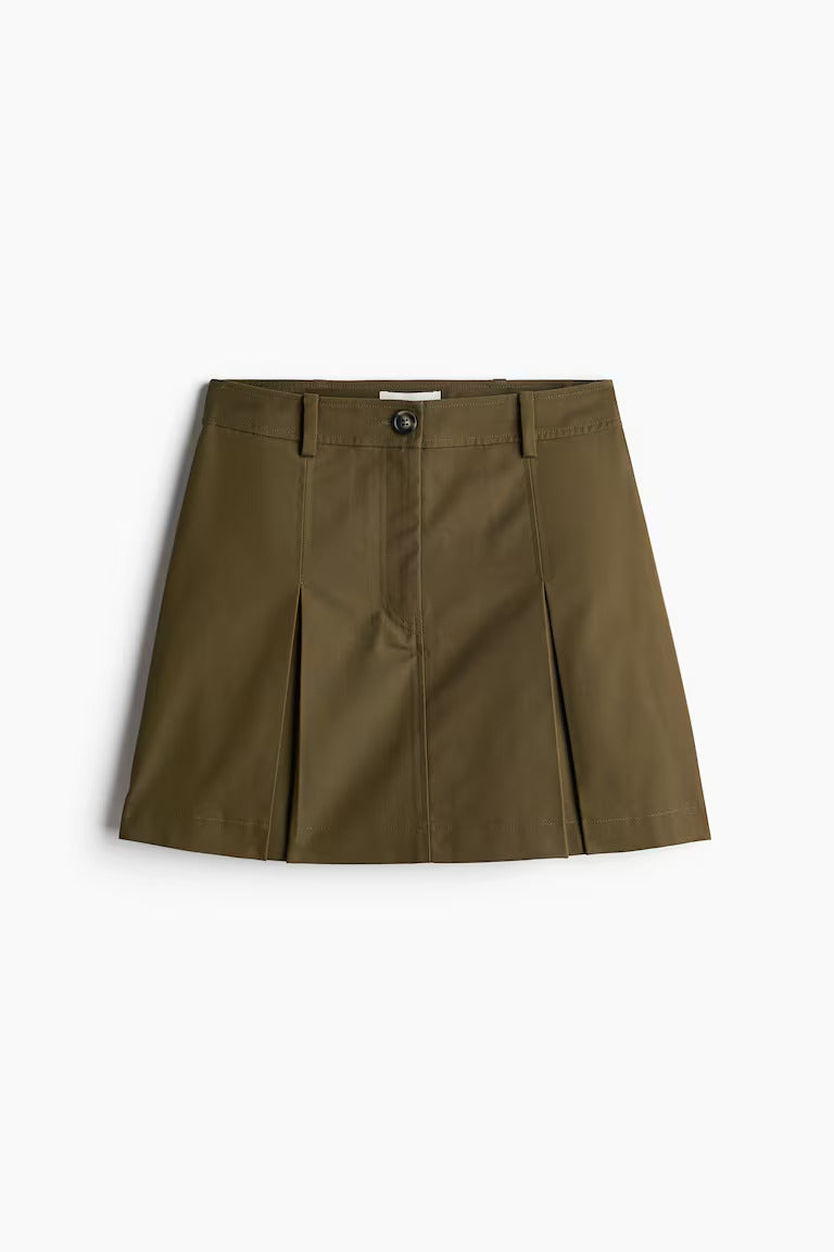 A-line mini skirt in thick twill. Regular waist, zip fly with button, and inverted box pleats below hip for added volume. Unlined.