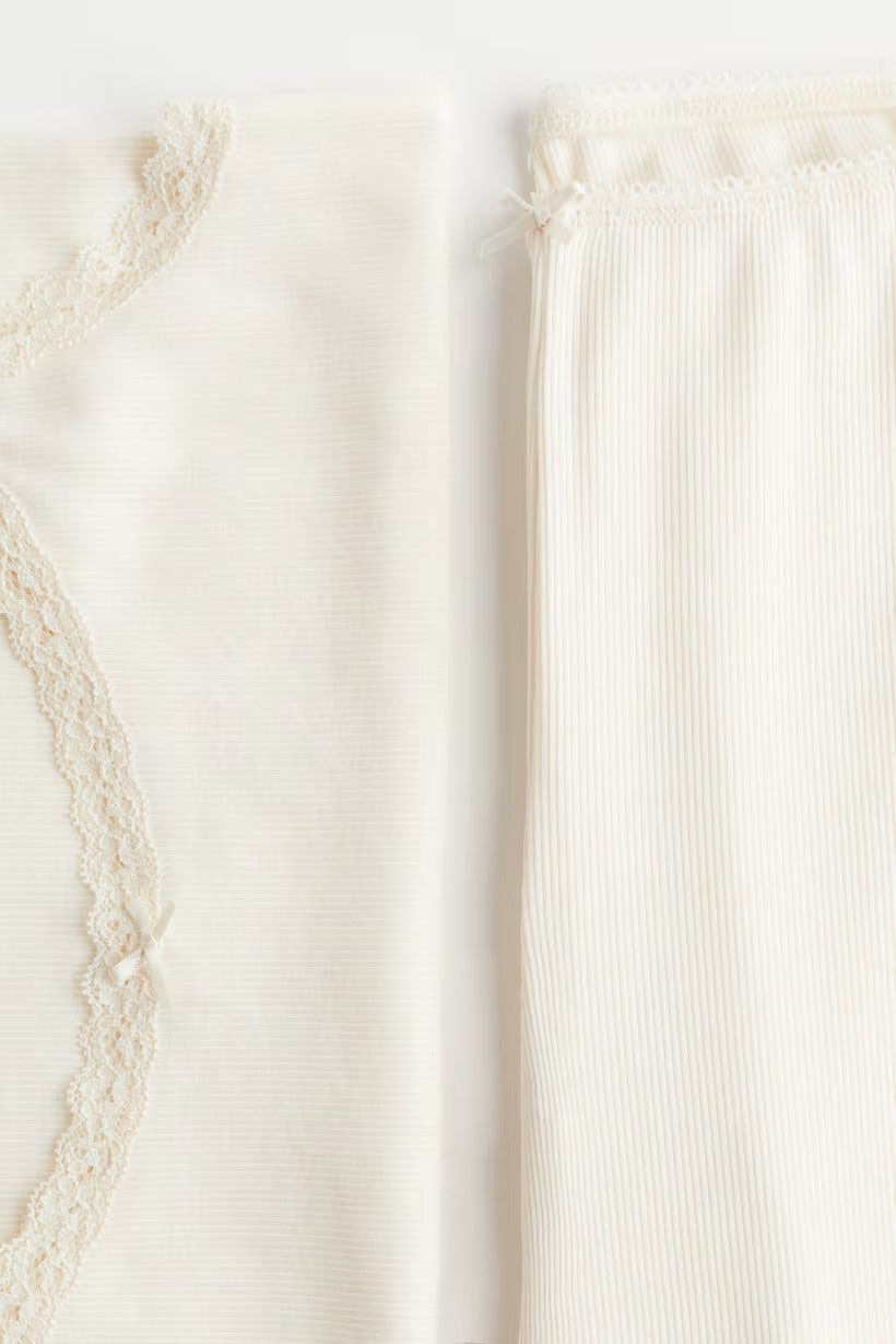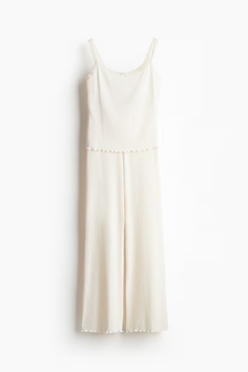 Pajamas in ribbed jersey with a tank top and pants. Top with lace trim at shoulder straps and neckline, and an overlocked hem. Pants with an elasticized, picot-trimmed waistband and overlocked hems.