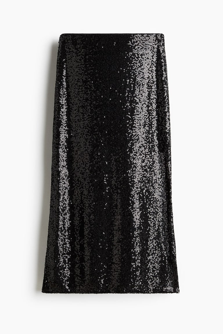 Calf-length skirt in sequined mesh. High waist, waistband with concealed elastic, and straight-cut hem with a slit at one side. Mini liner skirt in jersey.