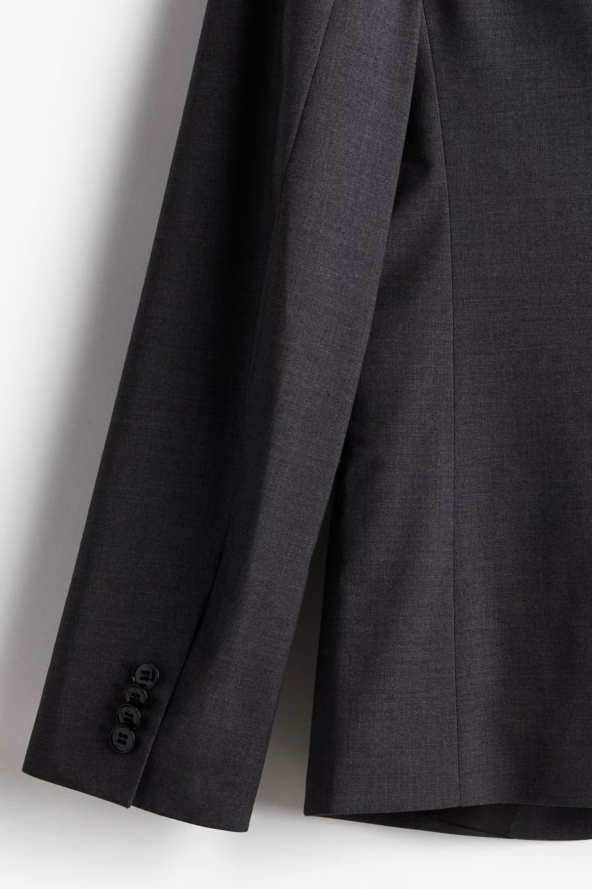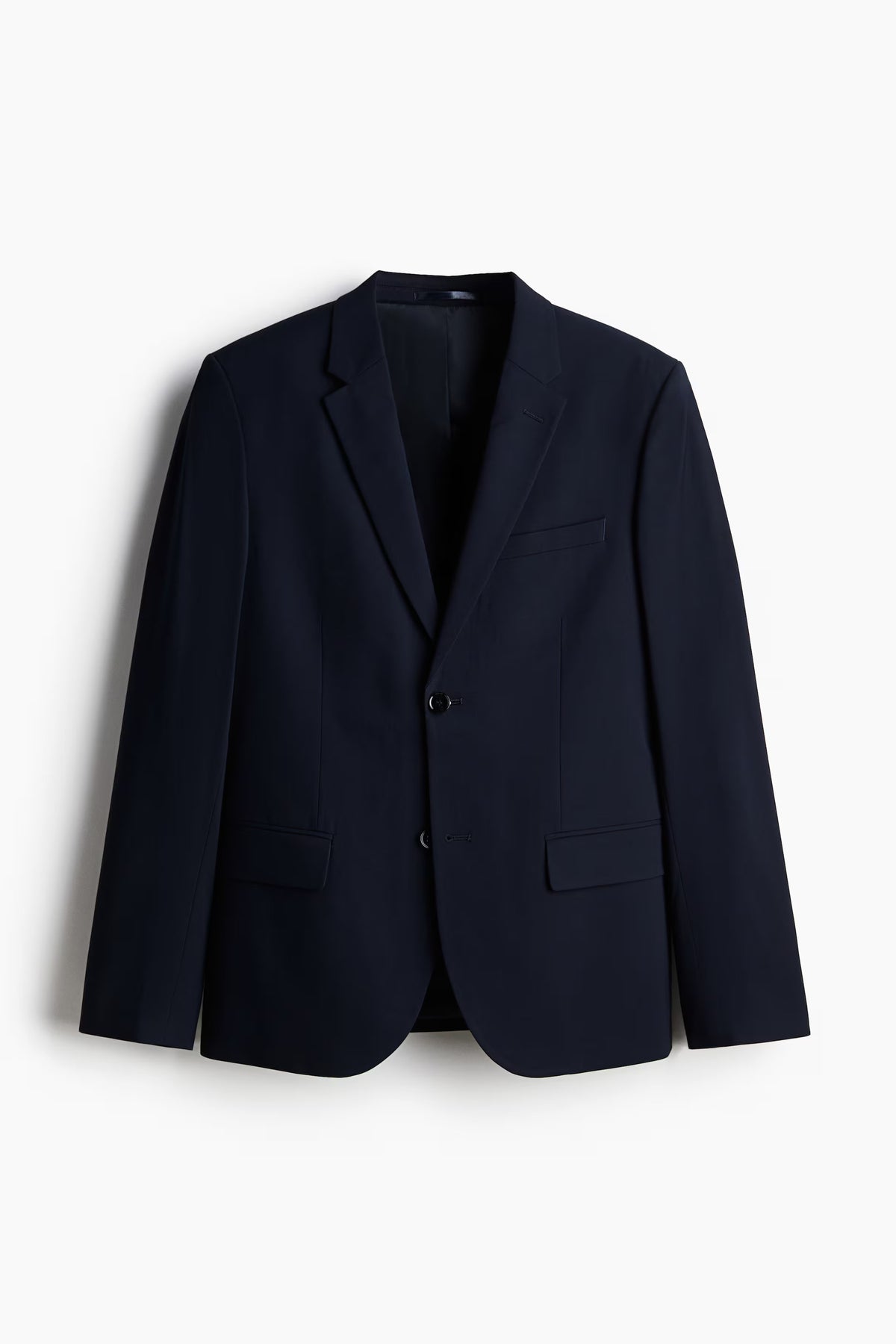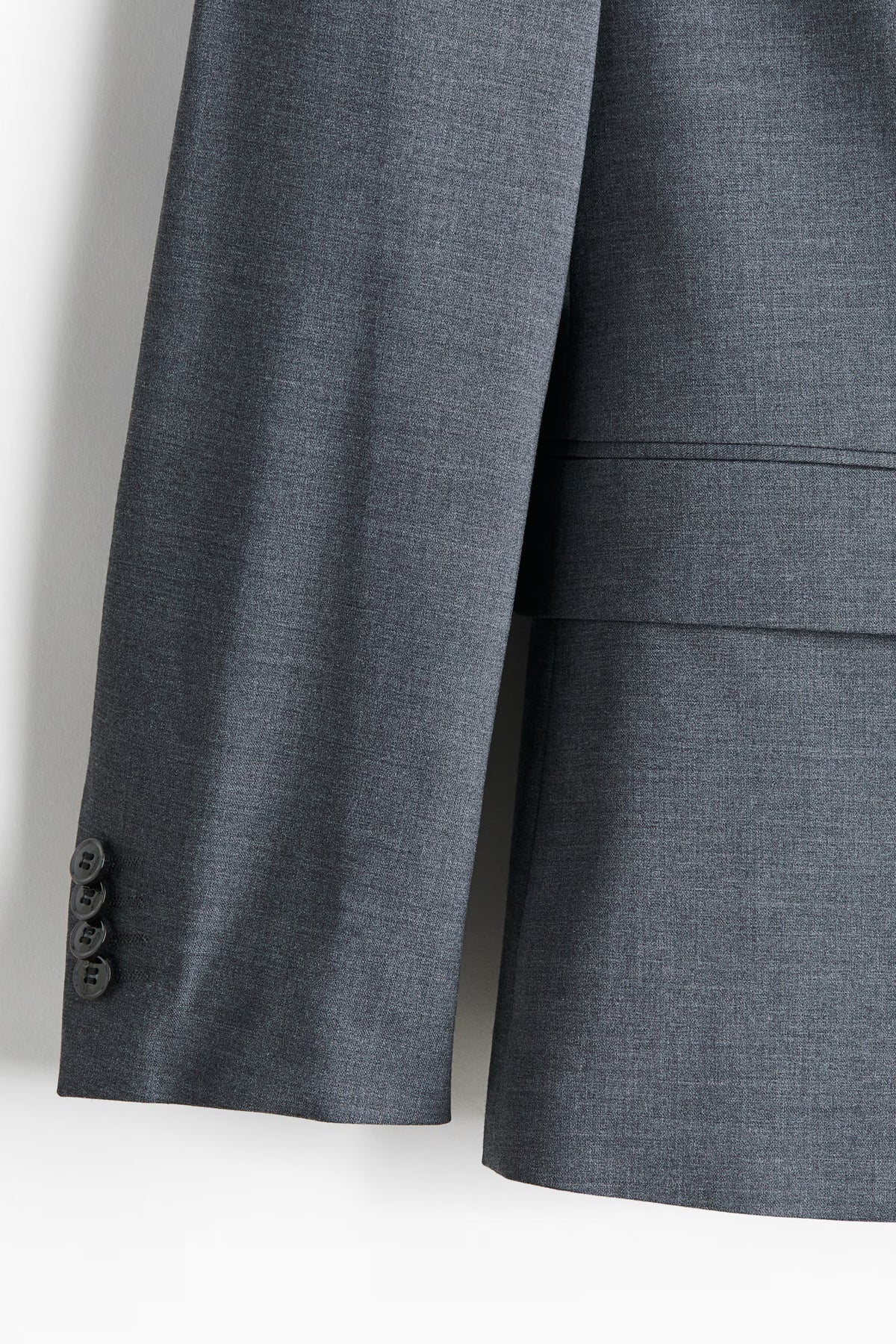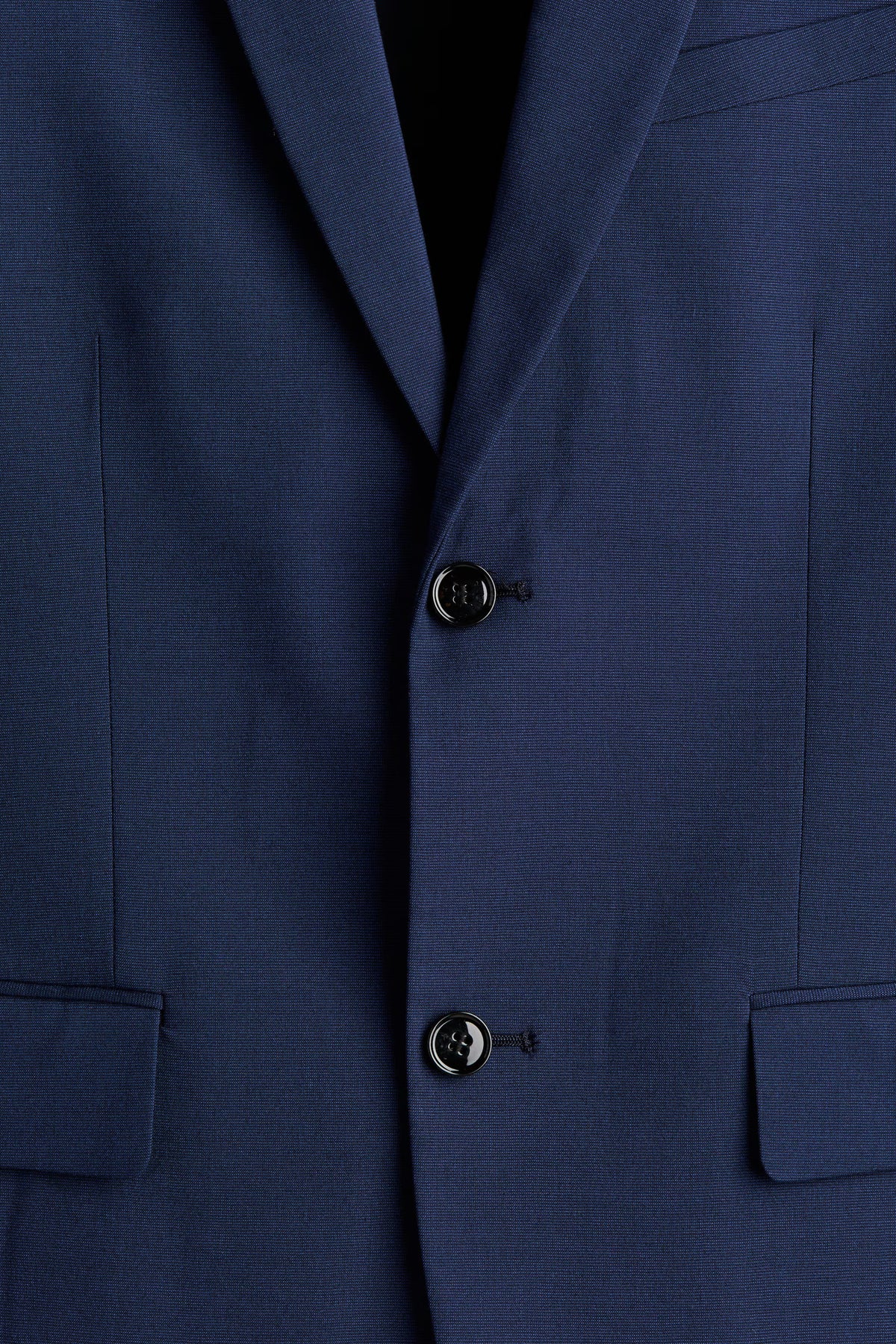 Skinny-fit, single-breasted jacket in soft, woven fabric with a fitted silhouette. Narrow, notched lapels, a chest pocket, front pockets with flap, and an inner pocket. Decorative buttons at cuffs and a vent at back. Lined.