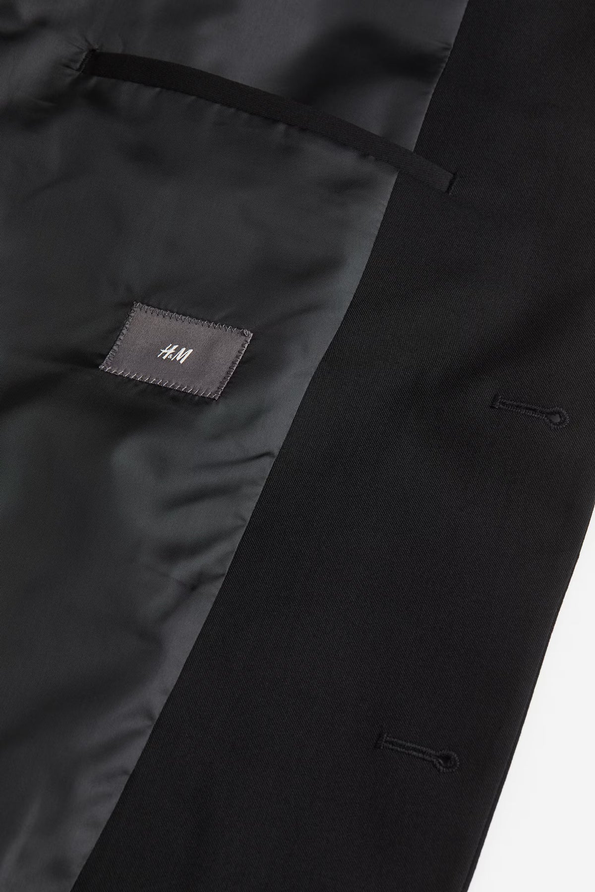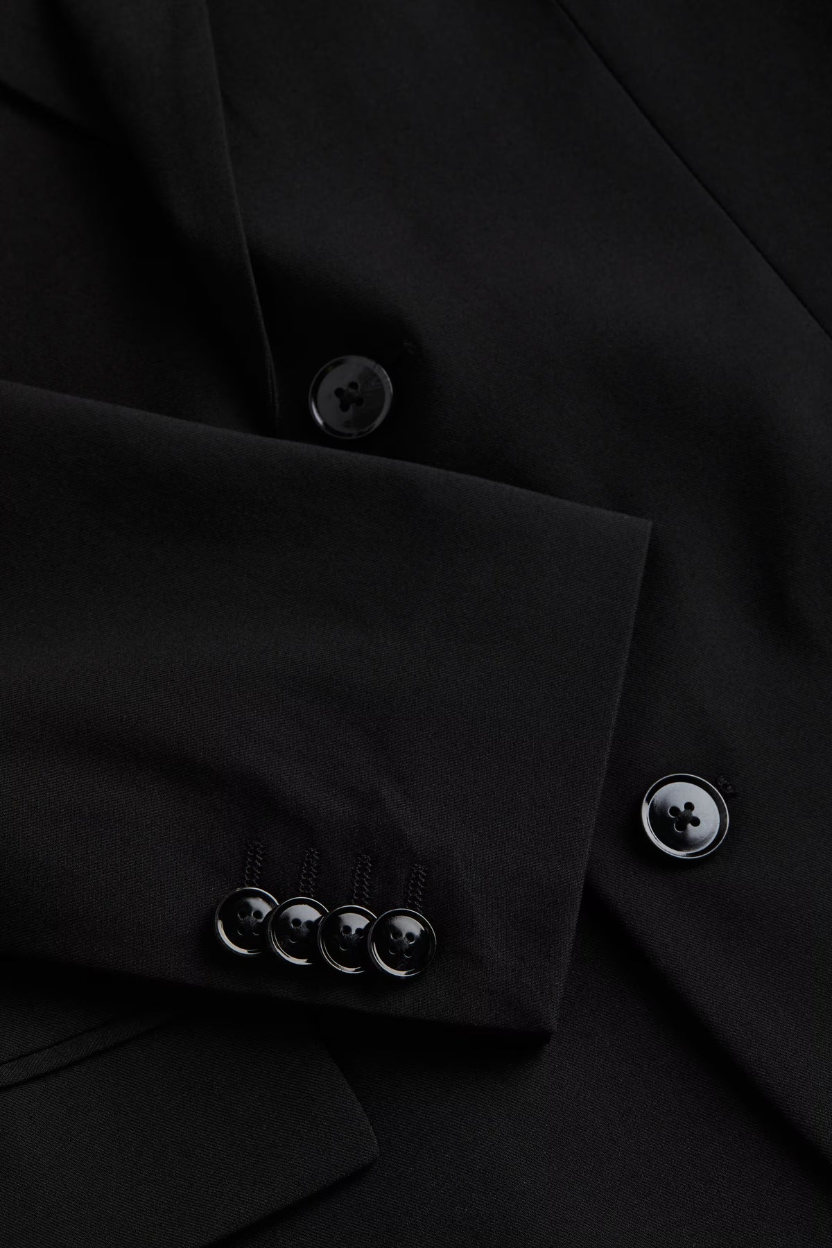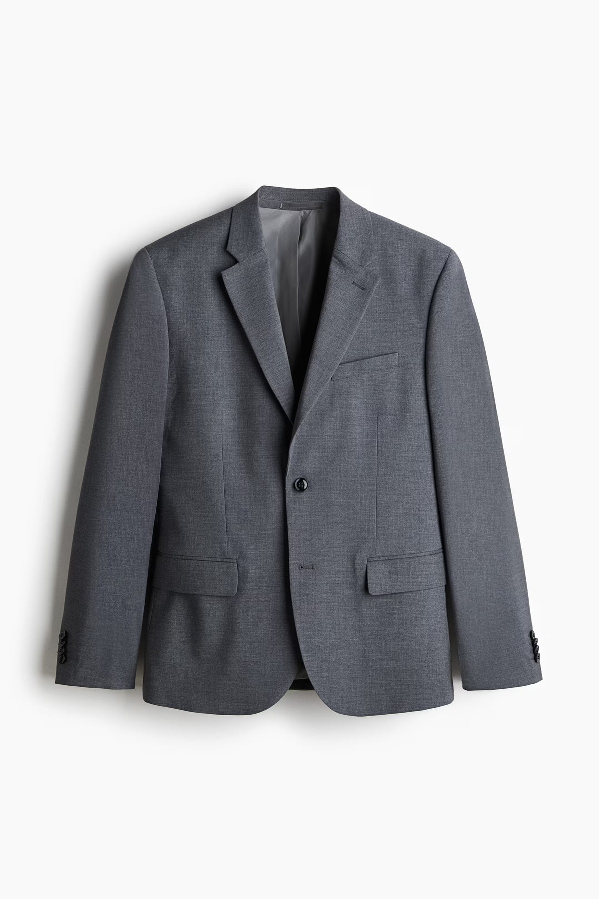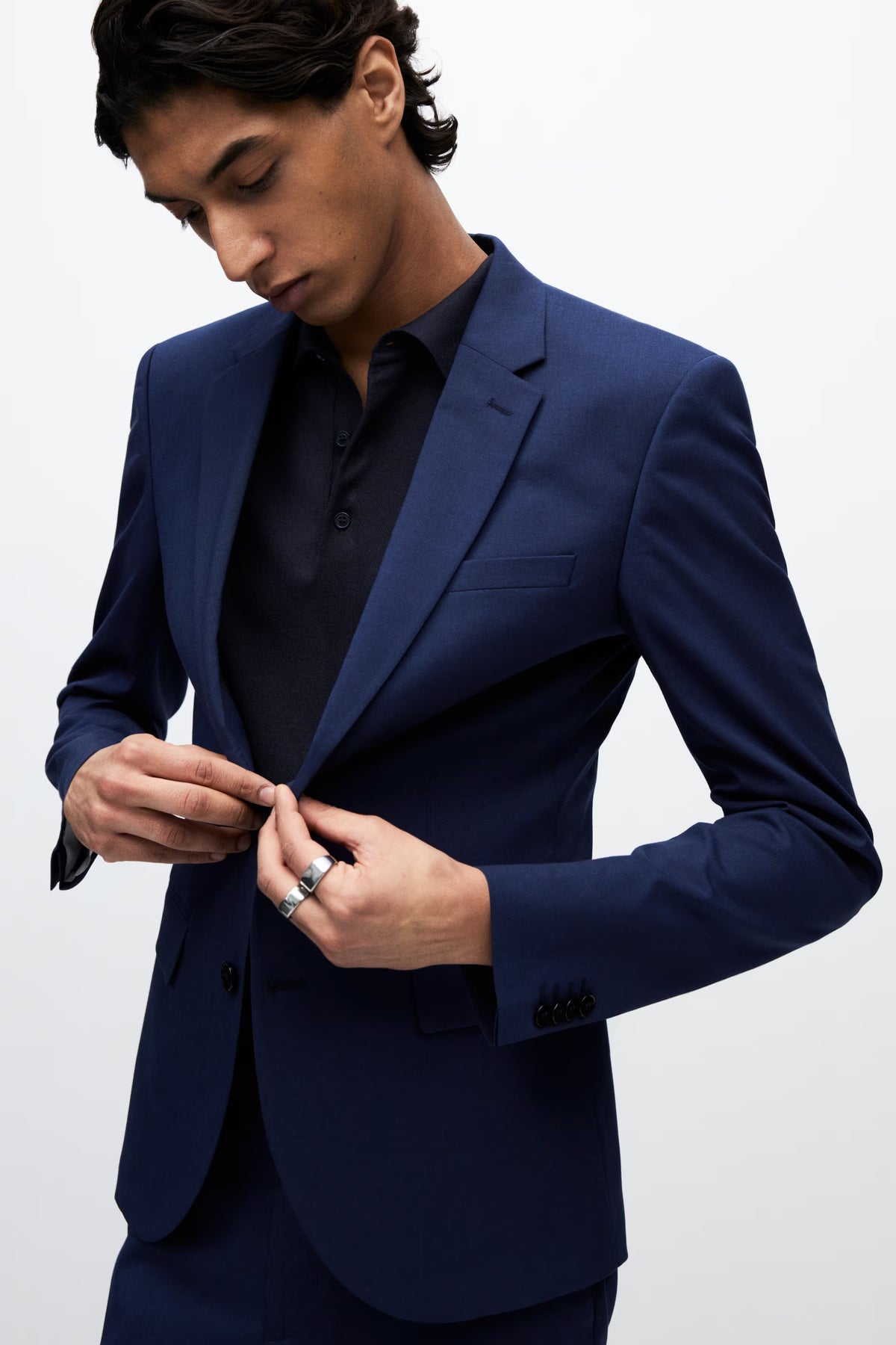 Skinny-fit, single-breasted jacket in soft, woven fabric with a fitted silhouette. Narrow, notched lapels, a chest pocket, front pockets with flap, and an inner pocket. Decorative buttons at cuffs and a vent at back. Lined.