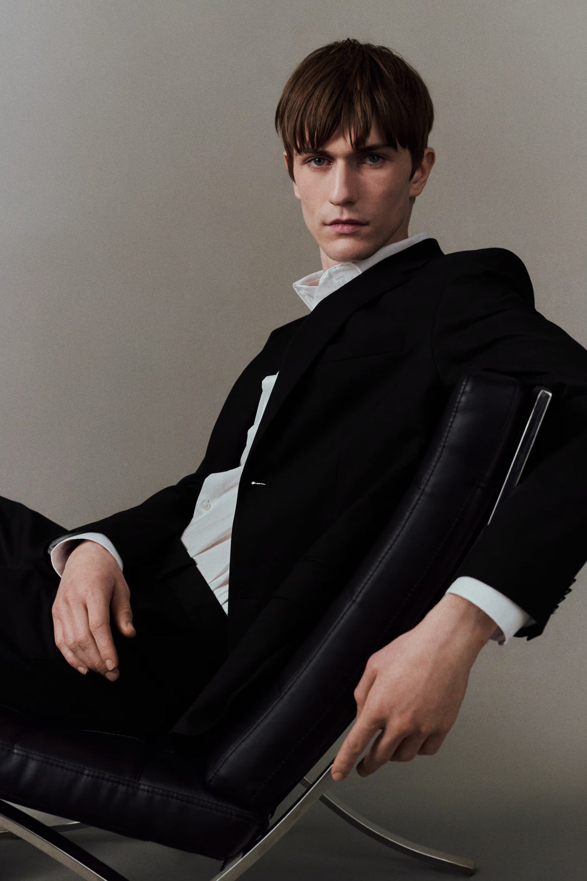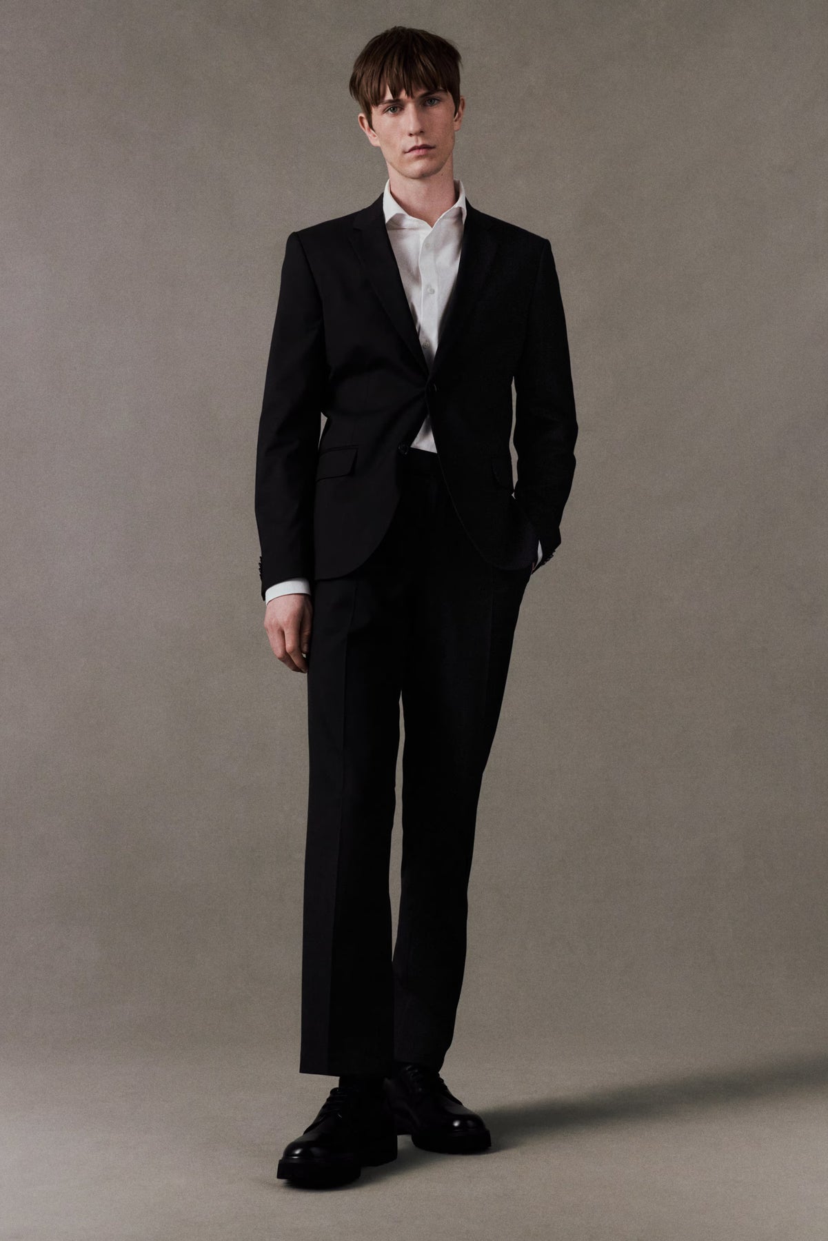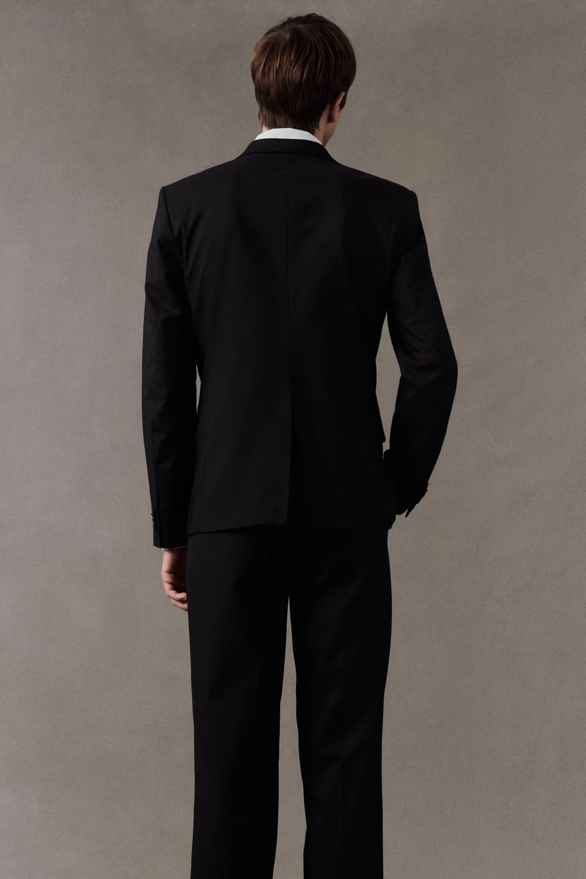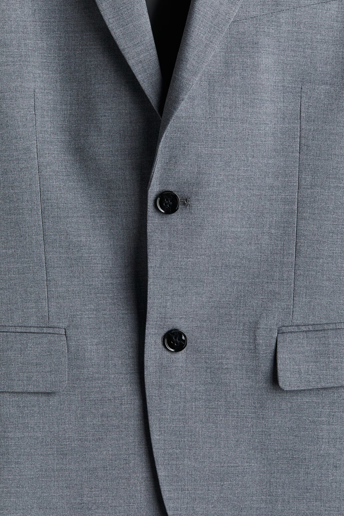 Skinny-fit, single-breasted jacket in soft, woven fabric with a fitted silhouette. Narrow, notched lapels, a chest pocket, front pockets with flap, and an inner pocket. Decorative buttons at cuffs and a vent at back. Lined.