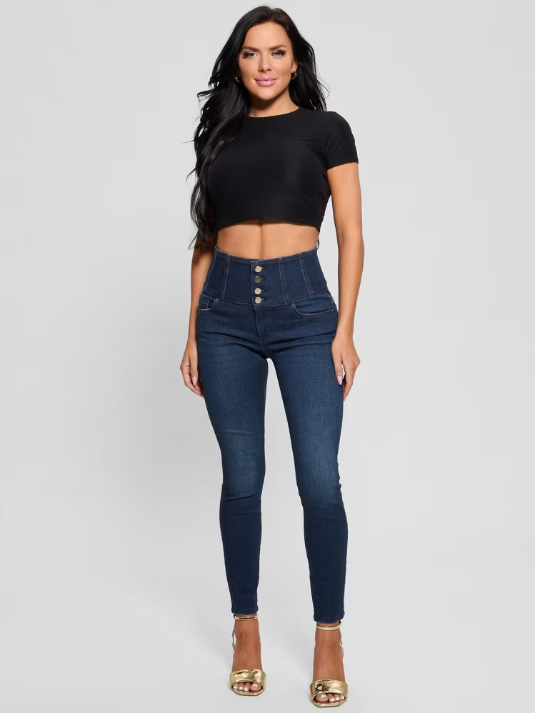 - Super high-rise, sits at natural waist. Skinny fit and ankle length.