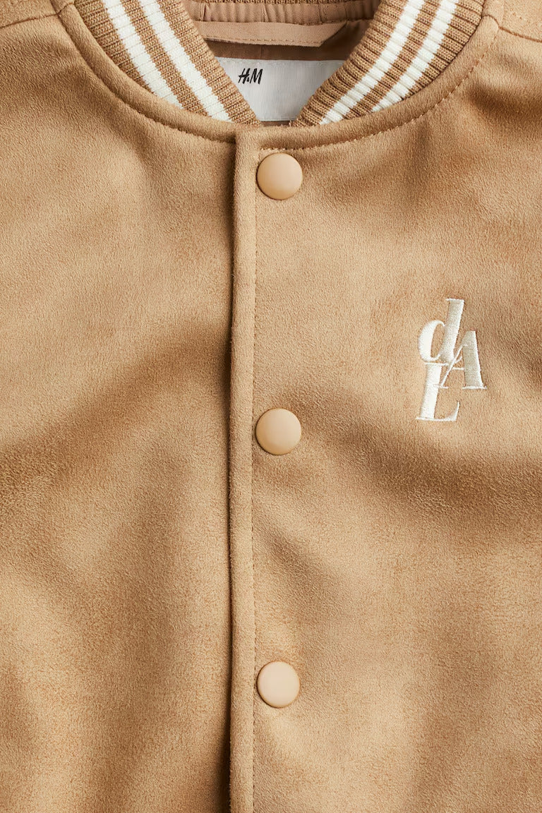 Baseball jacket in napped fabric with an embroidered text motif. Ribbed stand-up collar, snap fasteners at front, dropped shoulders, and welt side pockets. Ribbing at cuffs and hem. Lined.