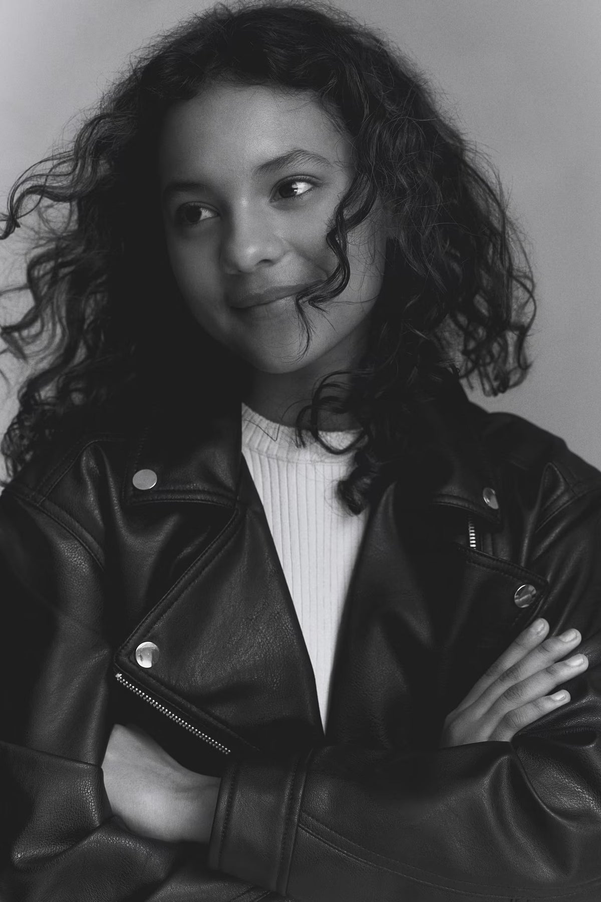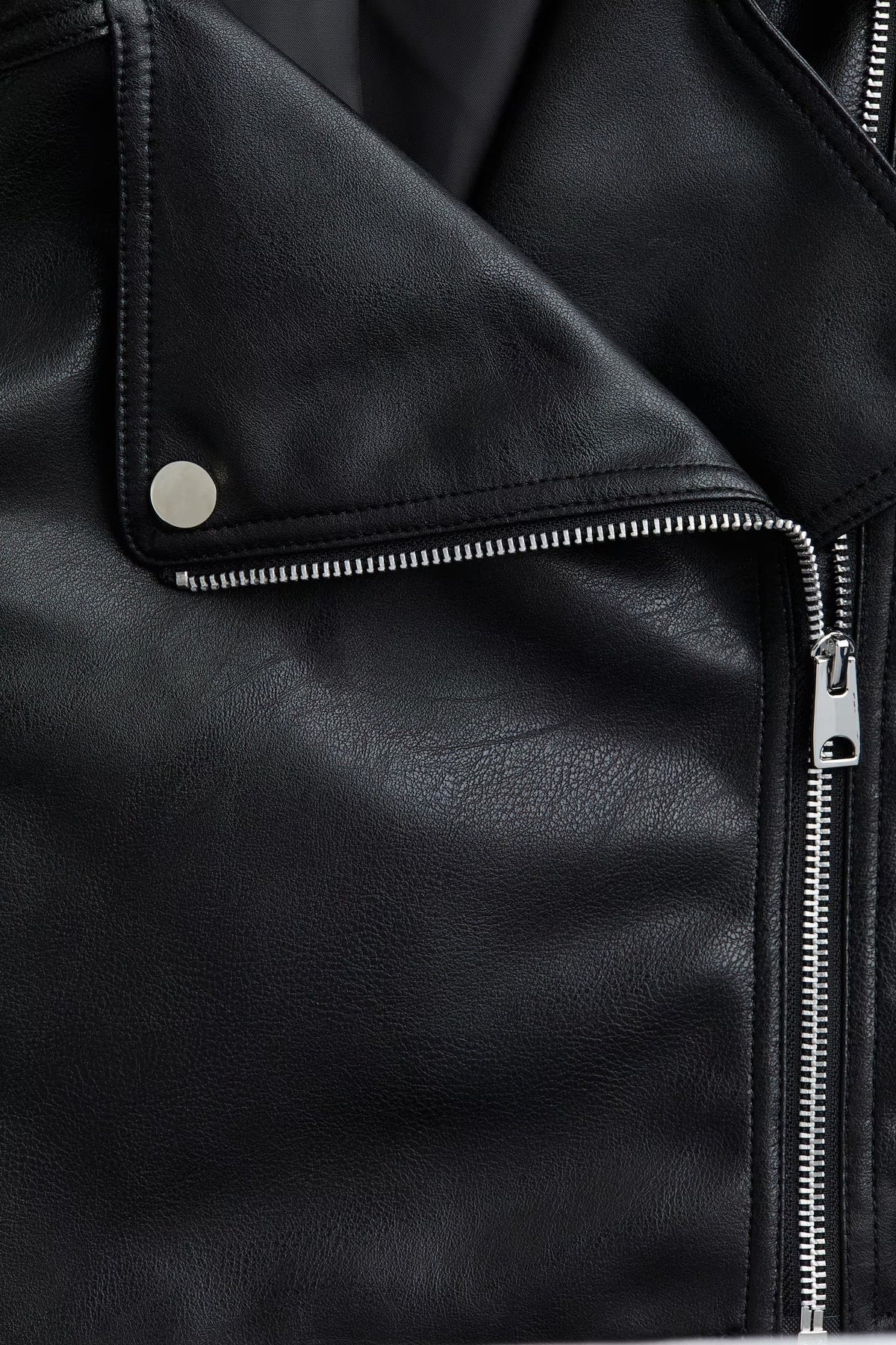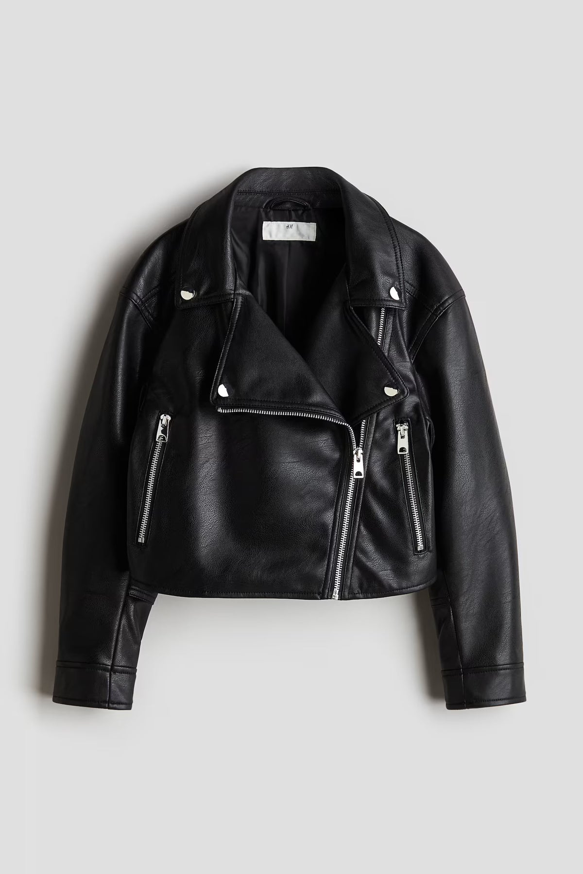 Biker jacket in coated fabric. Notched lapels with decorative snap fasteners, diagonal zipper at front, and front pockets with zipper. Lined.