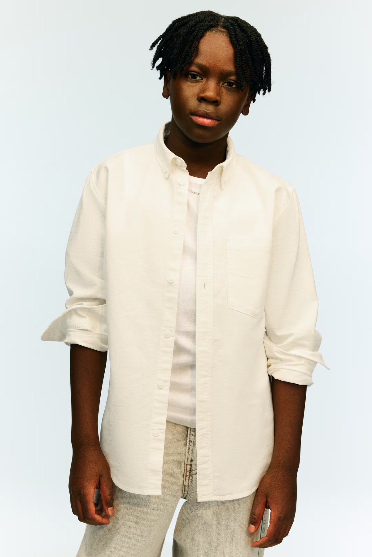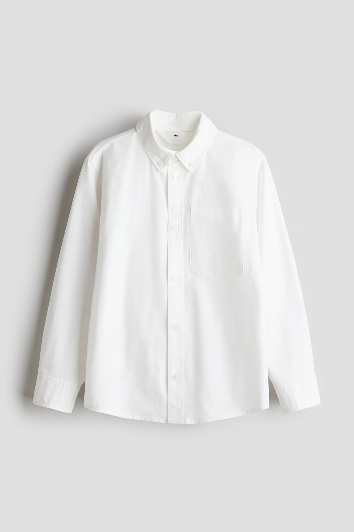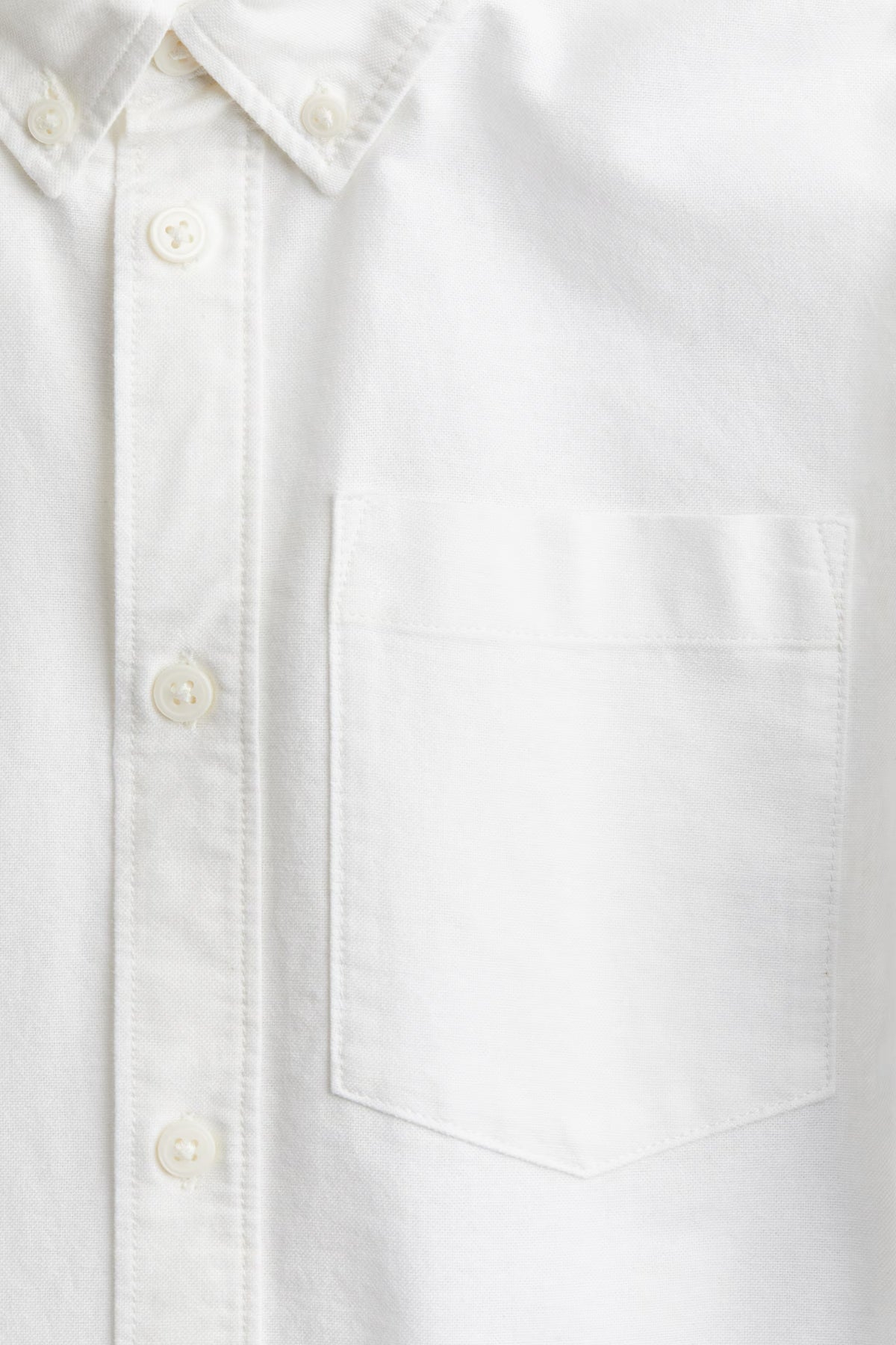 Shirt in soft woven cotton fabric. Button-down collar, buttons at front and at cuffs, and an open chest pocket. Slightly rounded hem.