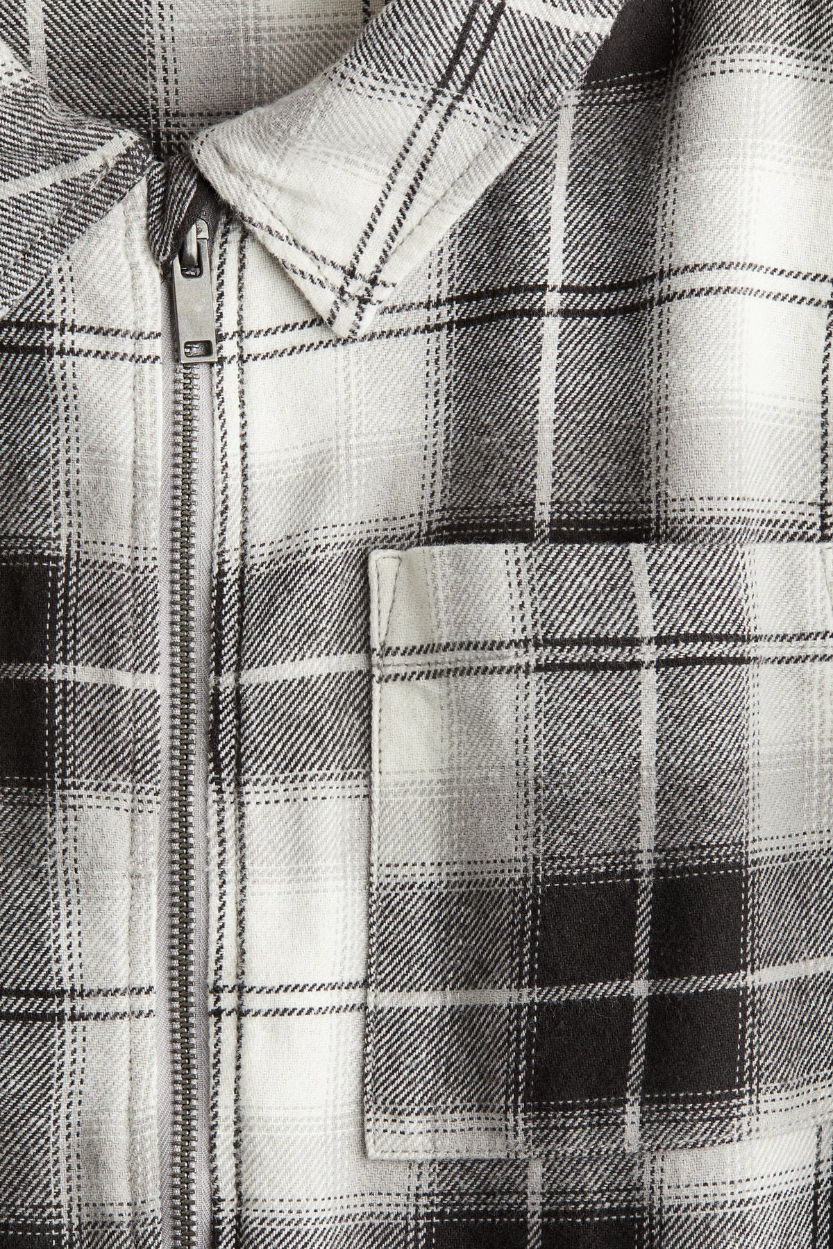 Overshirt in soft flannel. Collar, zipper at front, and patch chest pockets. Long sleeves with button at cuffs.