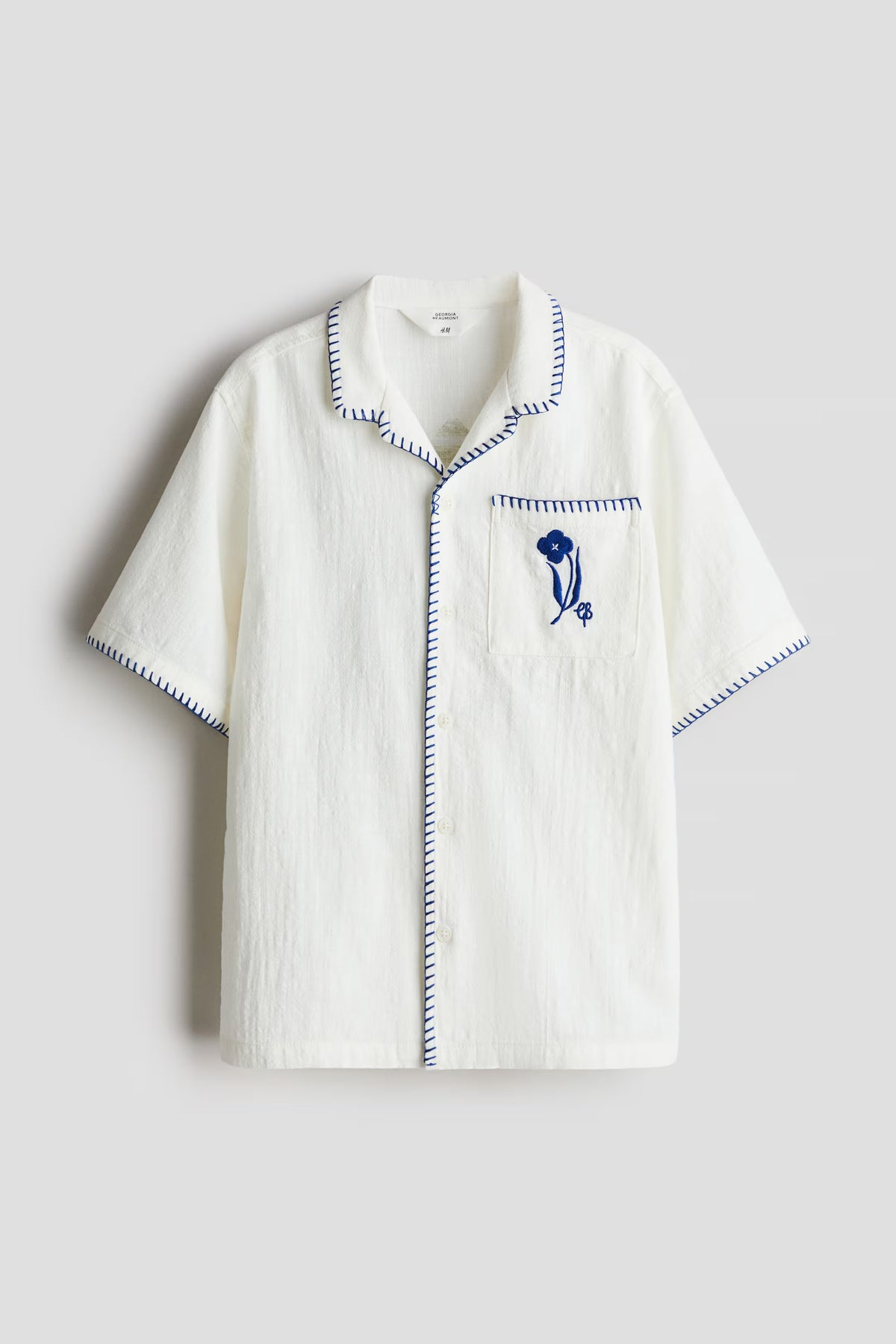 H&M x Georgia Beaumont. Shirt in soft woven cotton with decorative stitching at edges and a printed motif at back. Resort collar, buttons at front, and an open chest pocket with an embroidered motif. Short sleeves.