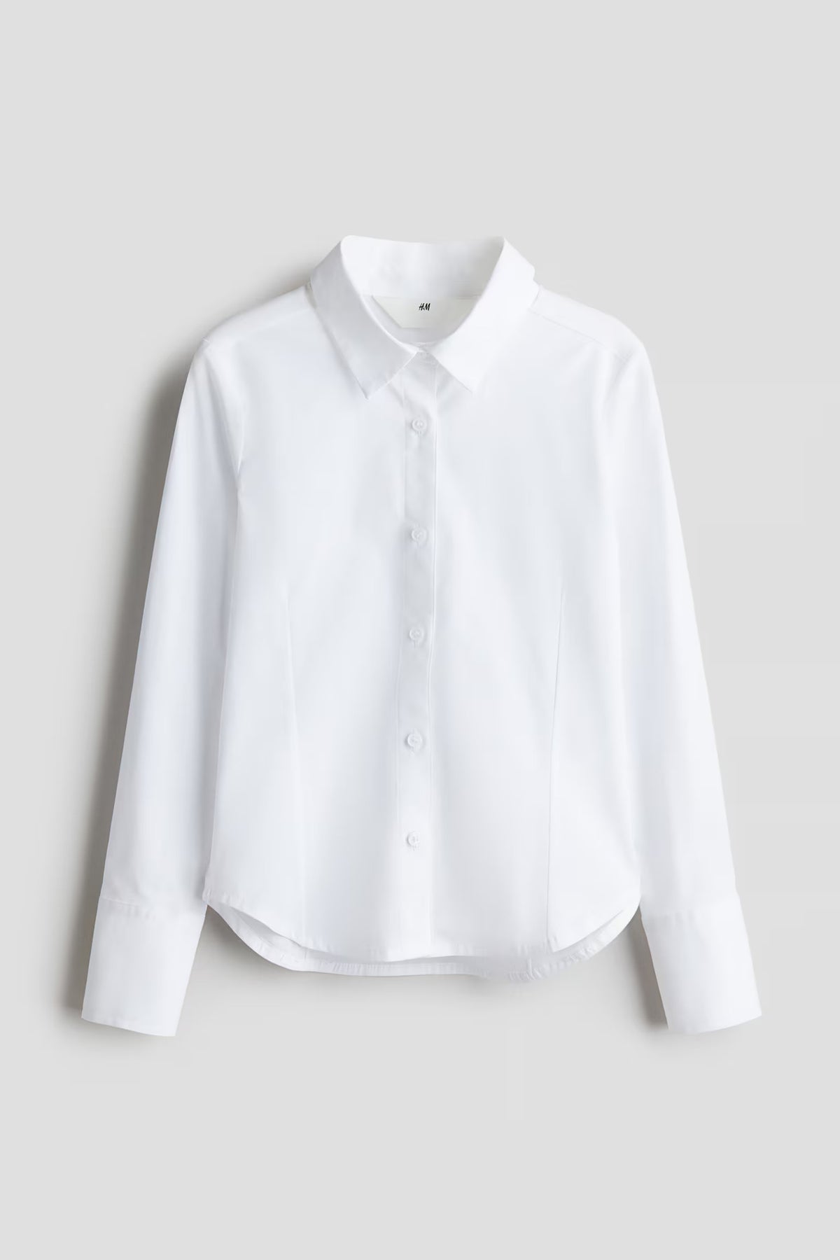 Shirt in stretchy woven cotton with darts at front and back for a tailored fit. Turn-down collar, buttons at front, long sleeves, and wide cuffs with button. Rounded hem.