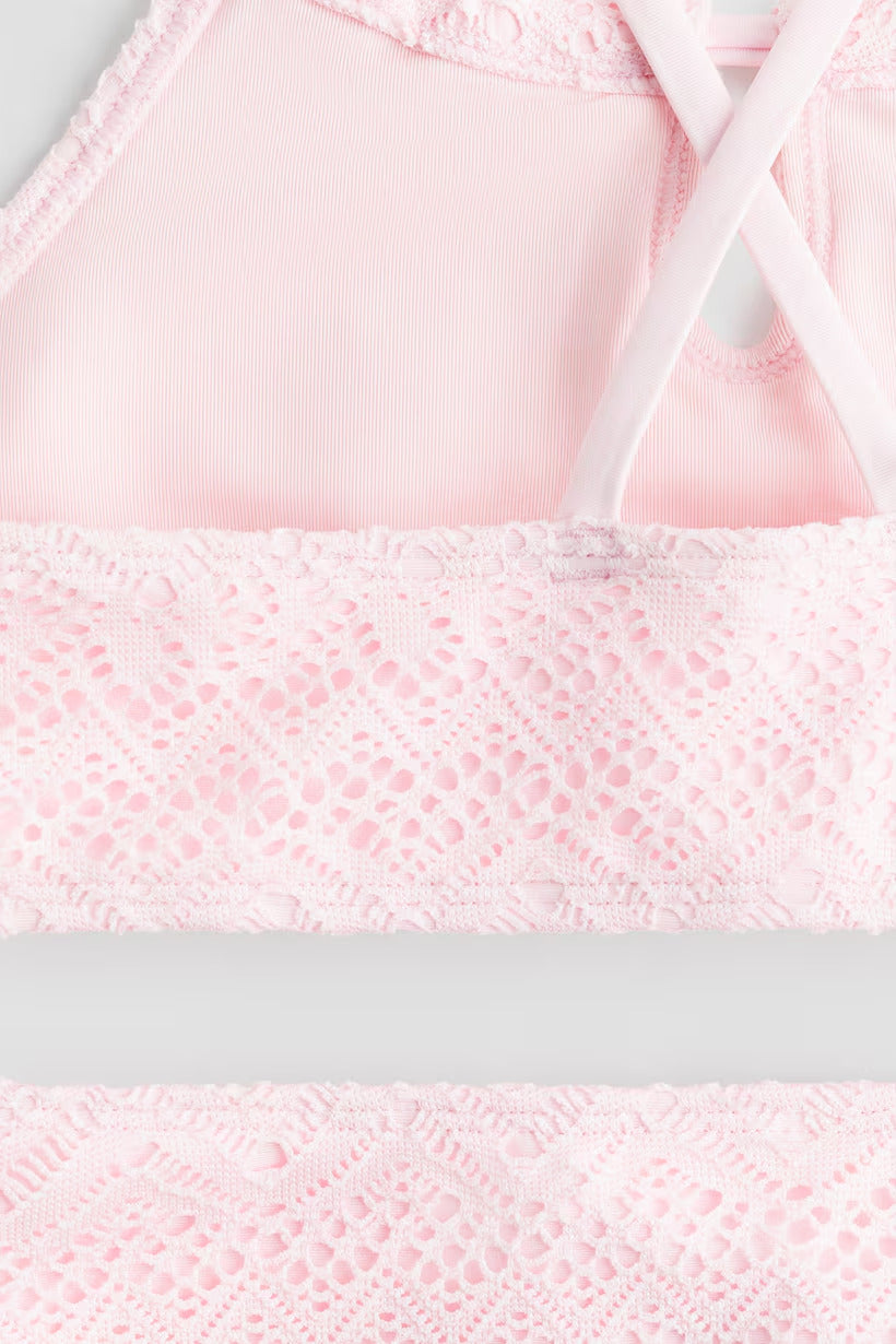 Fully lined, crochet-look two-piece swimsuit with a narrow-cut top. Narrow shoulder straps crossed at back and a round neckline at front with keyhole opening.