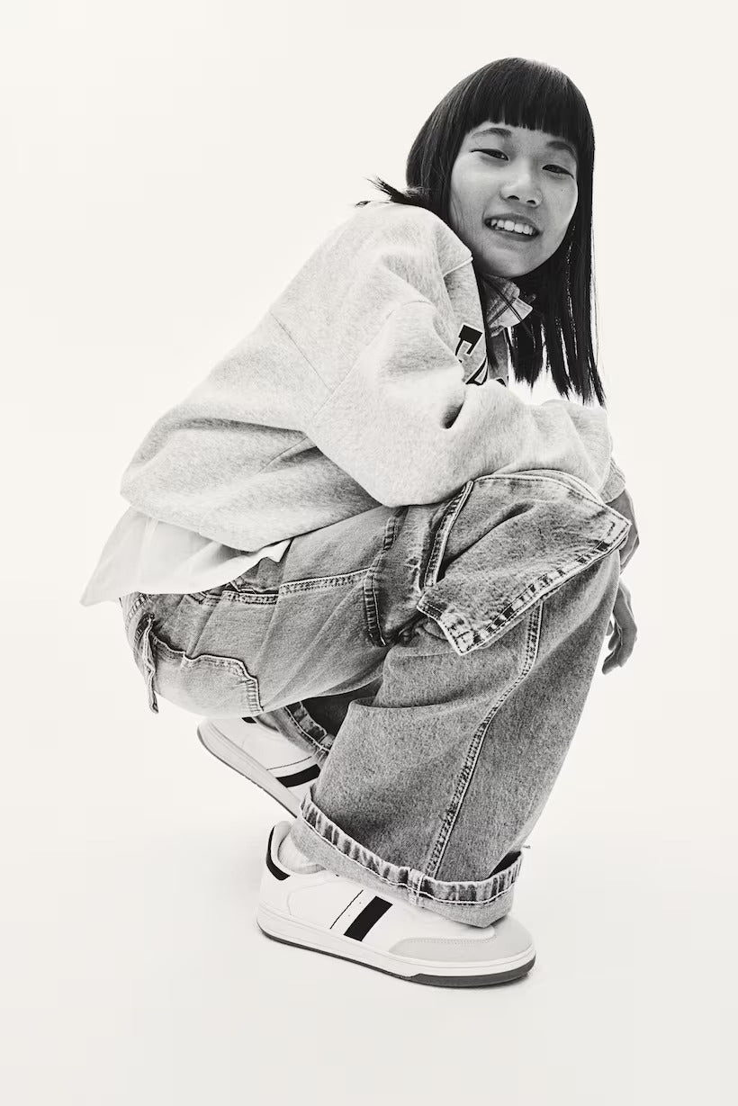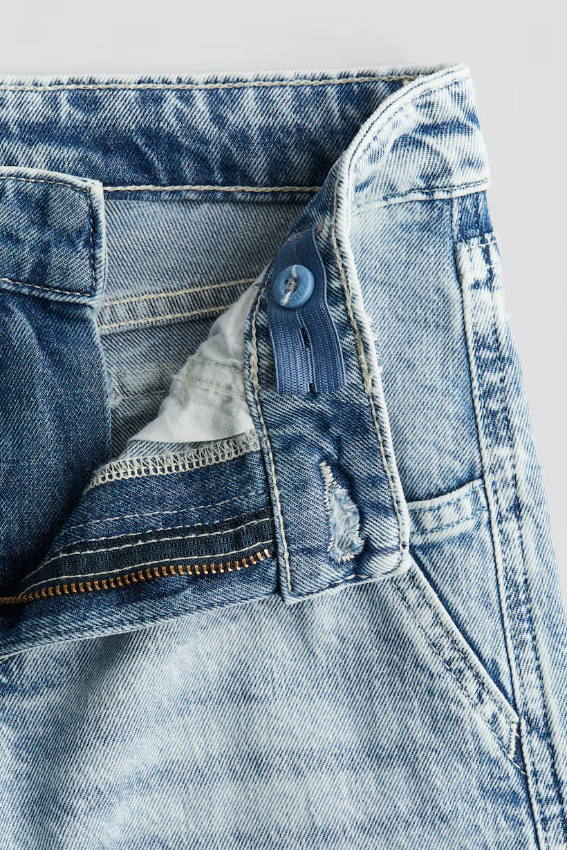 Cargo-style pants in stretchy cotton denim. Low waist, adjustable, elasticized waistband, and zip fly with button. Front pockets, back pockets, and leg pockets with flap. Wide legs.