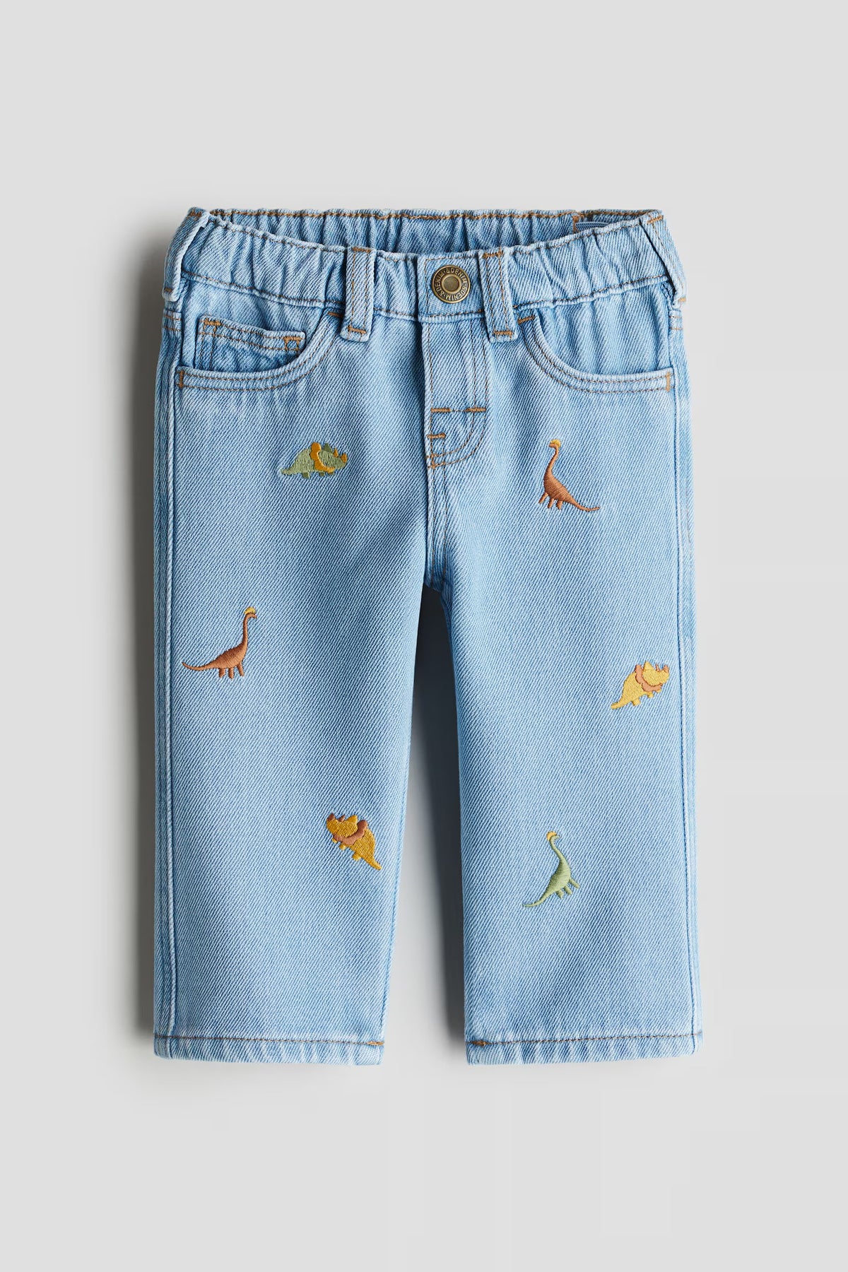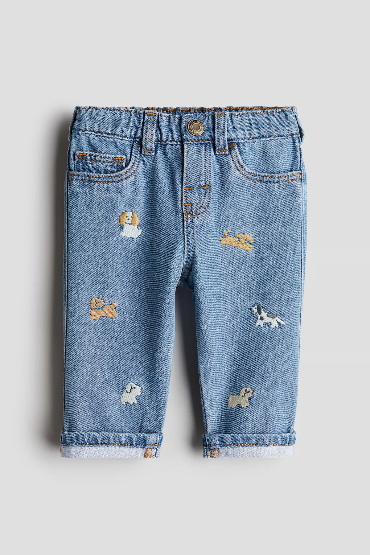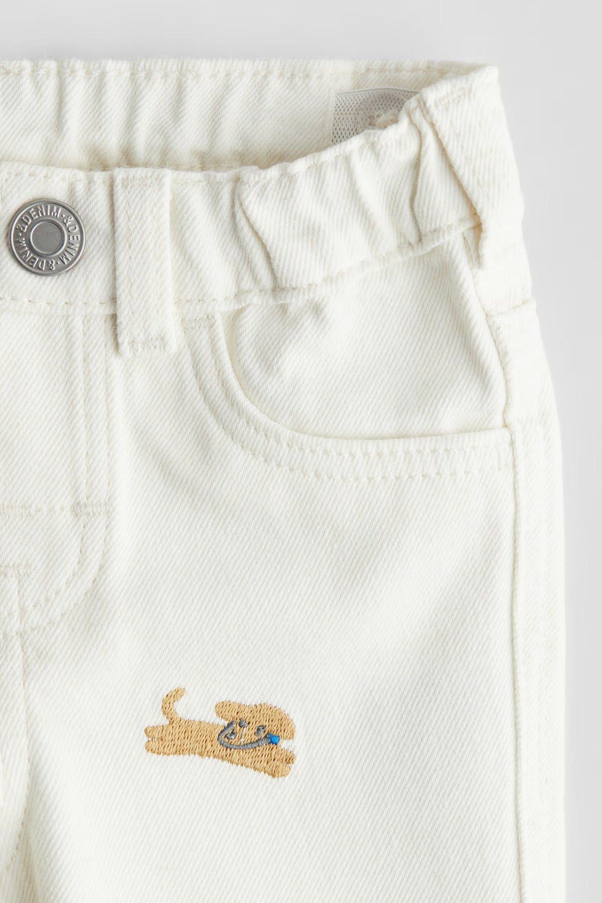 Jeans in soft denim with embroidered details at front. Adjustable, elasticized waistband, mock fly with snap fastener, decorative front pockets, and open back pockets.