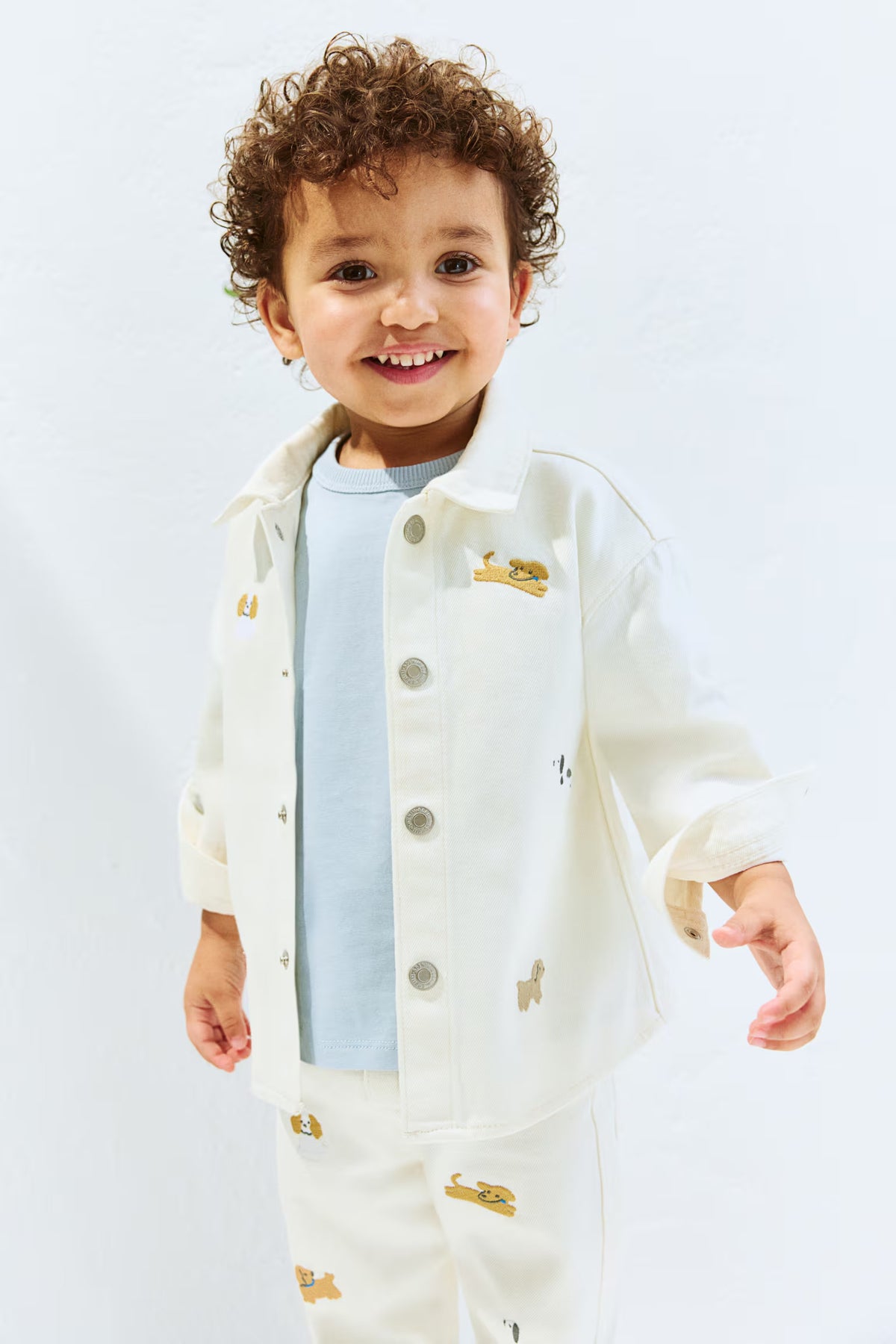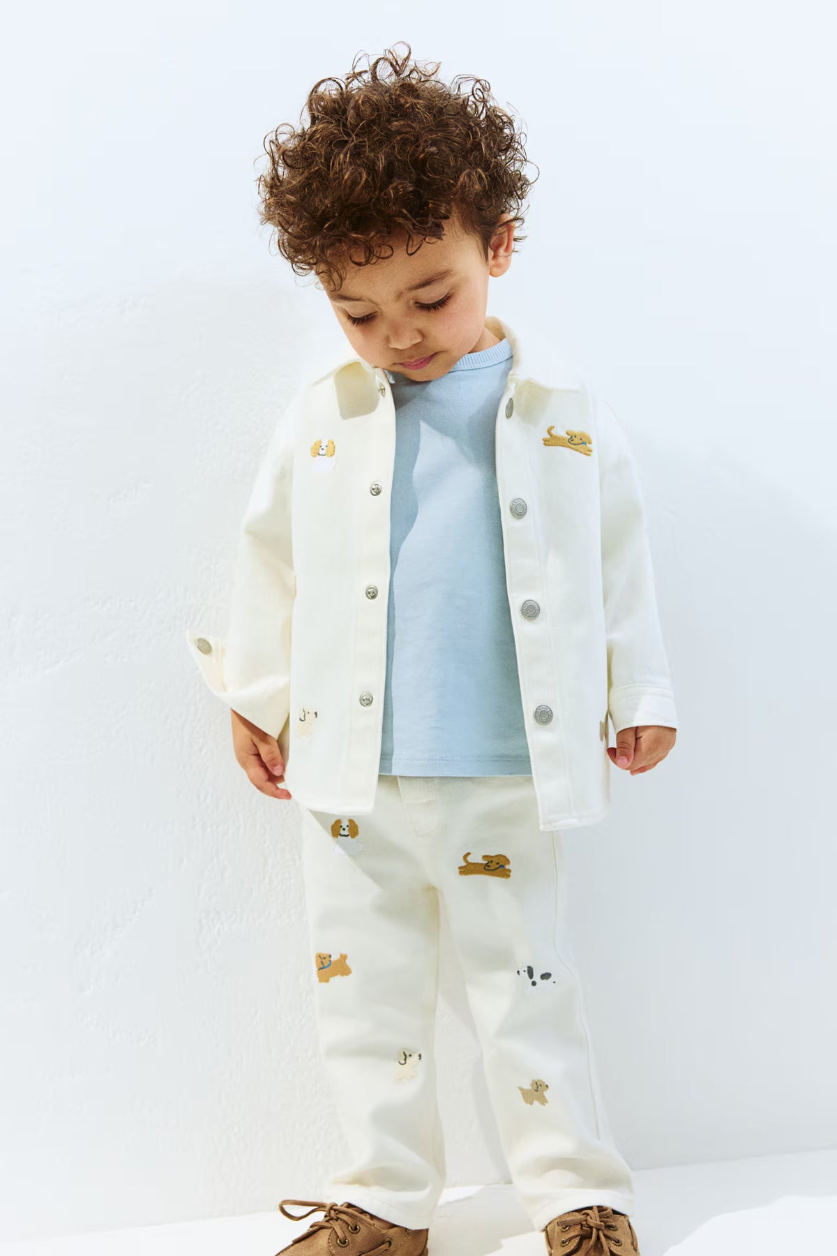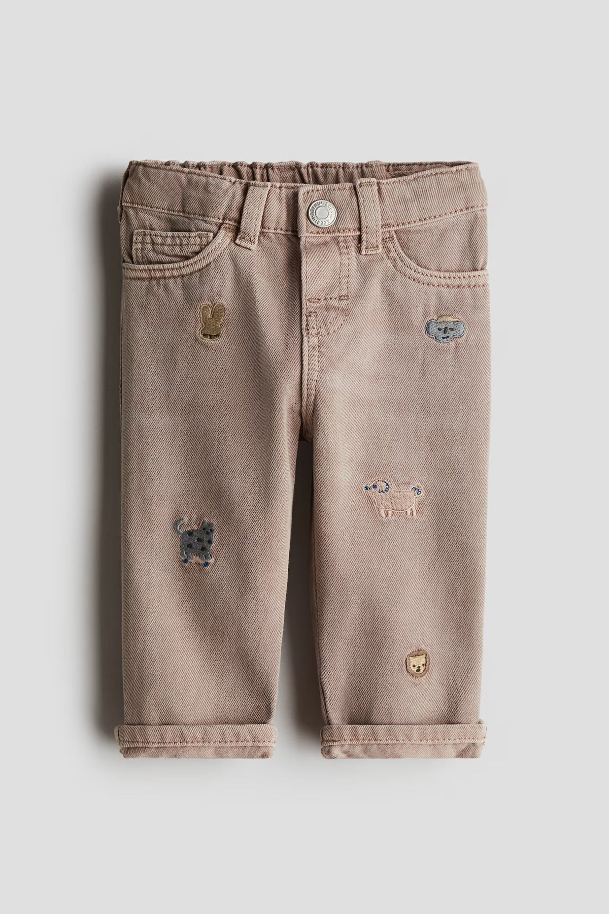 Jeans in soft denim with embroidered details at front. Adjustable, elasticized waistband, mock fly with snap fastener, decorative front pockets, and open back pockets.