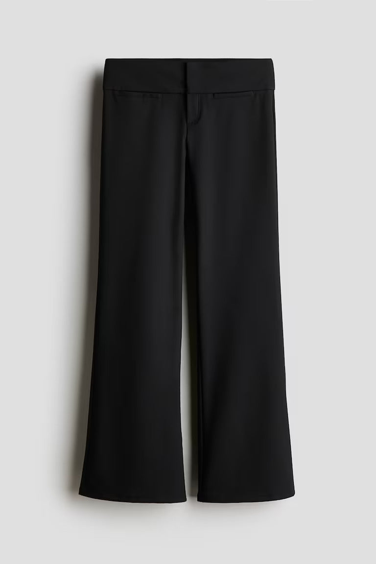 Pants in soft, stretchy twill. Low waist, adjustable elastic at waistband, zip fly with concealed hook-and-bar fasteners, and mock pockets. Flared legs.