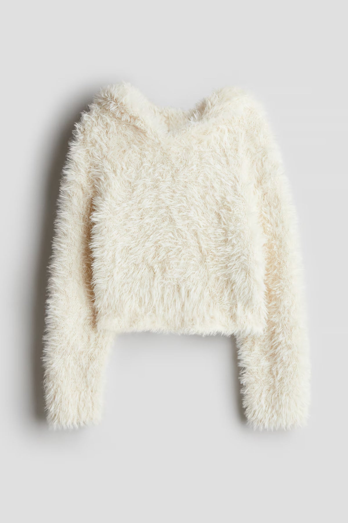 Loose-fit, cropped hoodie in a fluffy knit with dropped shoulders and long sleeves.
