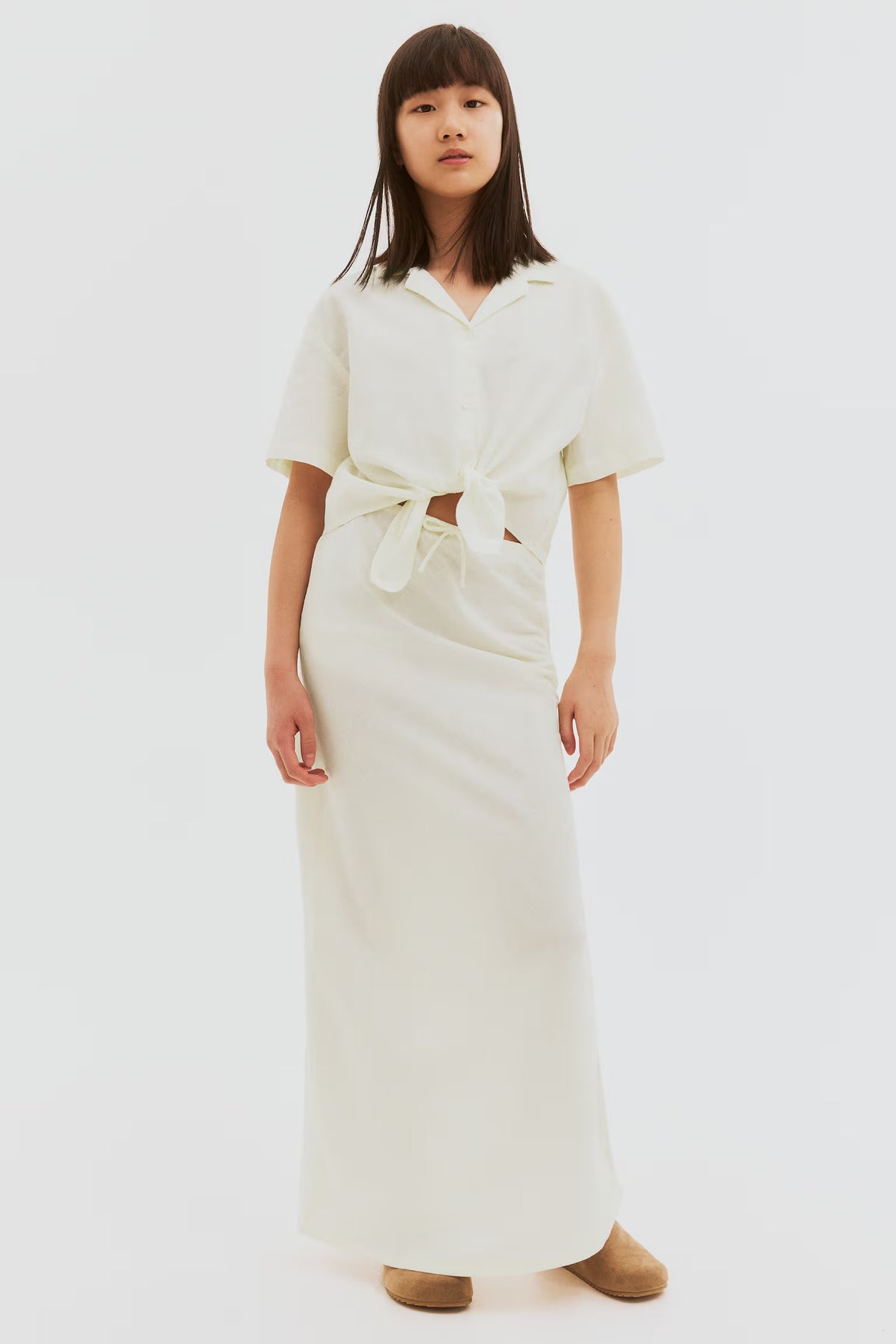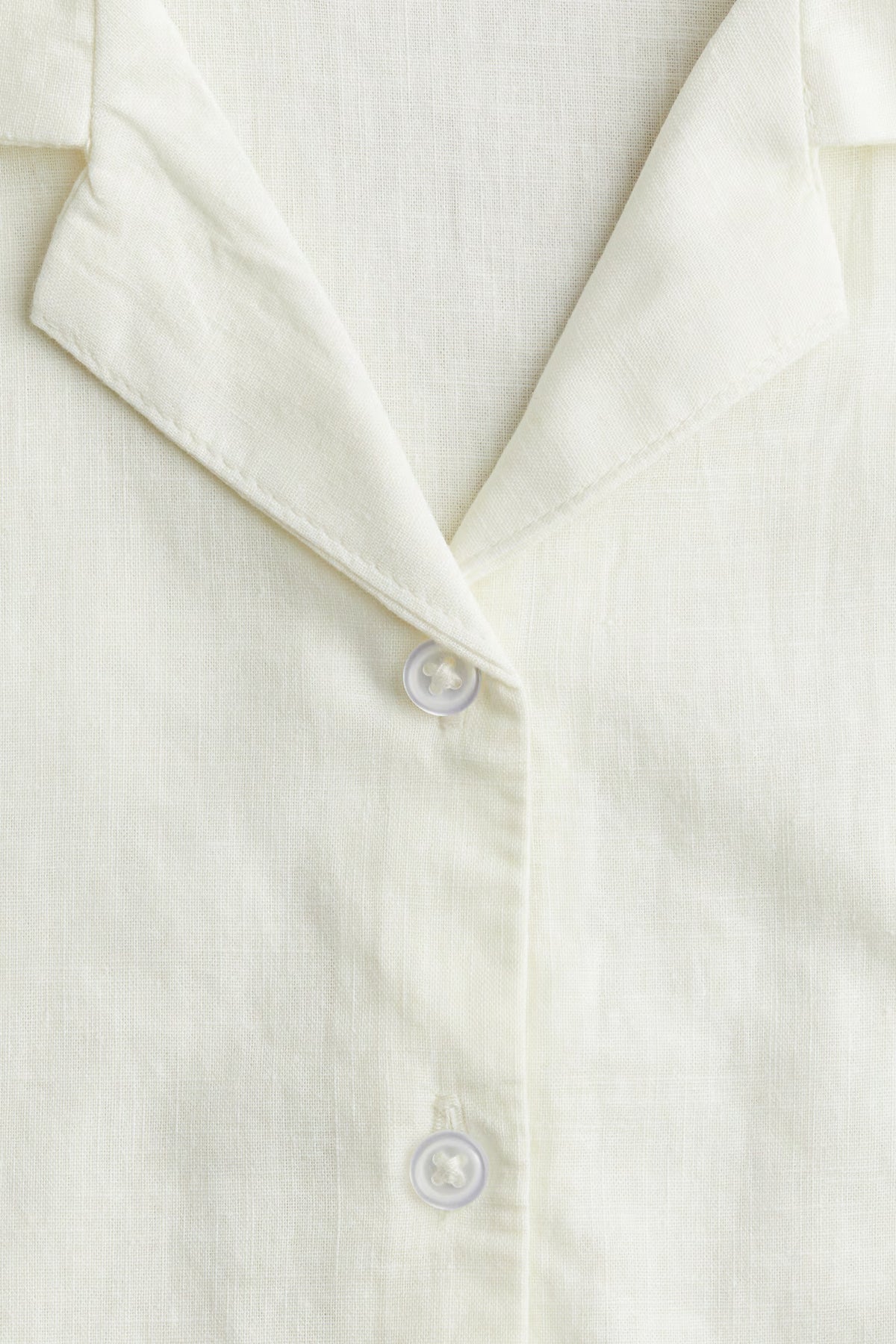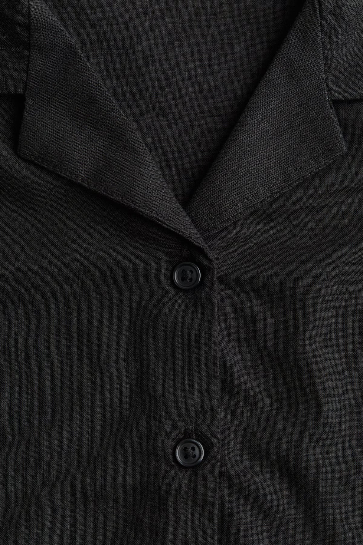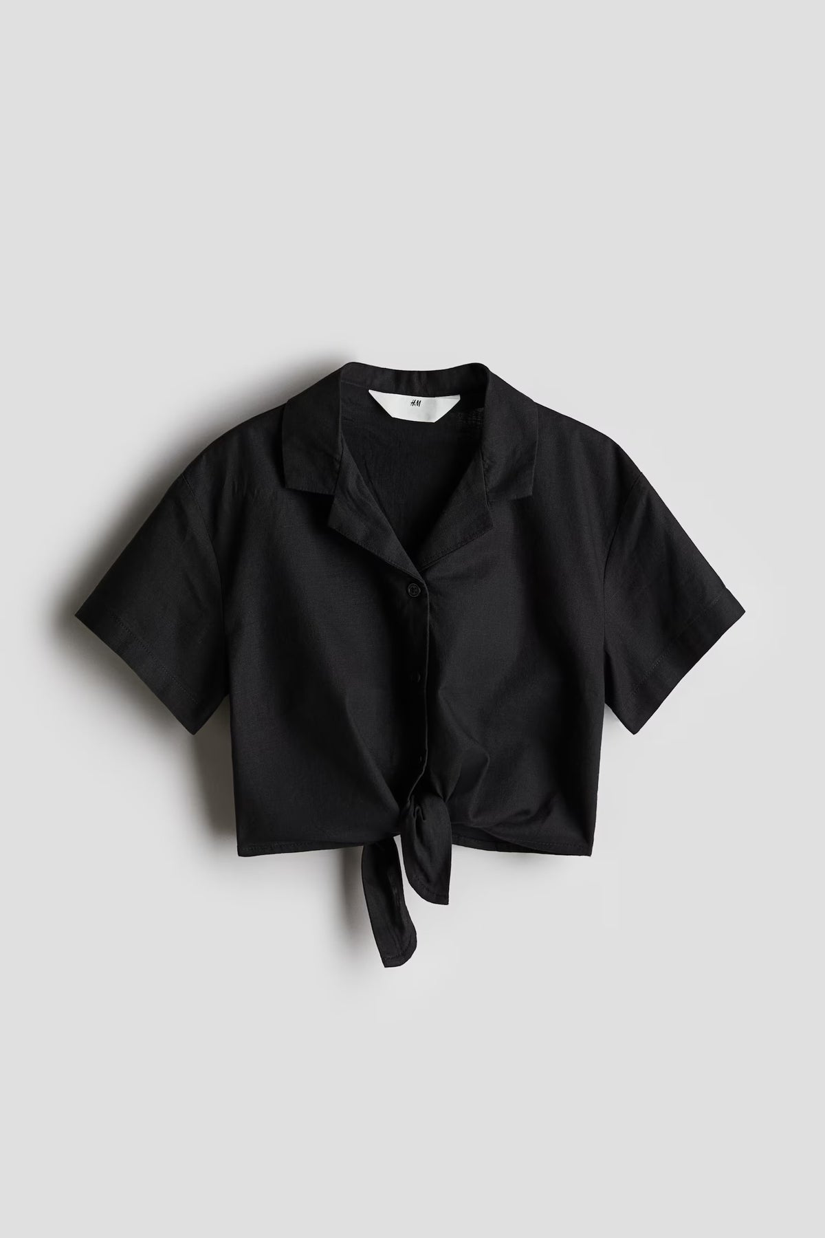 Cropped shirt in a soft, woven cotton and linen blend. Resort collar, buttons at front, dropped shoulders, and short sleeves. Knot detail at hem.