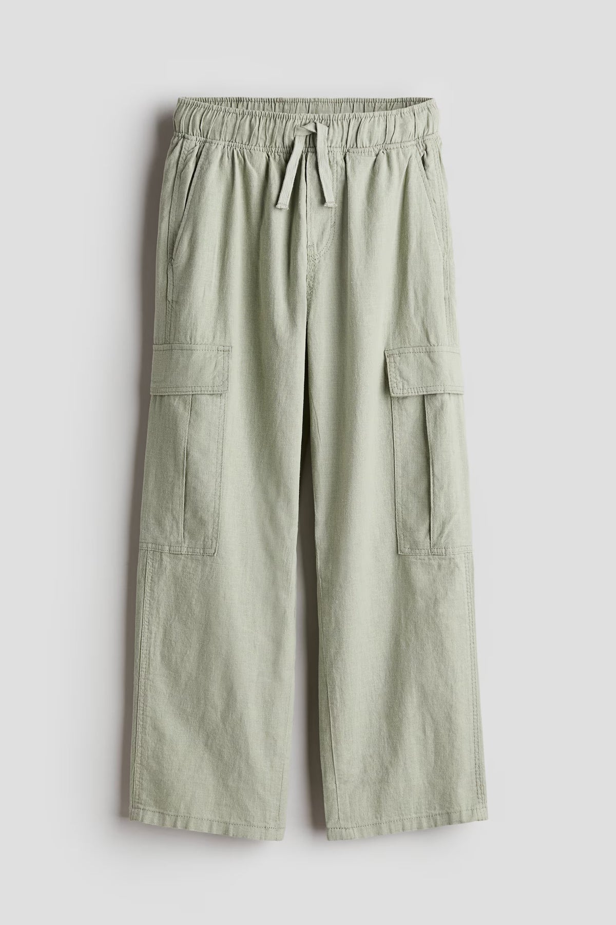 Loose-fit cargo joggers in an airy, woven linen and cotton blend. Elasticized, drawstring waistband and a mock fly. Diagonal front pockets, open back pockets, and leg pockets with flap and hook-loop fastening.