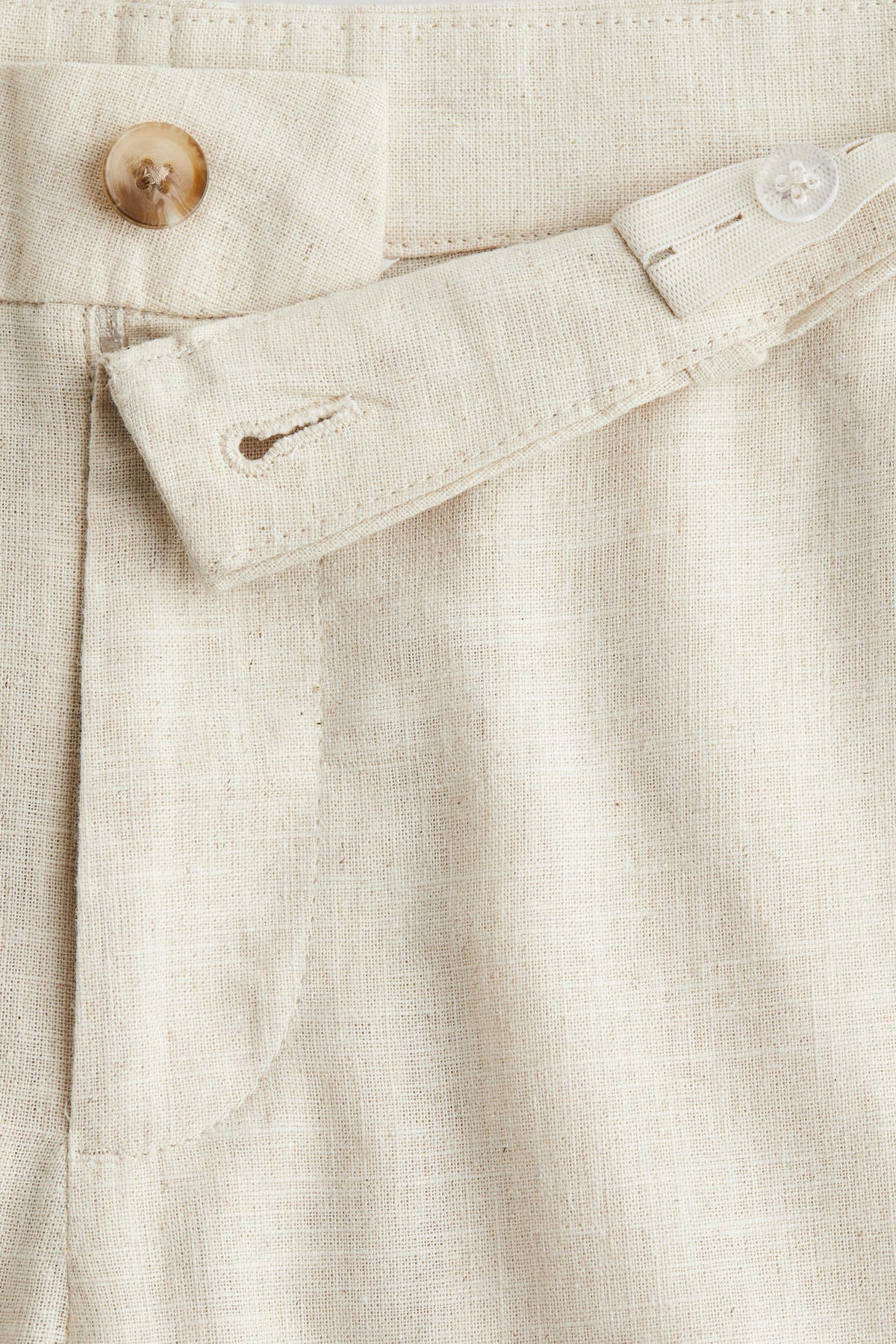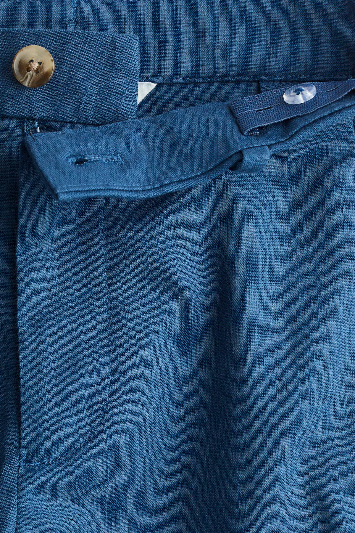 Suit in a soft, airy, woven linen and cotton blend. Jacket with notched lapels, buttons at front, and open front pockets. Pants with an adjustable, elasticized waistband, zip fly with button, and a decorative back pocket.