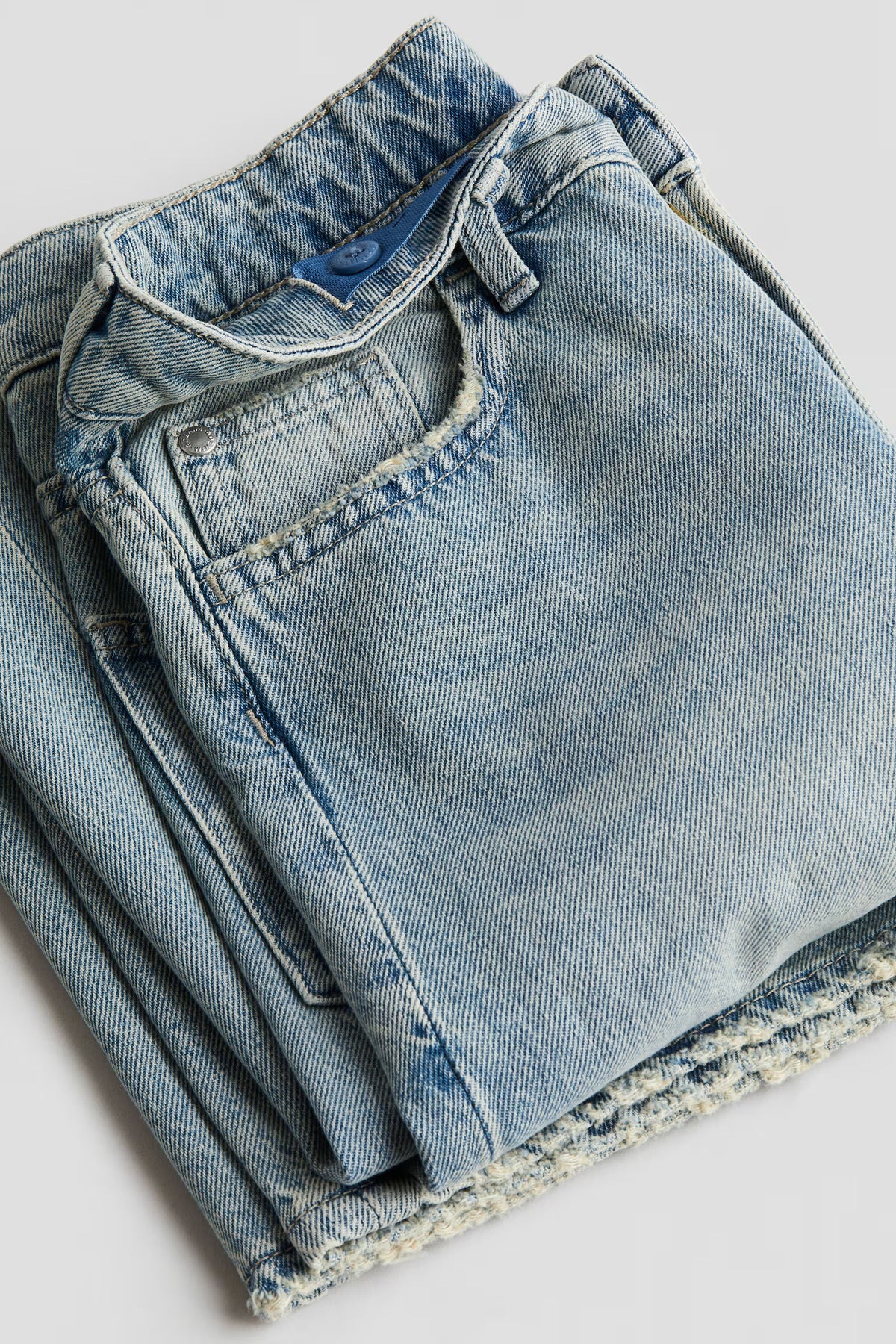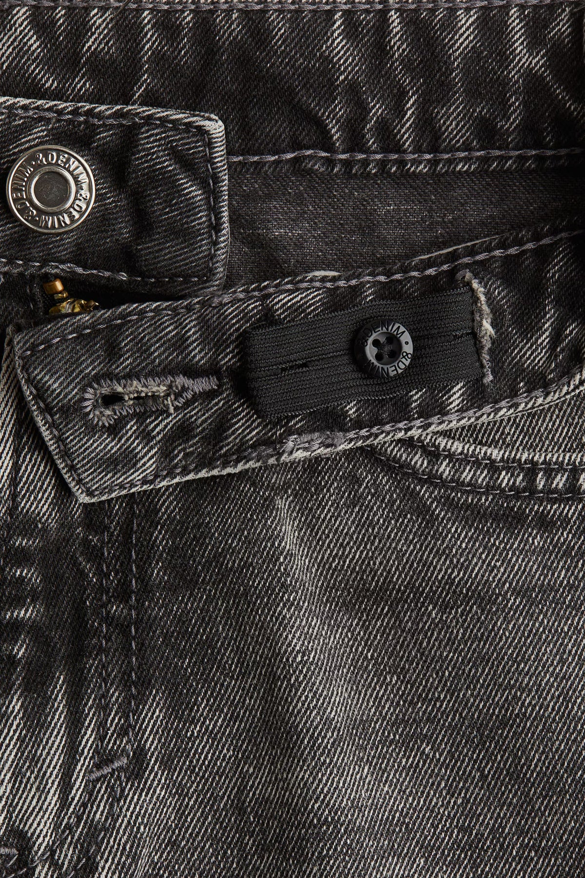 5-pocket jeans in washed cotton denim with a loose fit through hip, thigh, and leg. Adjustable, elasticized waistband for best fit, zip fly with button, and wide, flared hems.