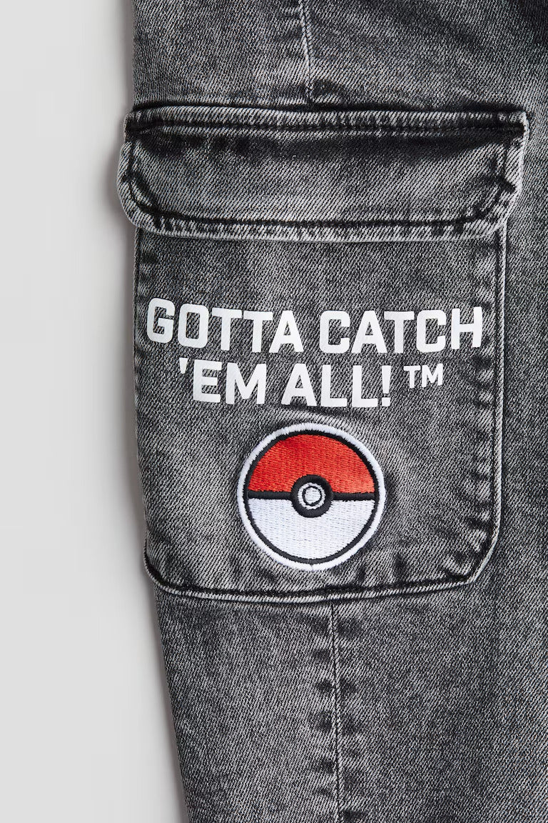 Pants in soft cotton denim with printed and embroidered motifs. Adjustable, elasticized waistband and zip fly with snap fastener. Front pockets, a coin pocket, welt back pockets, and leg pockets with flap.