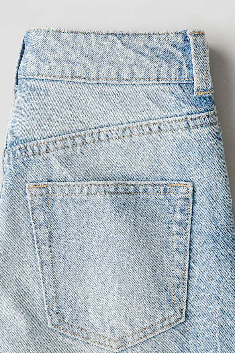 5-pocket shorts in soft cotton denim with distressed details and a decorative, detachable metal chain pendant. High waist, adjustable elastic at waistband, and zip fly with button.