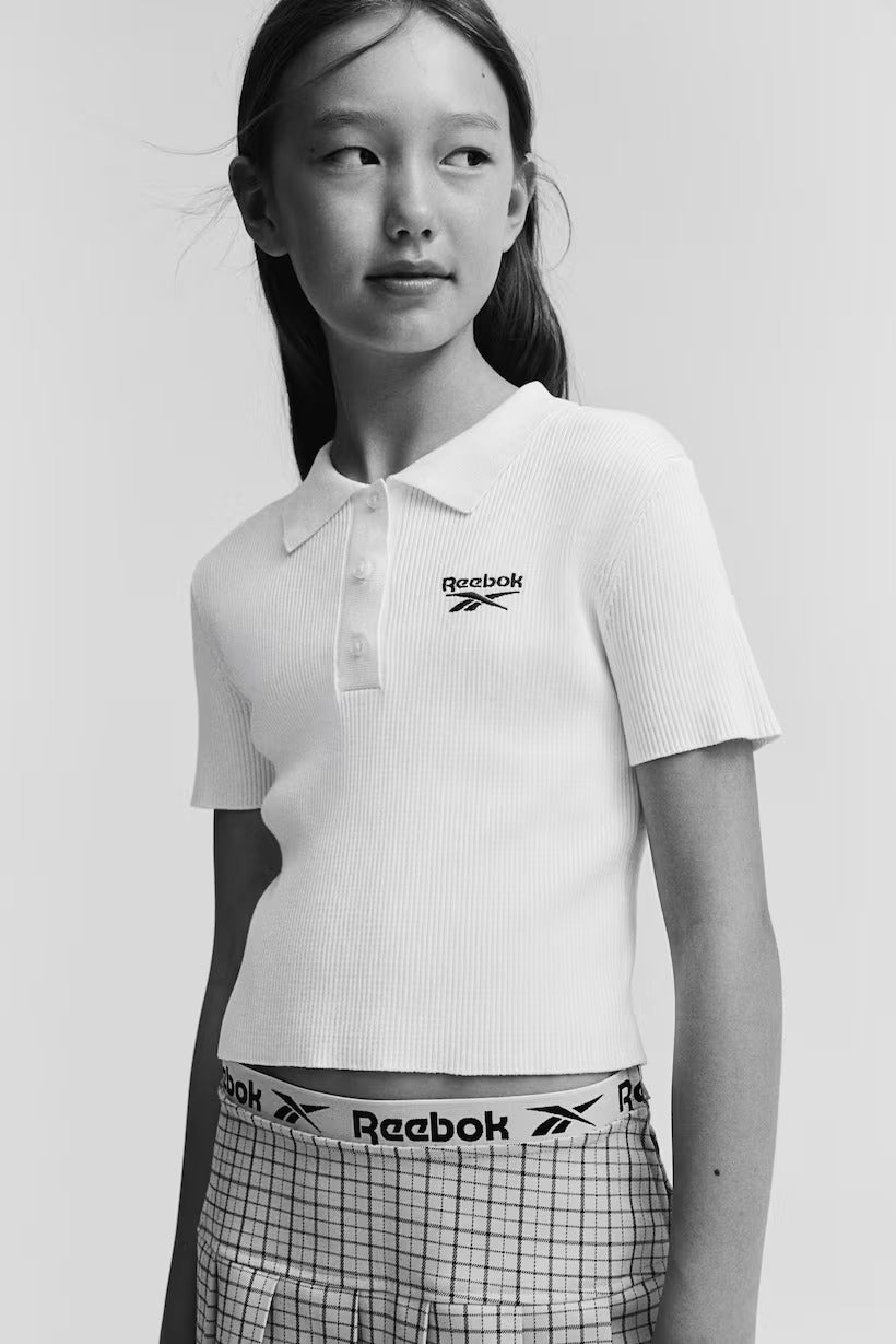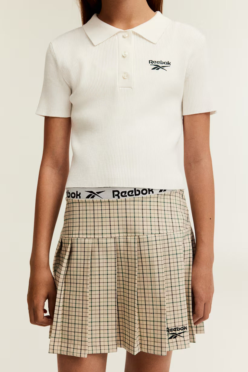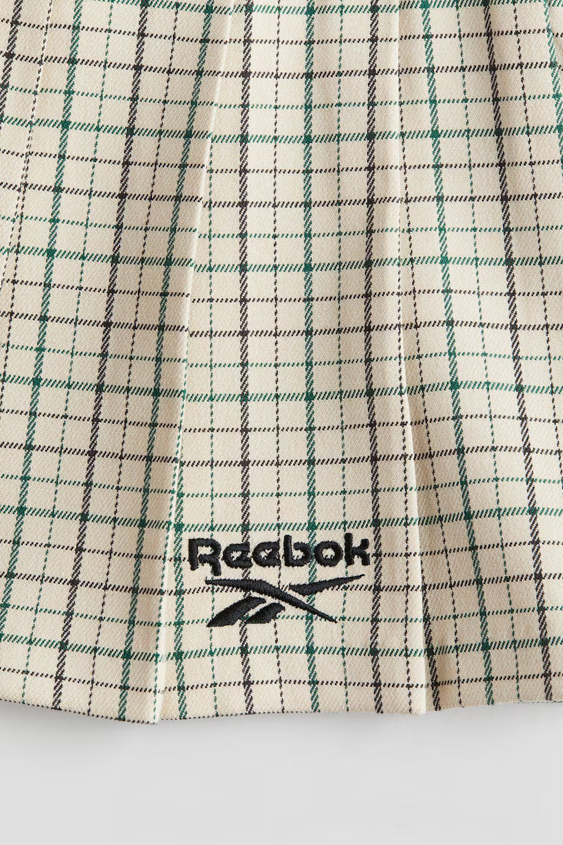 H&M x Reebok. Pleated skirt in stretchy twill with an embroidered detail at front. Decorative jacquard elastic at top, adjustable, elasticized waistband, and a concealed zipper at one side.