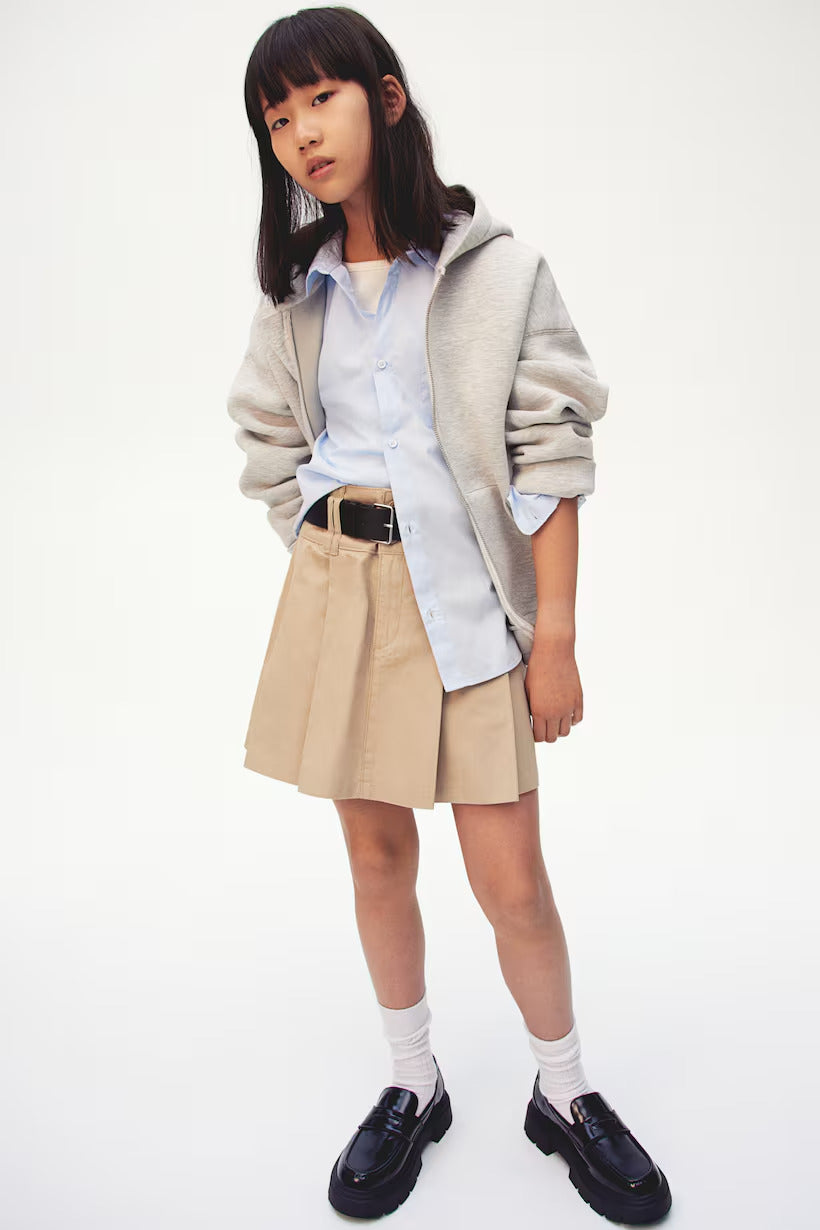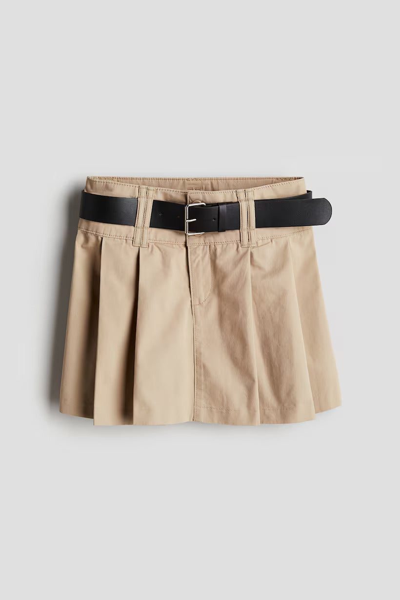 Pleated skirt in cotton canvas. Adjustable, elasticized waistband, zip fly with button, and a belt with metal buckle.