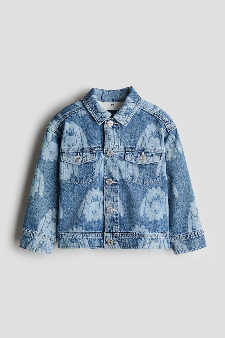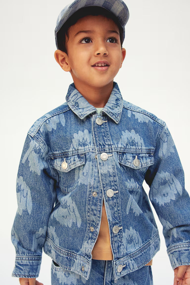 Loose-fit jacket in soft cotton denim with a printed pattern. Turn-down collar, snap fasteners at front, and chest pockets with flap and snap fastener. Dropped shoulders and snap fastener at cuffs.