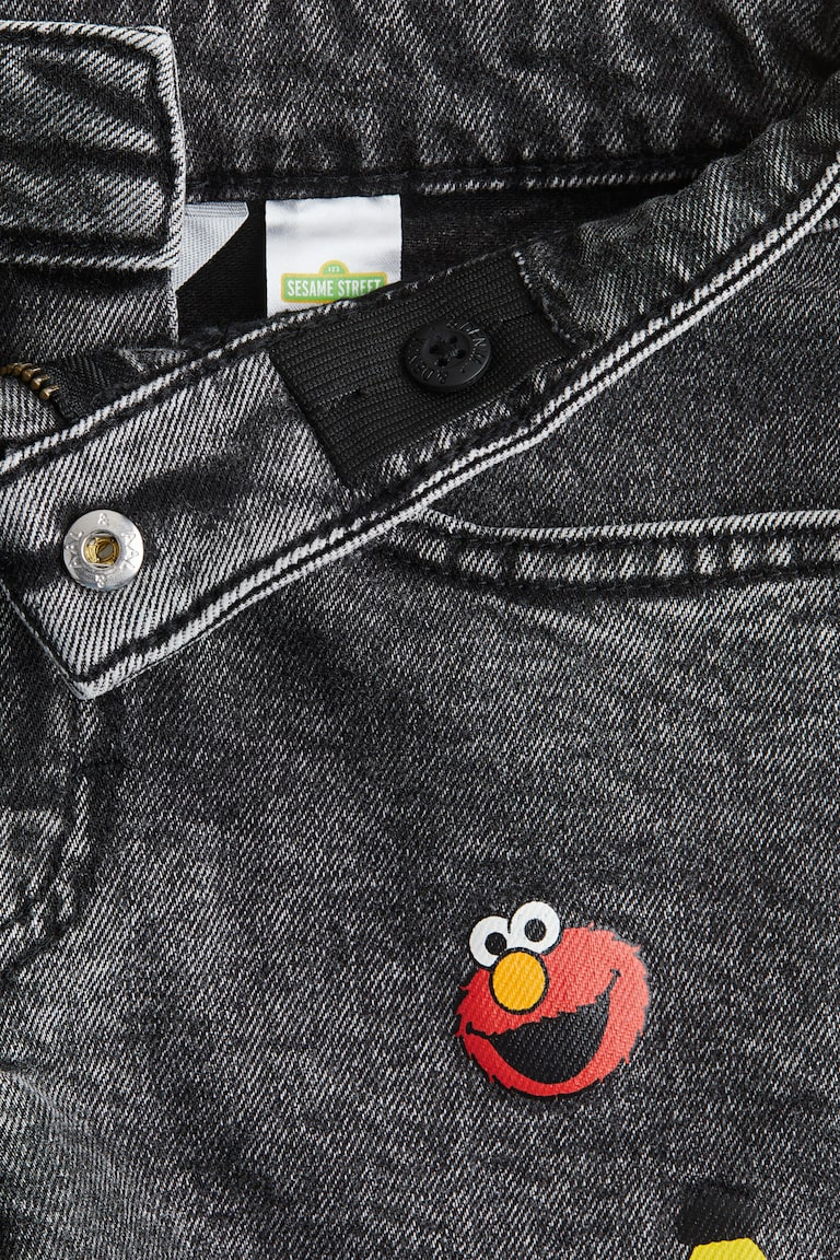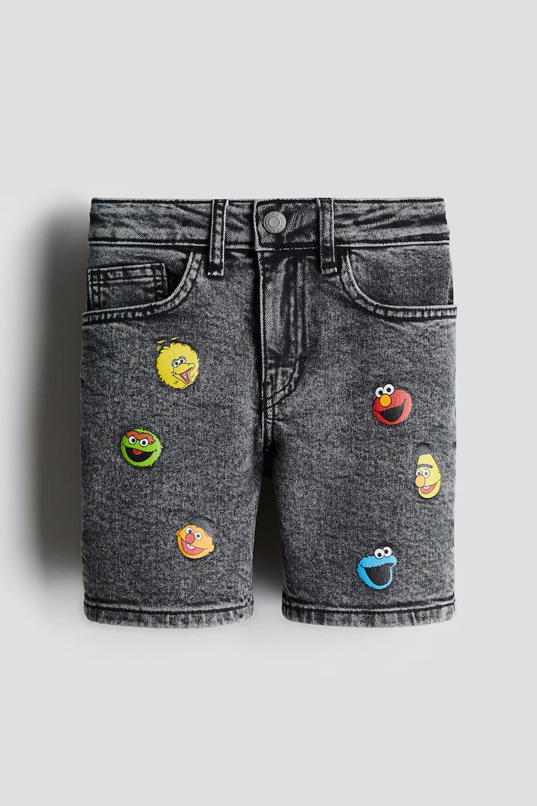 5-pocket shorts in soft cotton denim with printed motif details at front. Adjustable elastic at waistband and a zip fly with button.