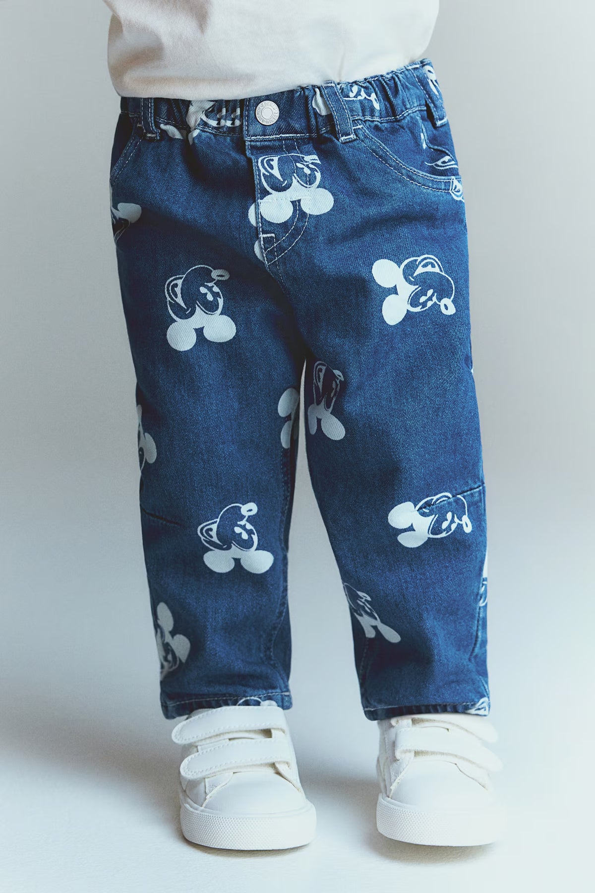 Jeans in soft cotton denim with a printed pattern. Adjustable, elasticized waistband, mock fly with snap fastener, mock front pockets, and regular back pockets.