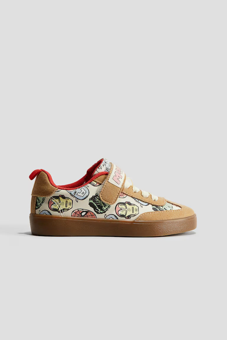 Sneakers with a printed design and details in napped fabric. Elasticized lacing at front with hook-loop tab, lightly padded opening and tongue, and a grosgrain loop at back. Lining in piqué and soft, molded insoles for added comfort. Sole thickness approx. 3/4 in.