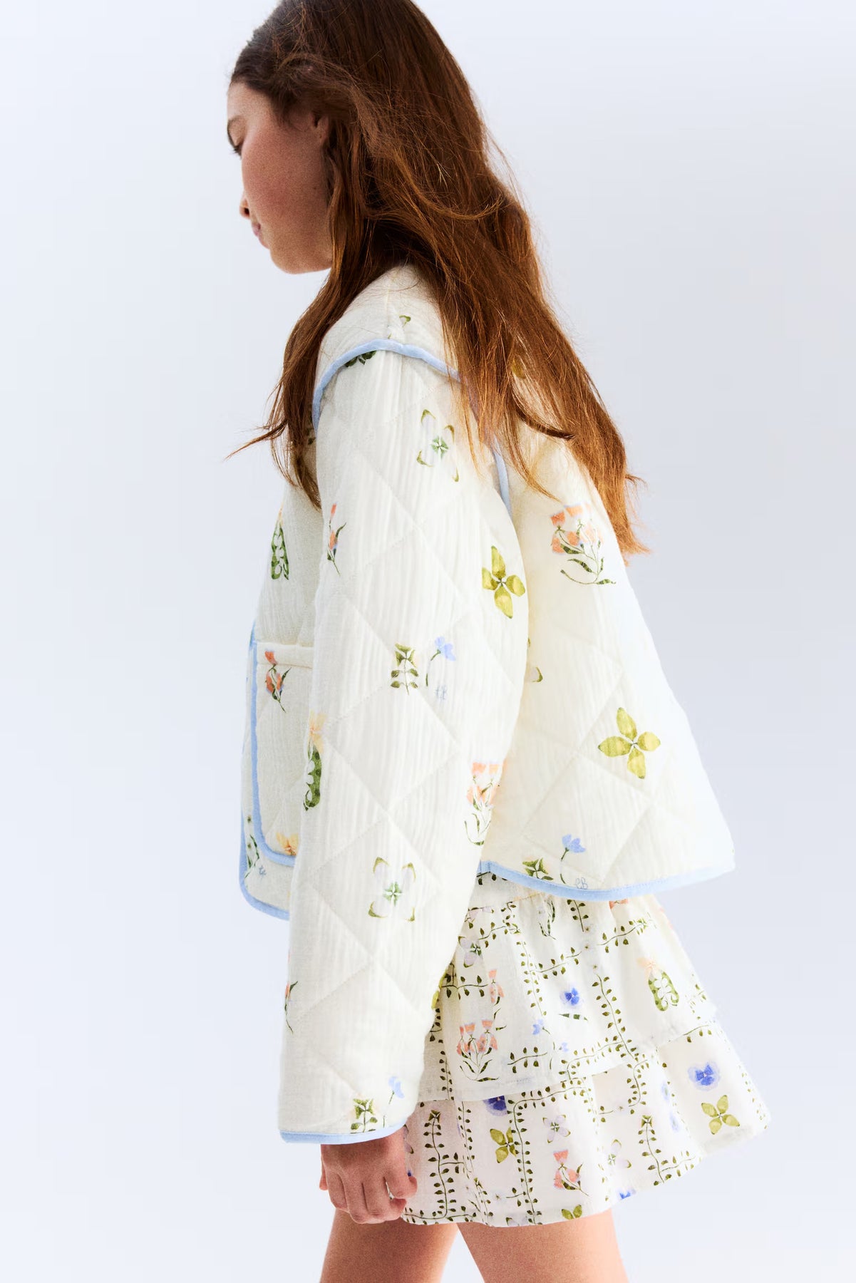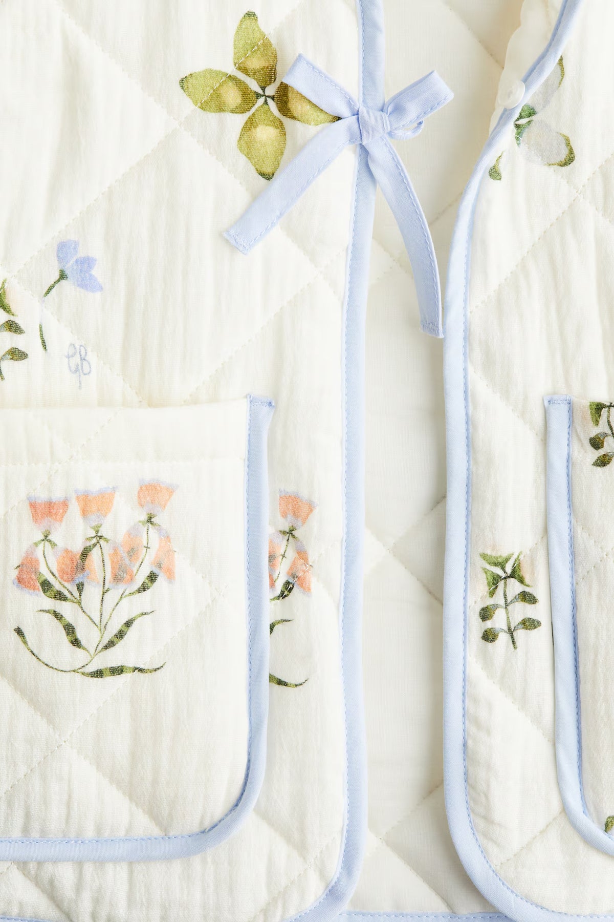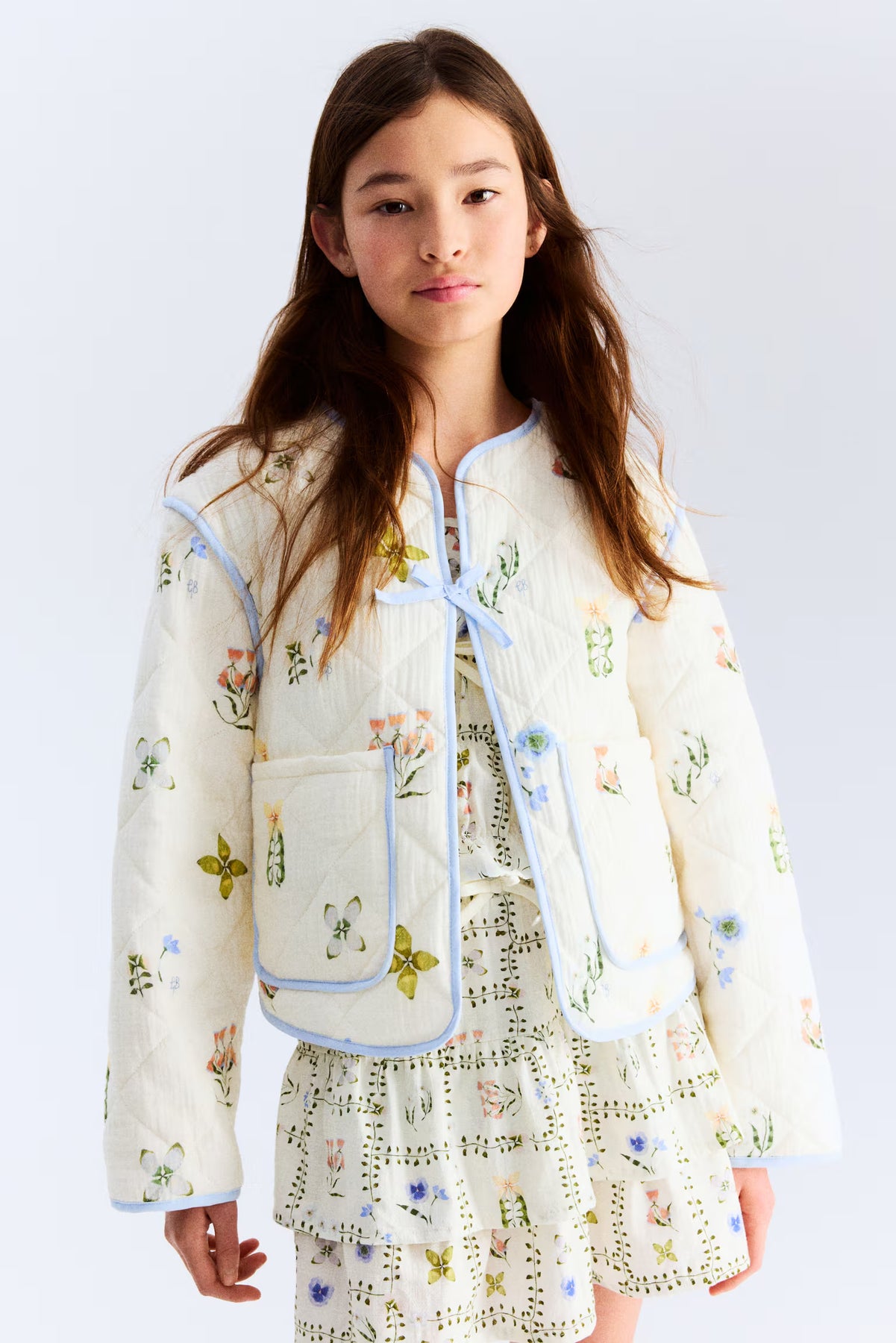H&M x Georgia Beaumont. Oversized jacket with a printed floral pattern, contrasting piping, and padding in quilted cotton muslin. Round neckline, opening with a decorative bow and concealed button, and patch front pockets. Lined.