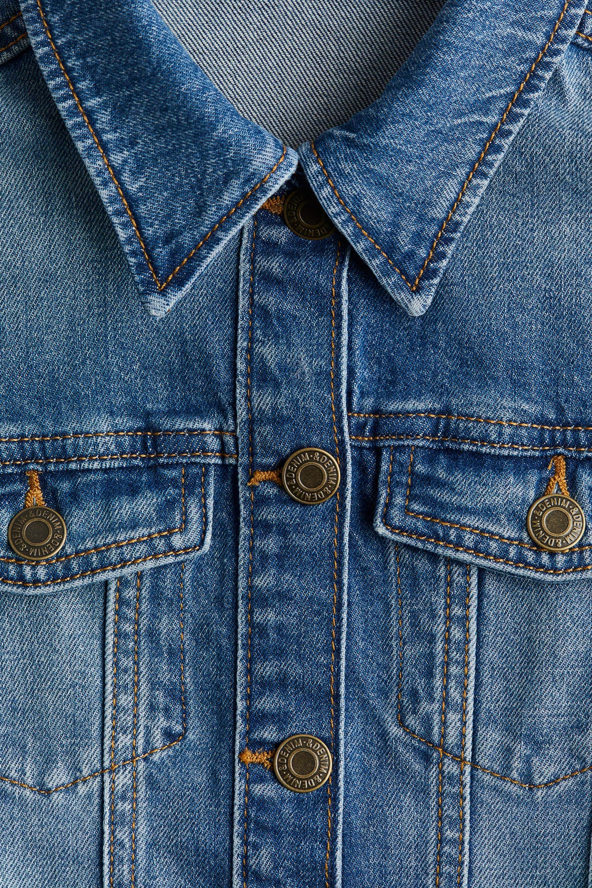 Short jacket in stretchy cotton denim. Turn-down collar, buttons at front, and chest pockets with flap and button. Dropped shoulders and voluminous, pleated sleeves with button at cuffs.