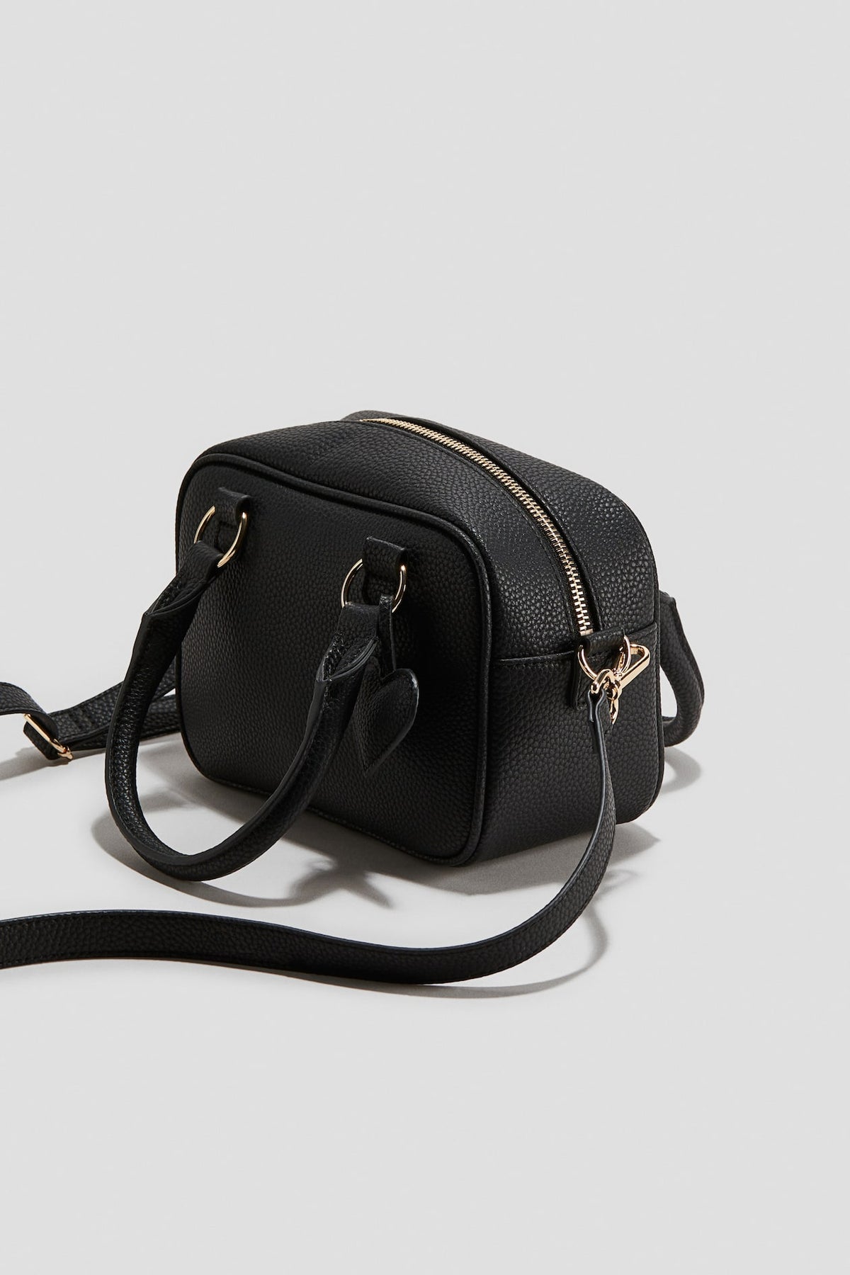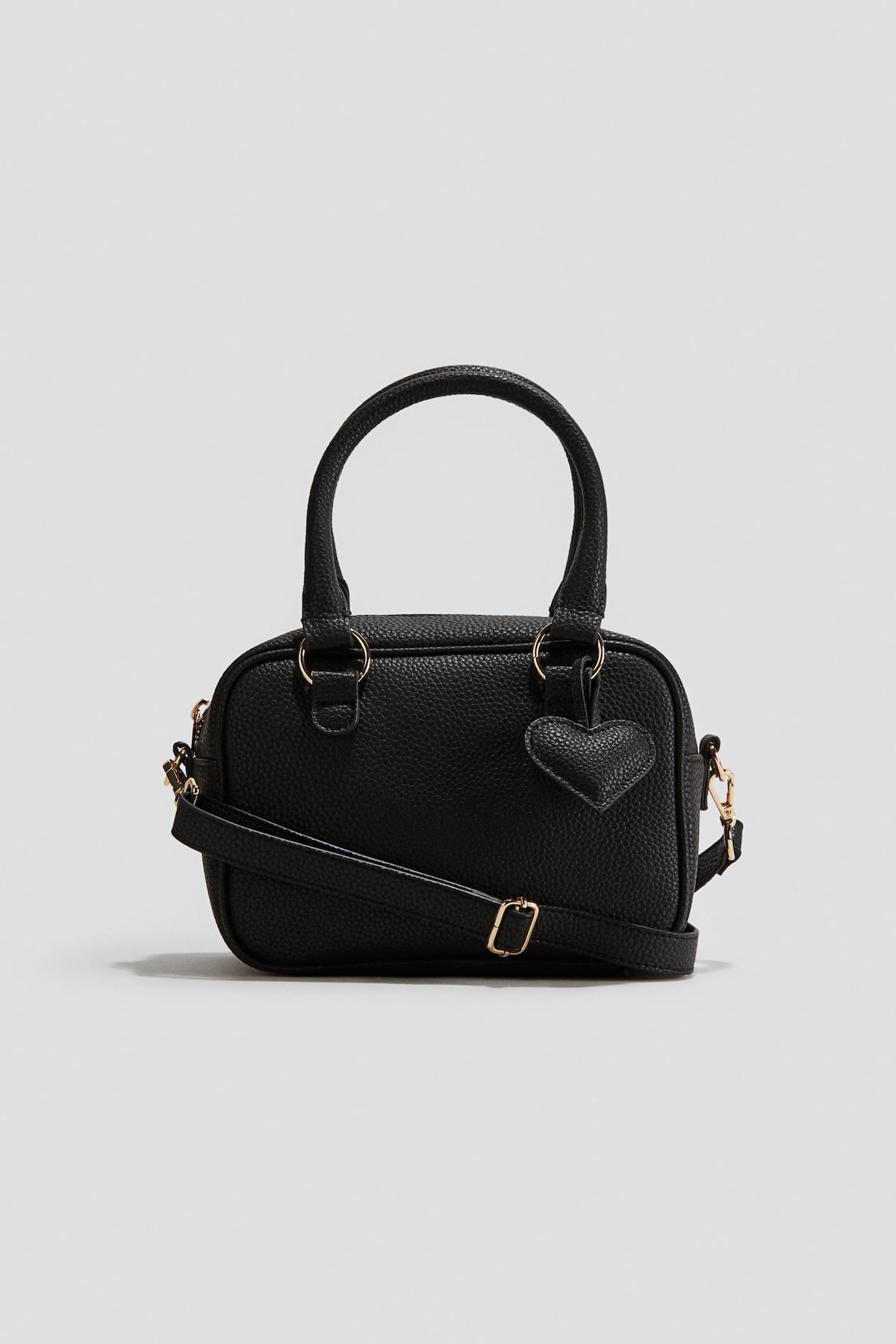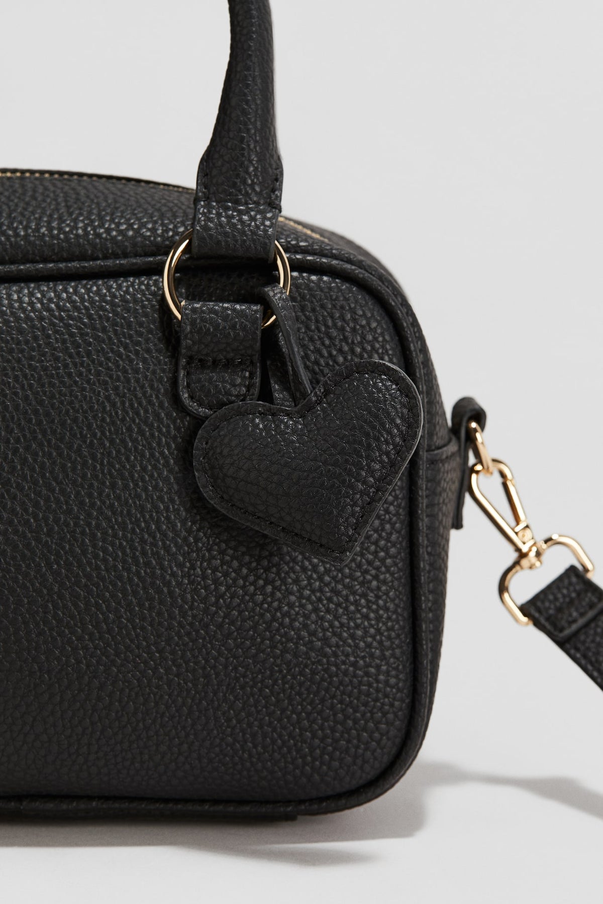 Small shoulder bag in coated fabric with a heart-shaped charm. Detachable, adjustable shoulder strap, two handles, and a zipper at top. Lined.