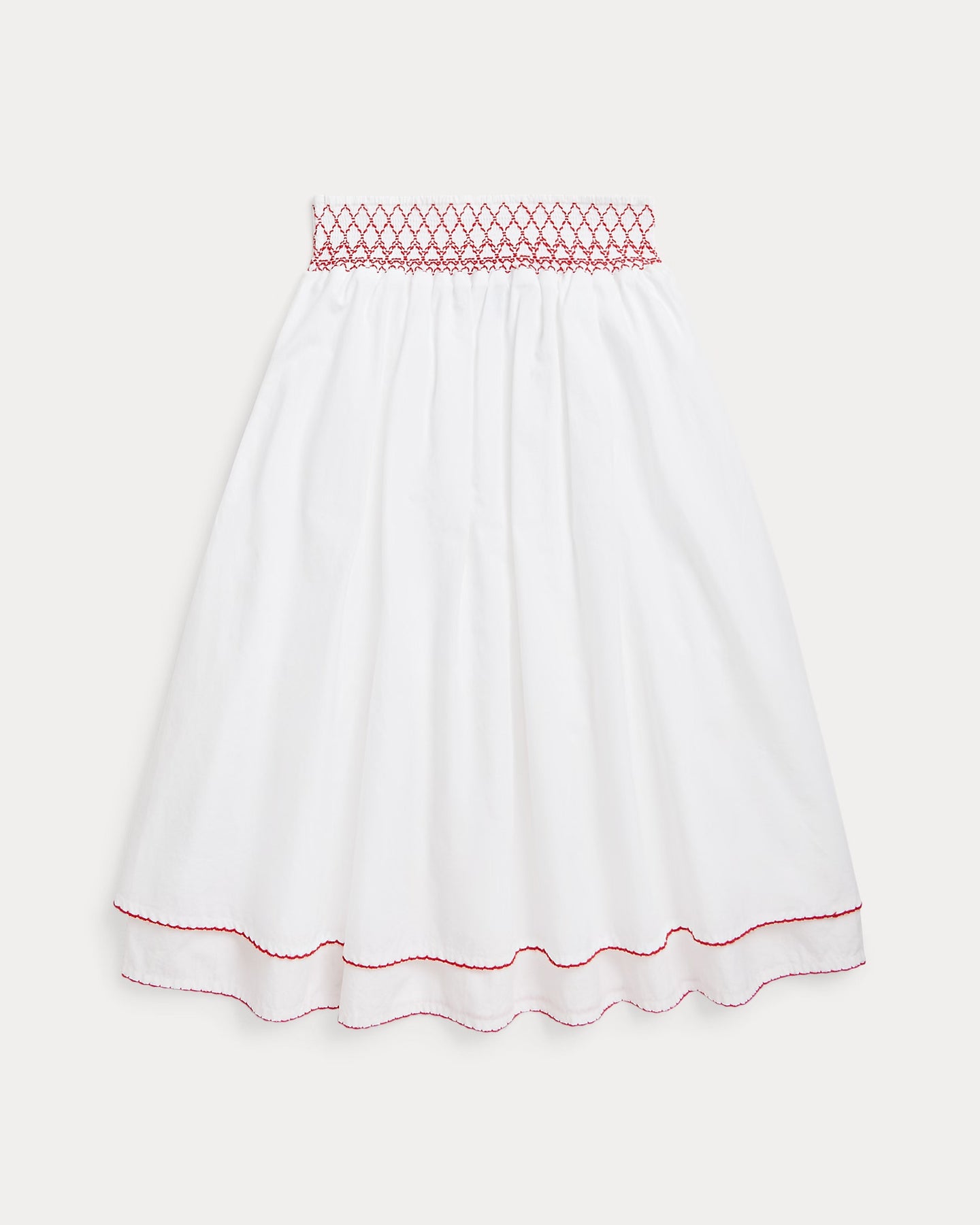 • Skirt: signature embroidered Pony at the right hem; smocked waistband; side on-seam pockets; picot trim at the hem; half-lined.