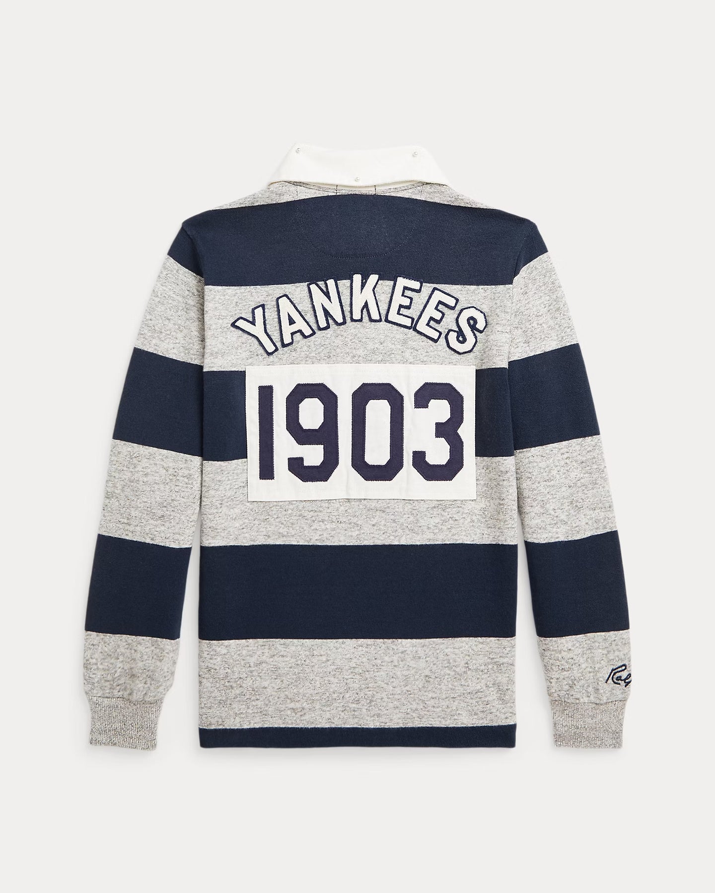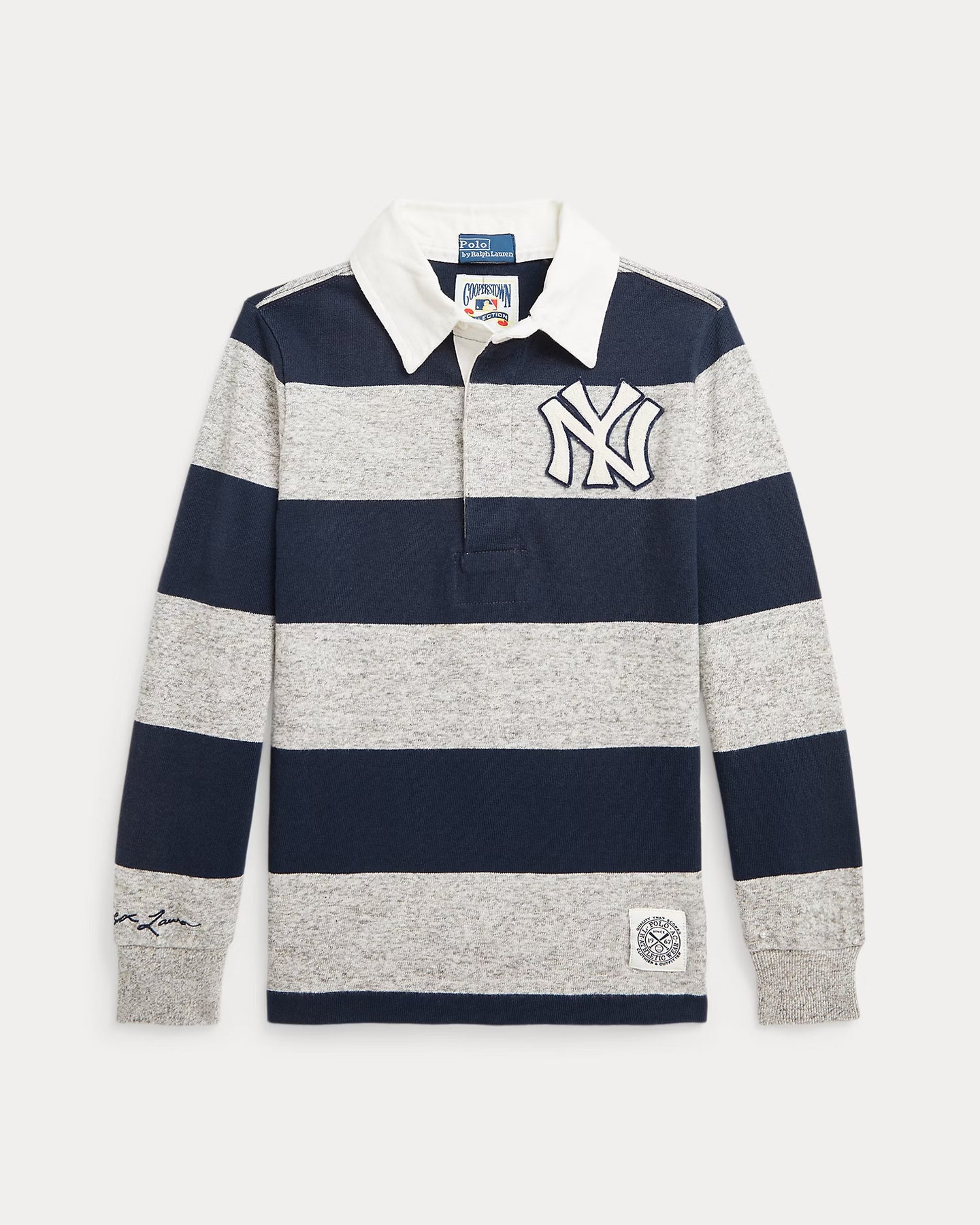 - Twill rugby collar. Three-button rugby placket. Rubber buttons. Long sleeves with ribbed cuffs. "Ralph Lauren" script embroidered above the right cuff. New York Yankees™ logo patch at the left chest.