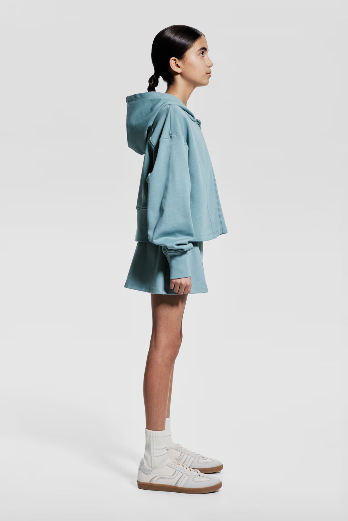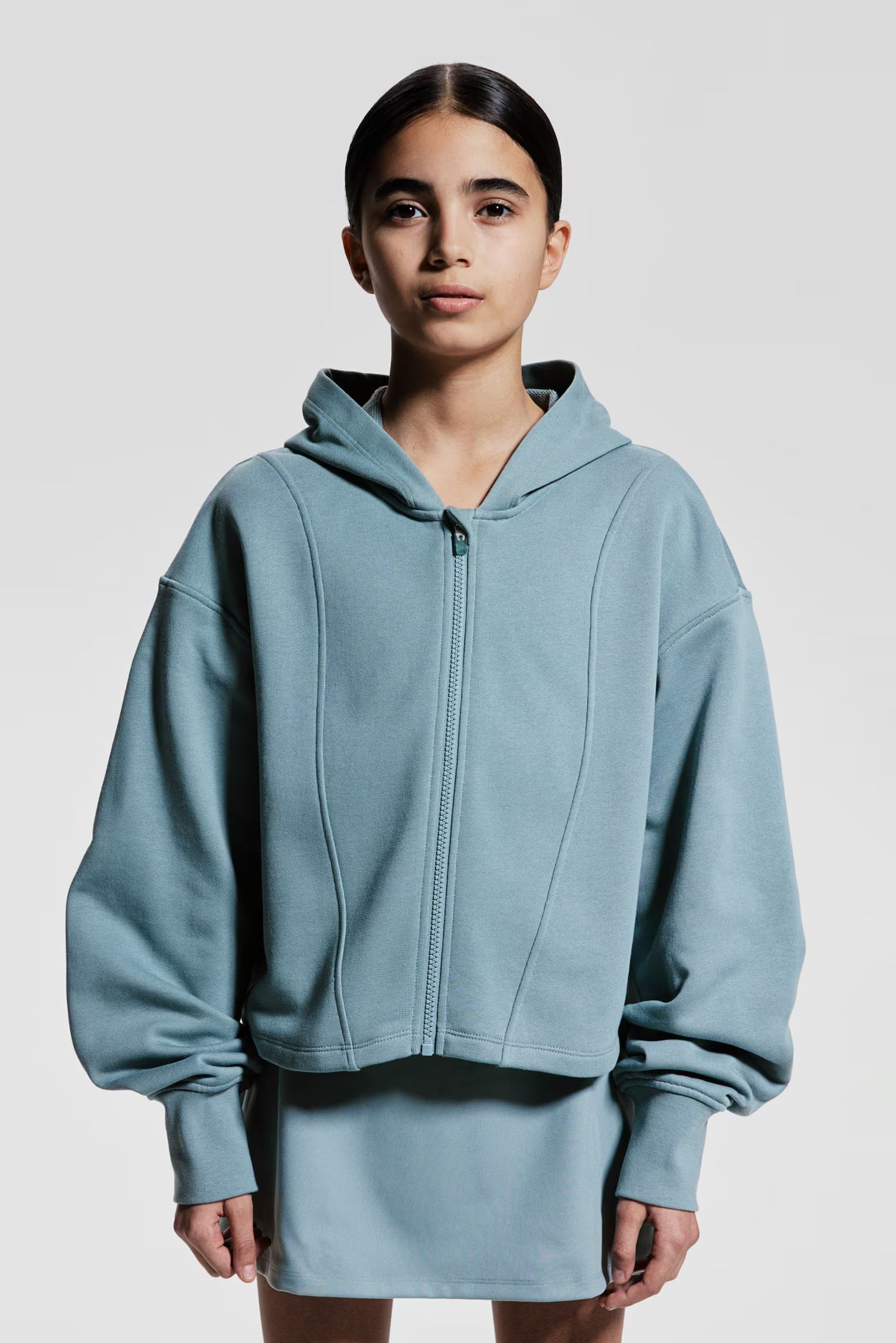 Short, loose-fit activewear hooded sweatshirt jacket with soft, brushed inside. Hood, zipper at front with anti-chafe chin guard, and long raglan sleeves. Ribbing at cuffs and hem.