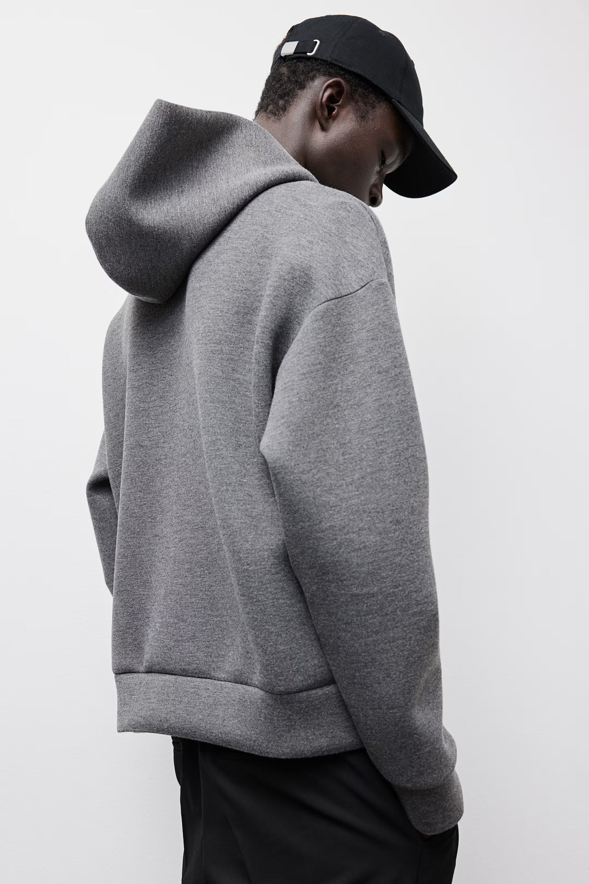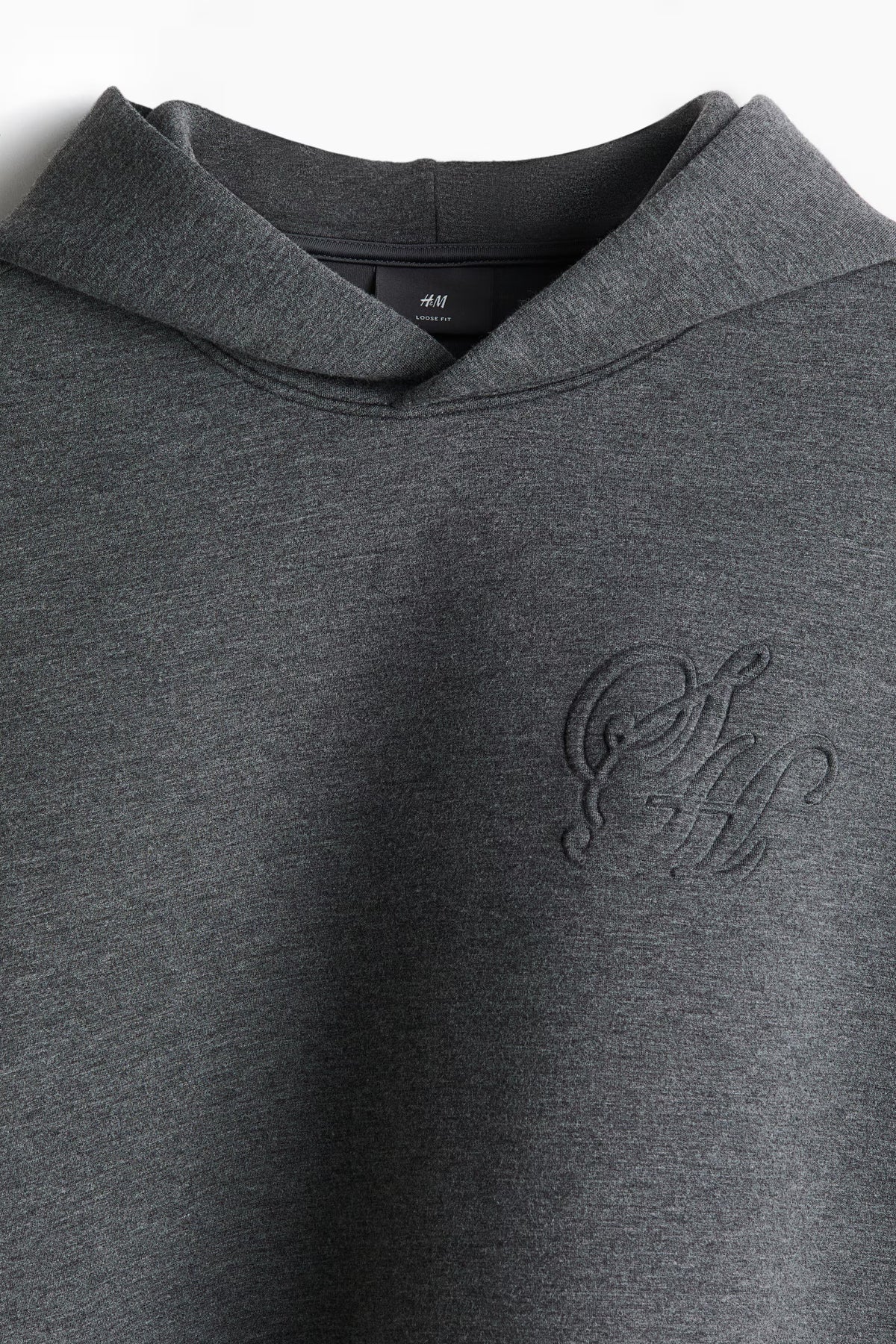Loose-fit hoodie in scuba fabric with a debossed motif on chest. Generous but not oversized silhouette. Lined wrapover hood, dropped shoulders, and long sleeves.