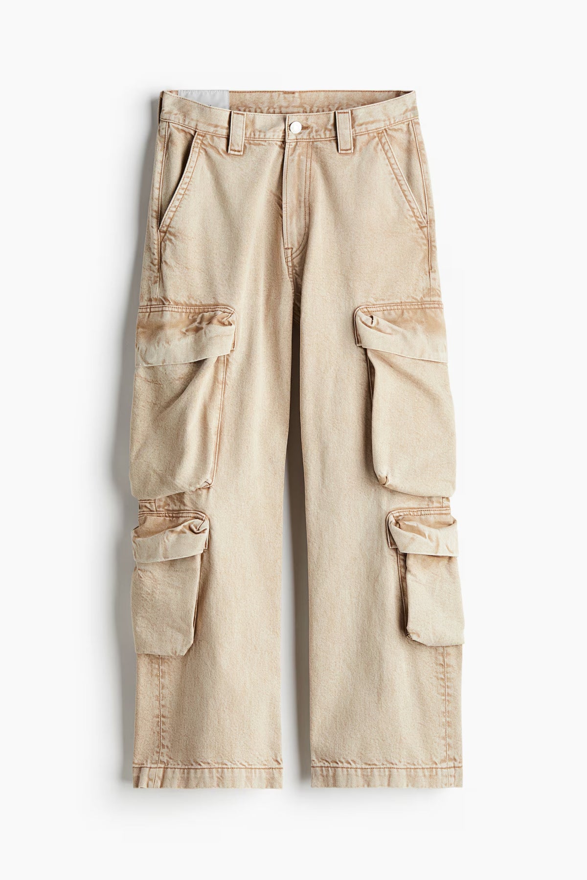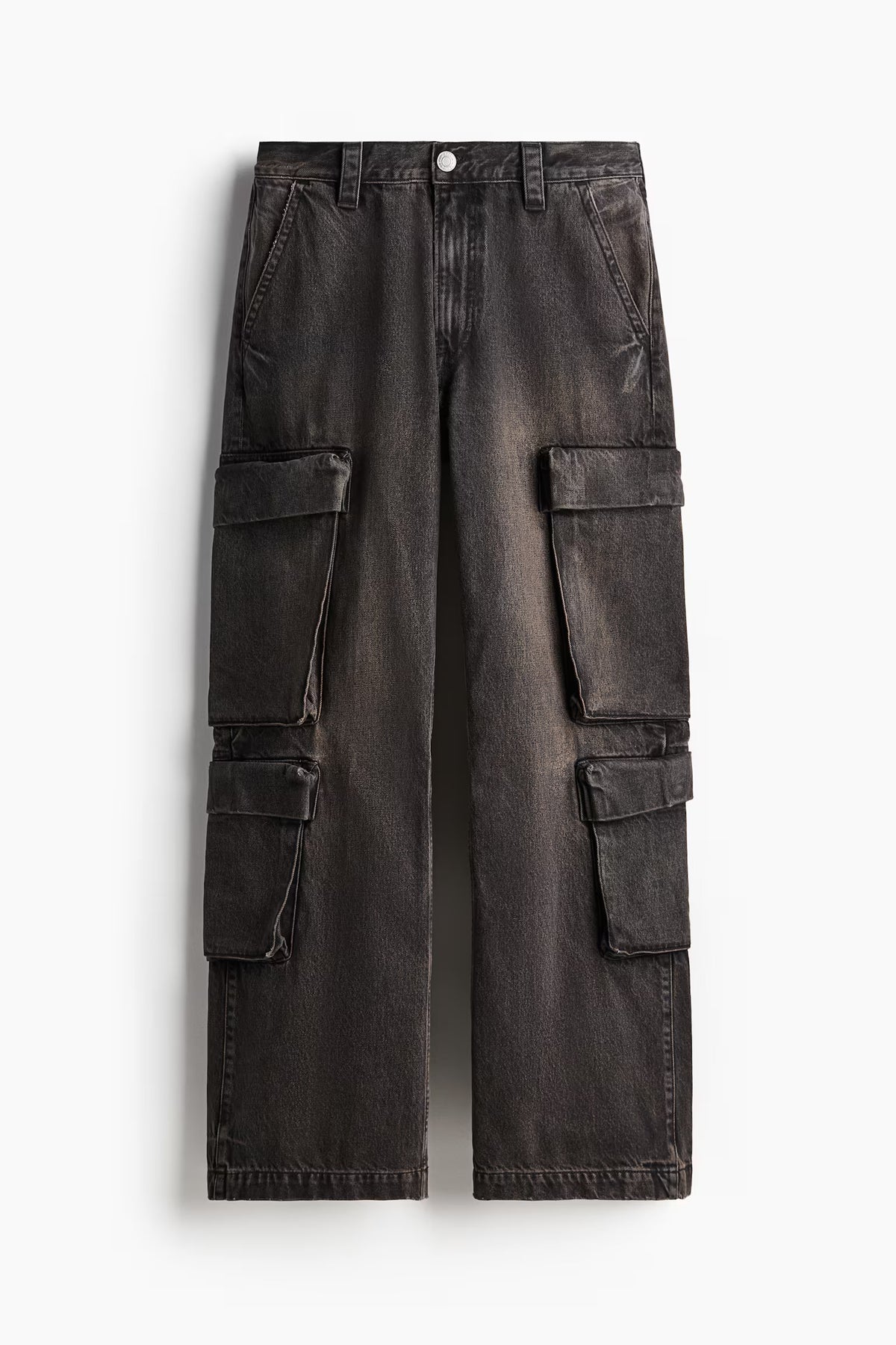 Flared cargo jeans in rigid cotton denim. Loose fit from seat to hem with extra room around legs. Regular waist, zip fly, and dropped gusset Diagonal side pockets, back pockets with flap, and four leg pockets with flap. Effortless. You're all set.
