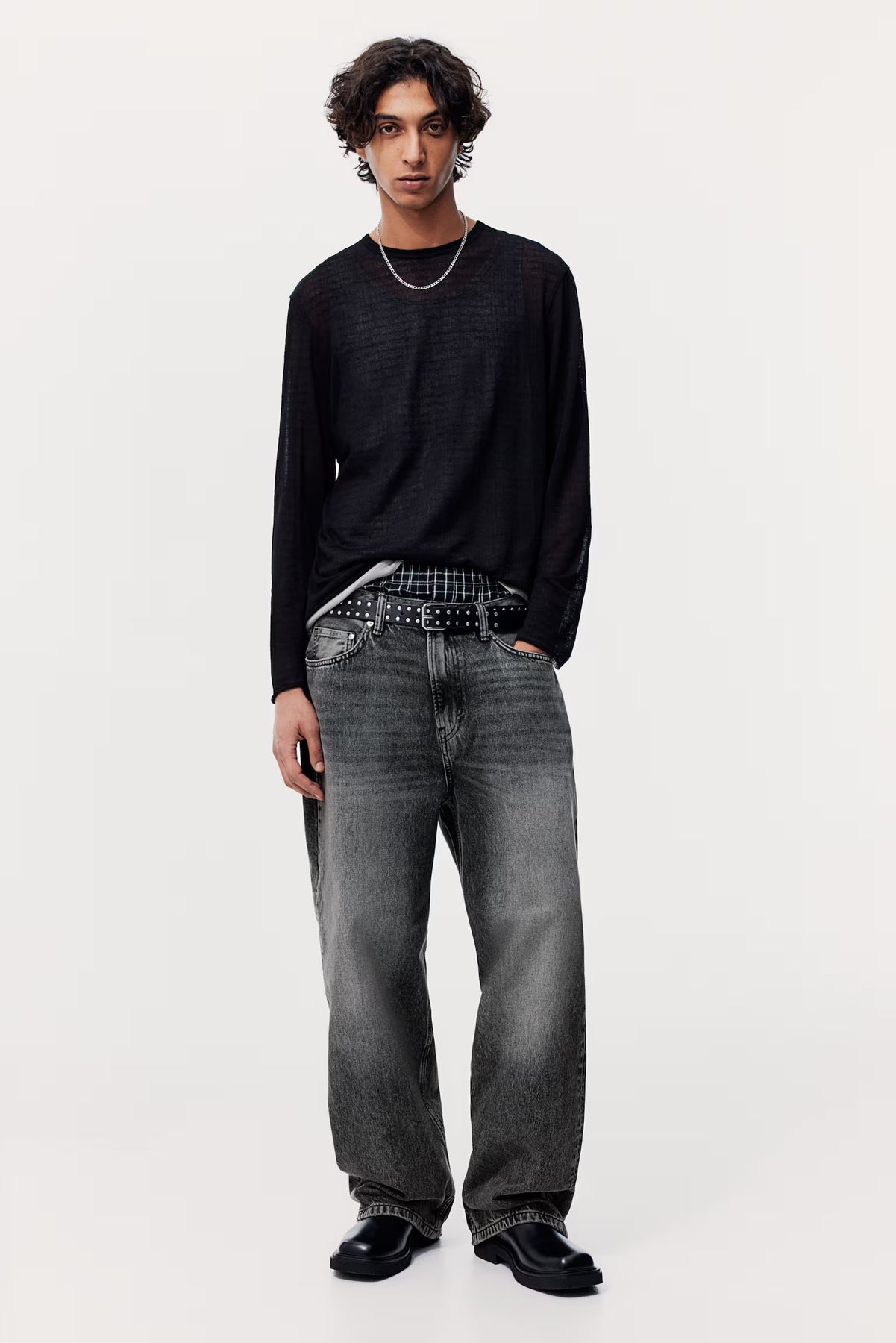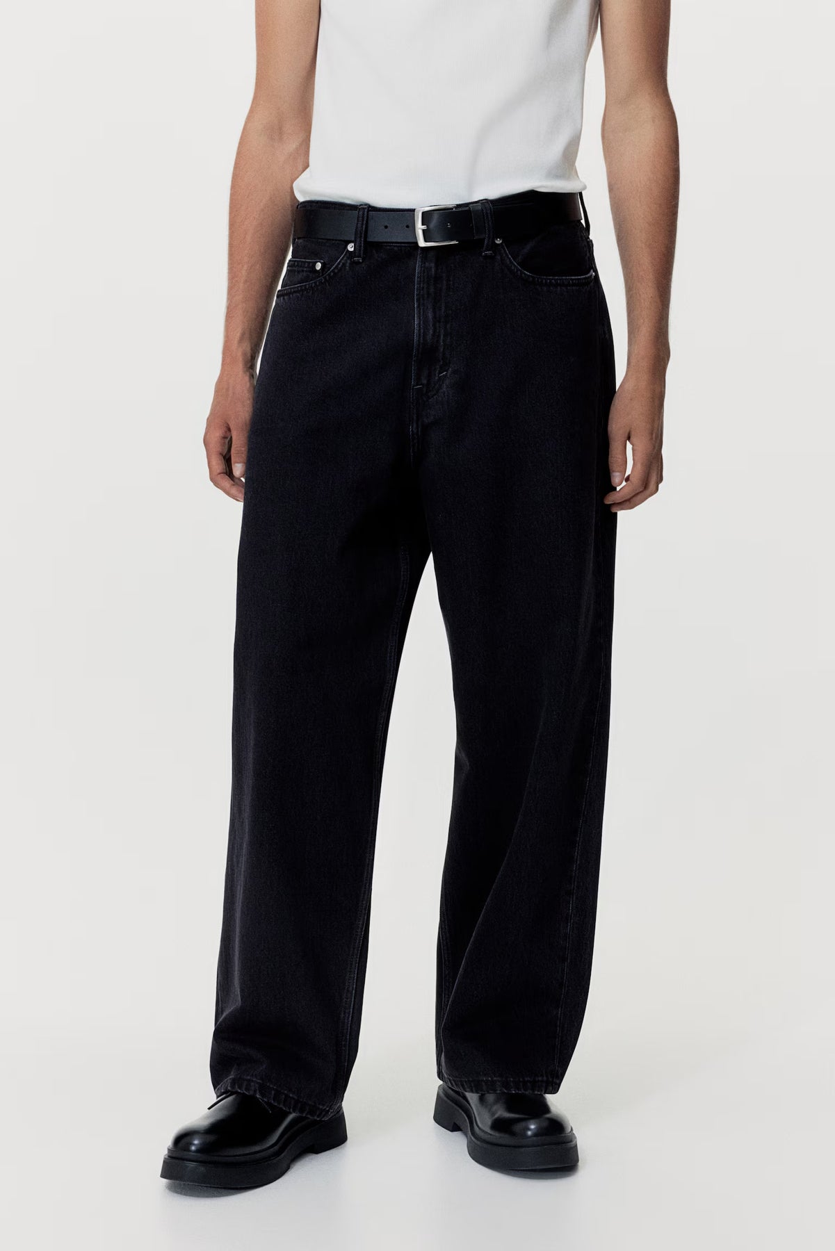 5-pocket jeans in rigid cotton denim. Baggy fit from seat to hem with plenty of room around legs. Regular waist, zip fly, and dropped gusset. Rounded legs, stacked at ankle. It's denim perfection.
