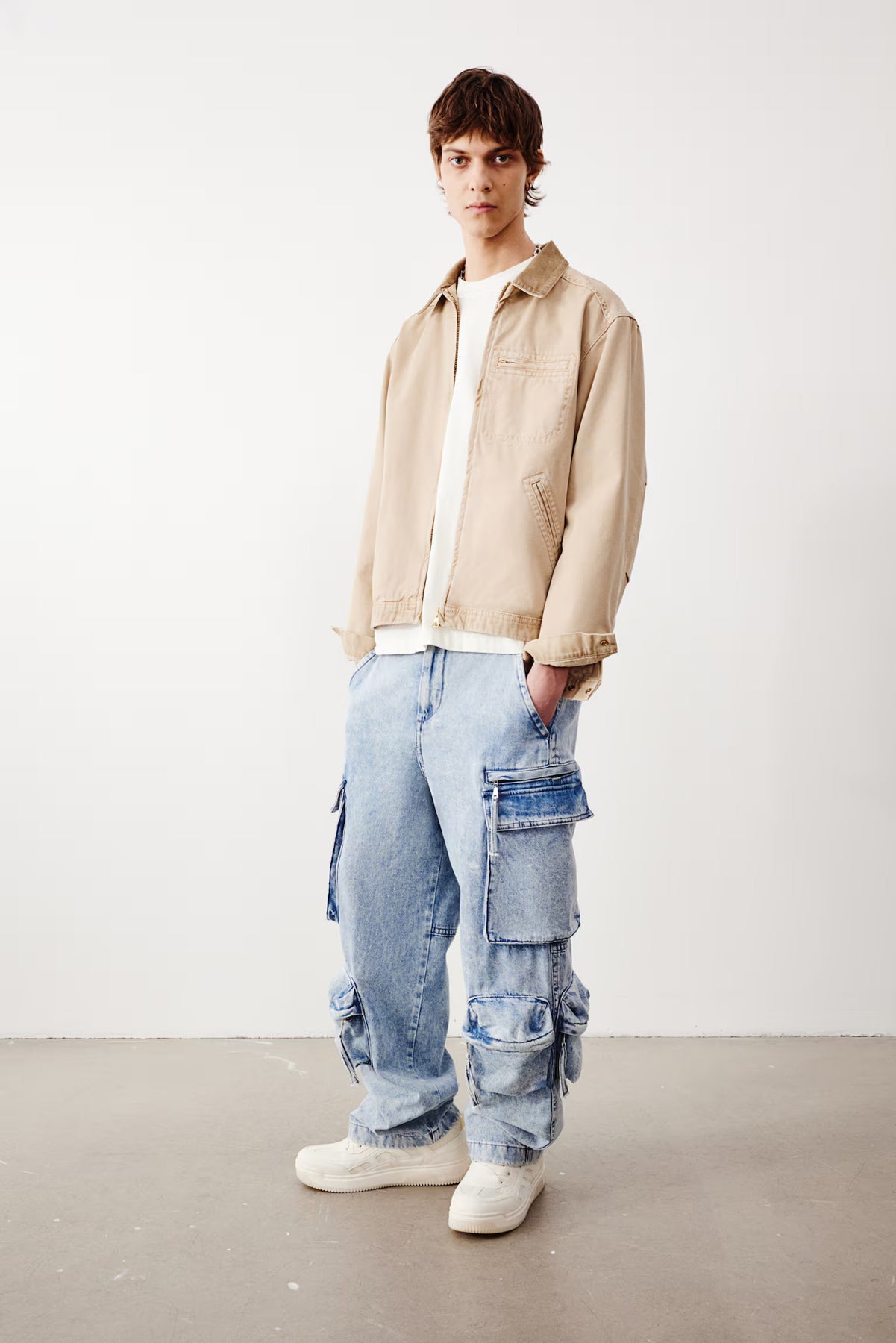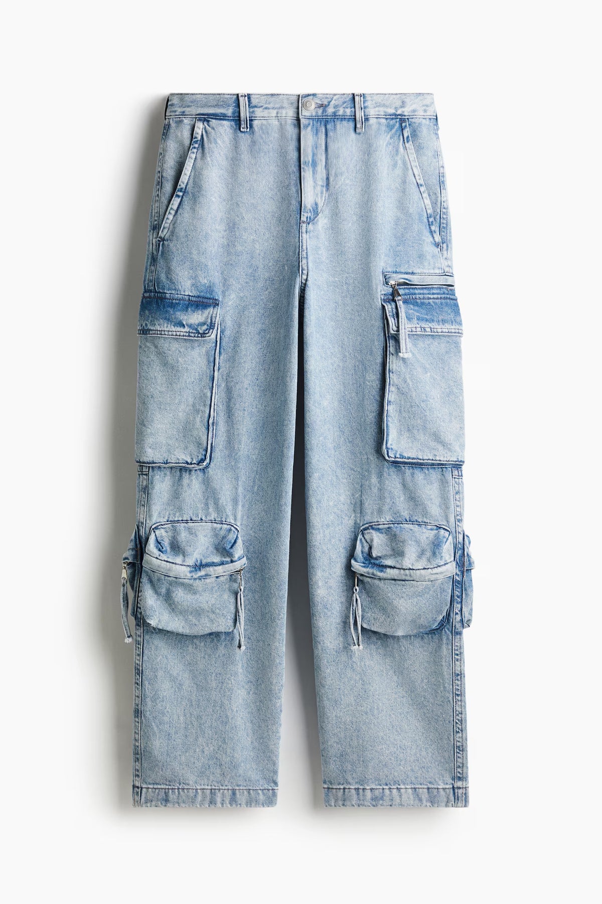 Cargo jeans in rigid cotton denim. Loose fit from seat to hems. Regular waist, zip fly, and dropped gusset. Diagonal side pockets, welt back pockets with stitched flap, and multiple leg pockets with various designs. Rounded, roomy legs, stacked at ankle. Complete the look with an oversized hoodie.