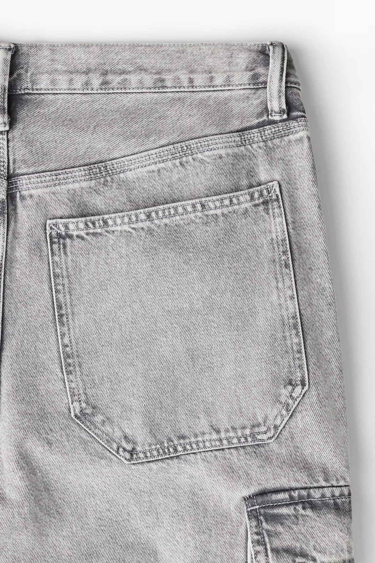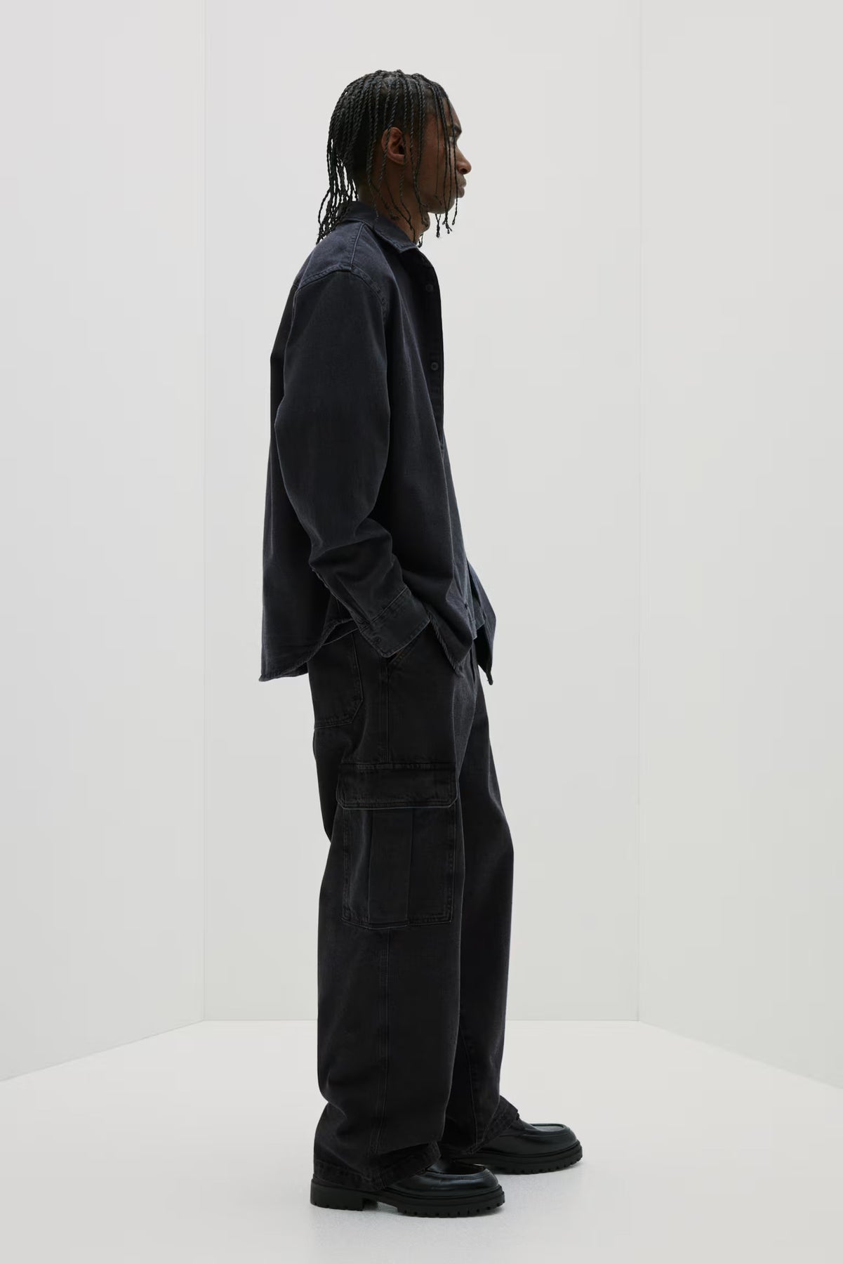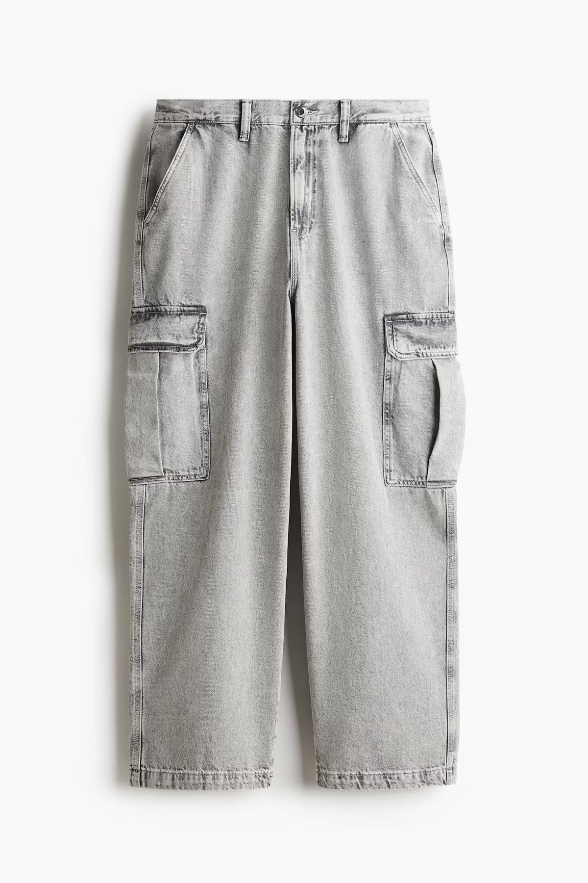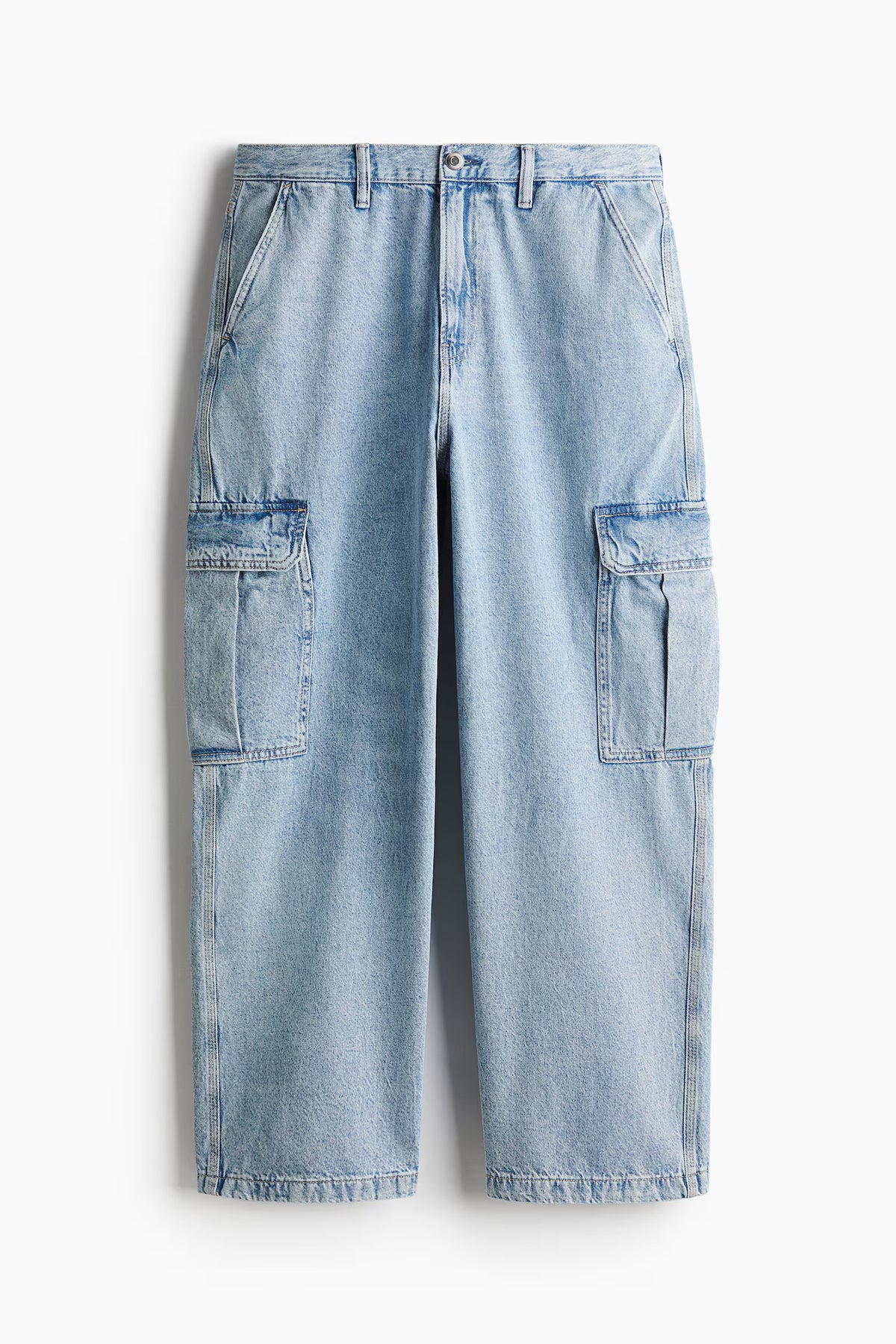 Cargo jeans in rigid cotton denim. Loose fit from seat to hem with rounded, roomy legs. Regular waist, zip fly with button, and dropped gusset. Side pockets, back pockets, and leg pockets with flap. All you need to conquer the full denim look.