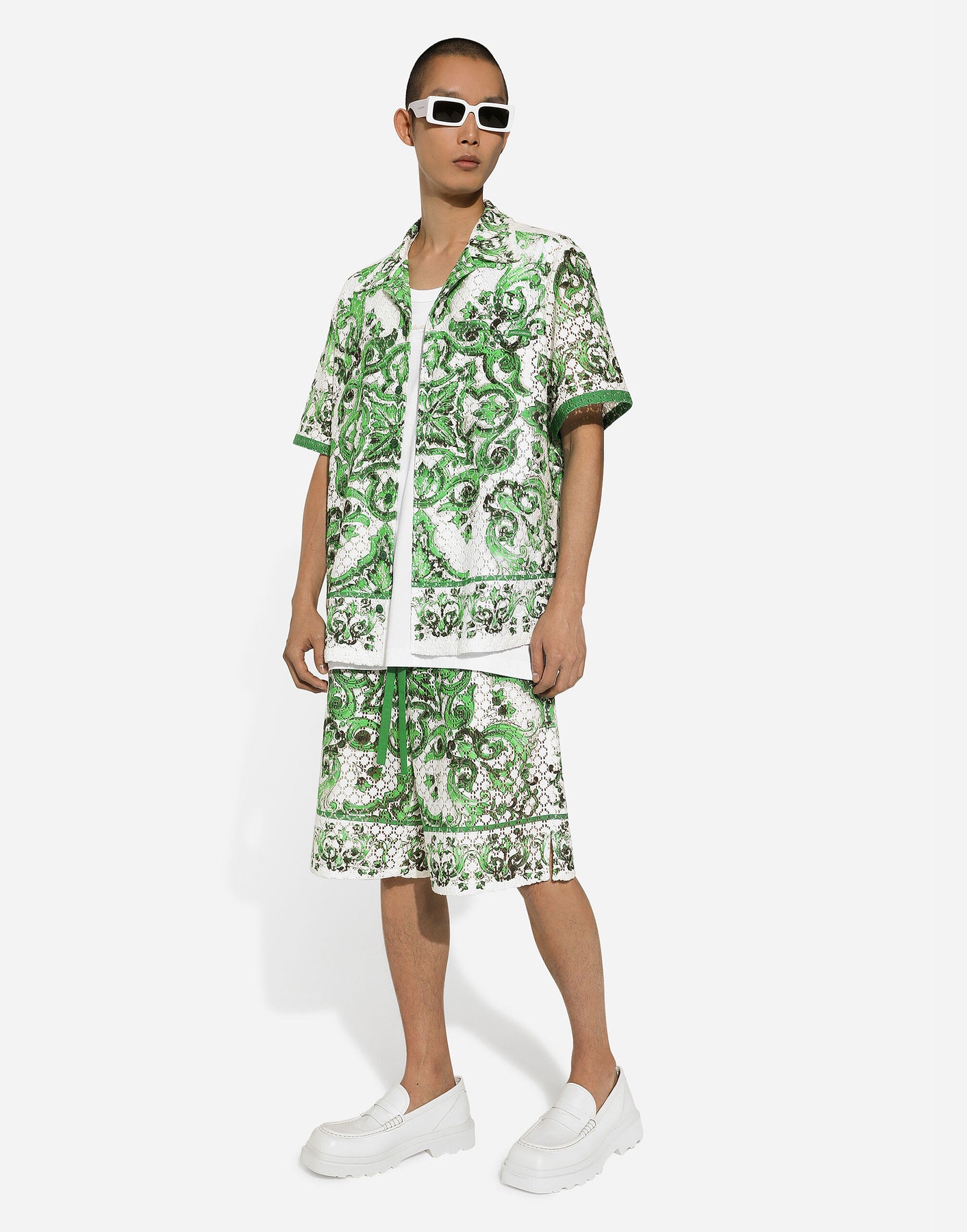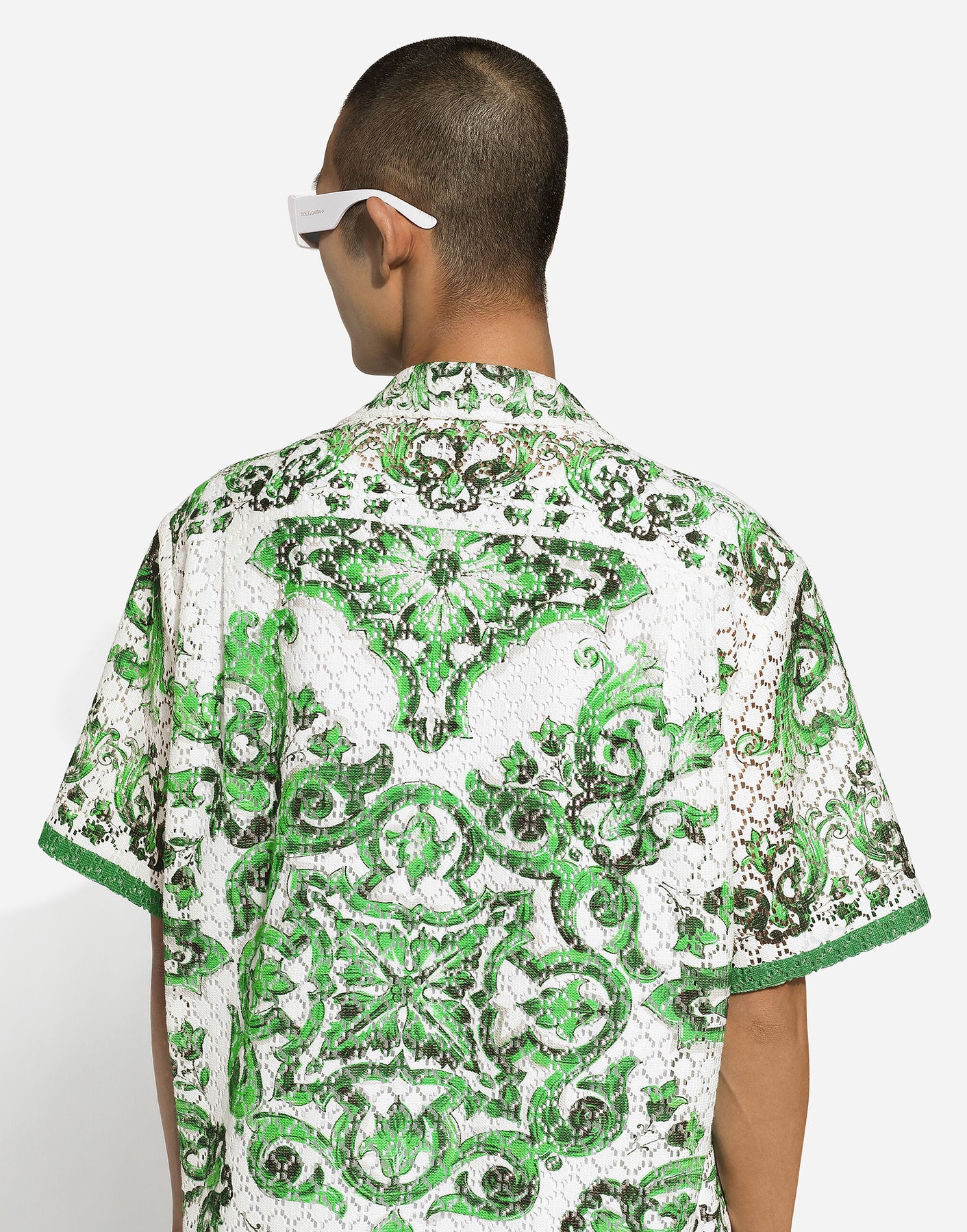 Majolica-print crochet Hawaiian shirt in technical cotton: