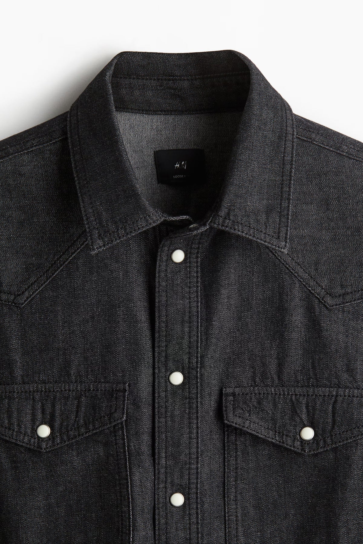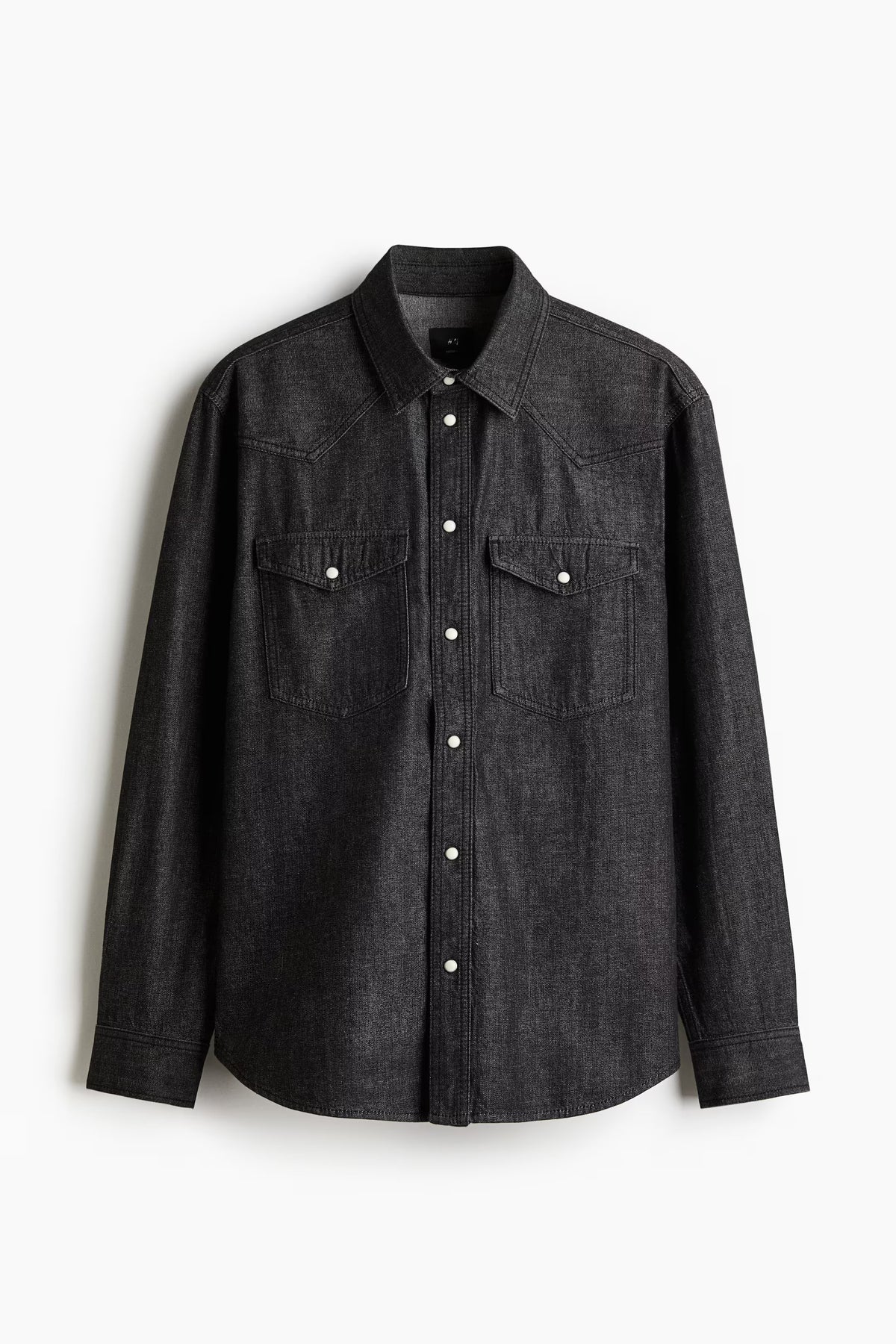Regular-fit, Western-inspired shirt in rigid cotton denim with a comfortable, classic silhouette. Collar, snap fasteners at front, and yoke at front and back. Chest pockets with flap and snap fastener, long sleeves, sleeve placket, and snap fastener at cuffs. Rounded hem.