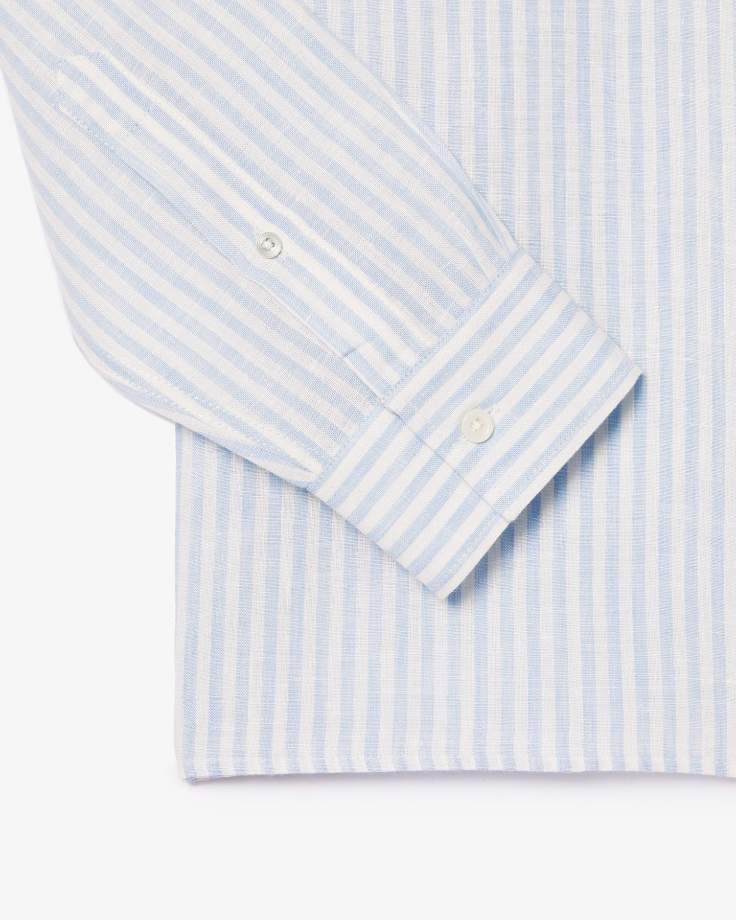 This impeccable shirt is made from cool, absorbent, striped linen. A versatile piece with an easy, relaxed cut, classic collar, and genuine mother-of-pearl buttons.