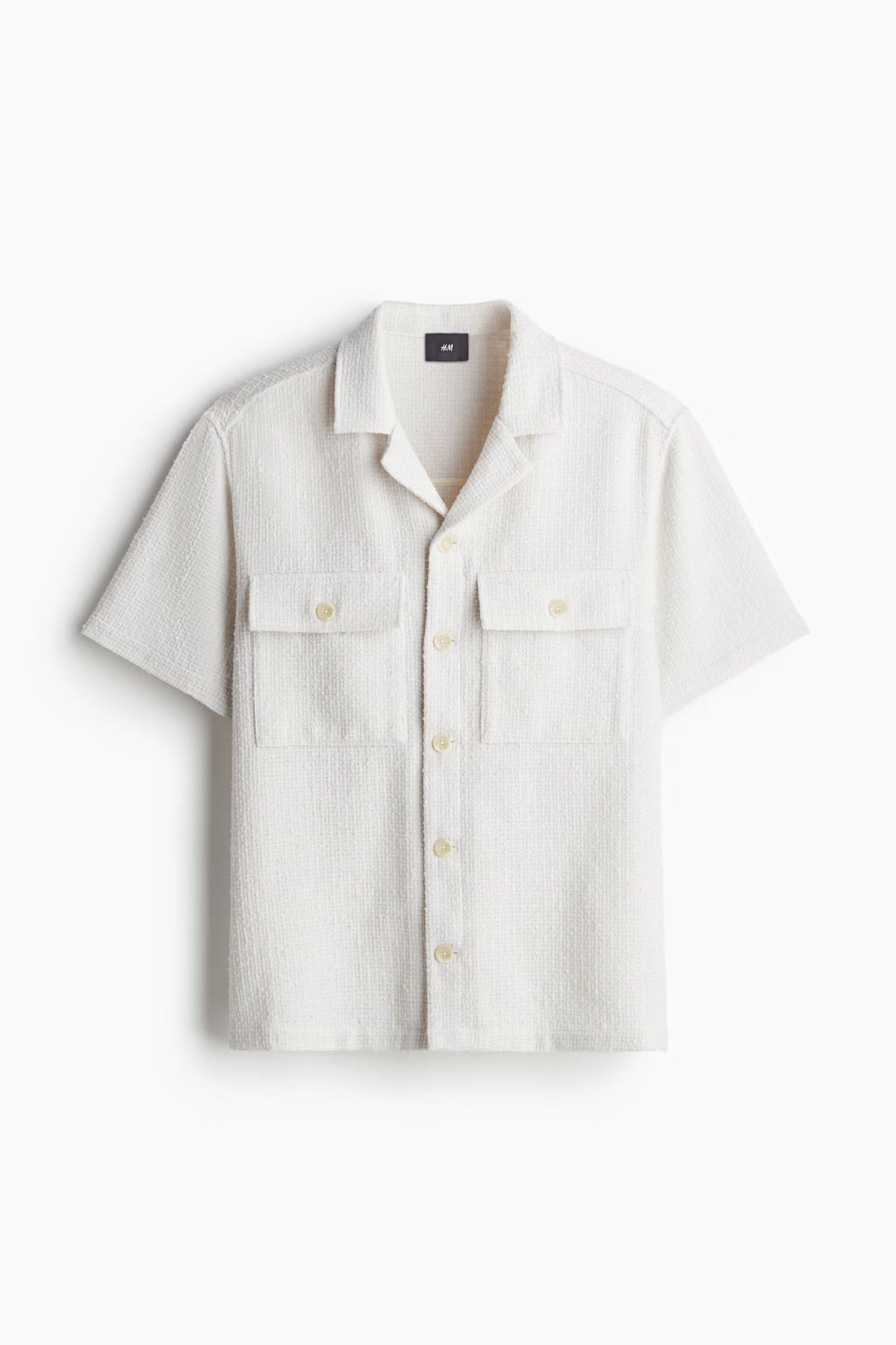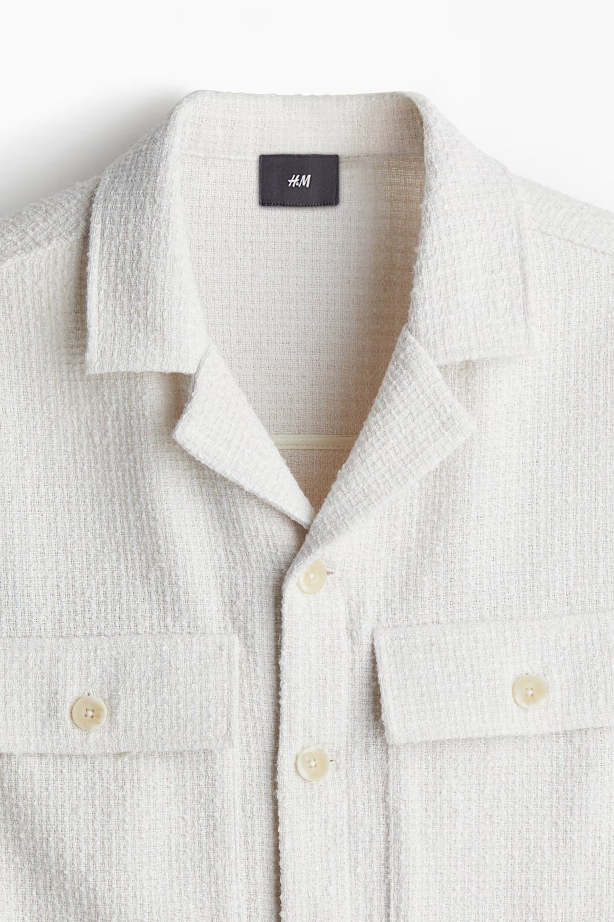 Regular-fit shirt in soft, woven bouclé fabric with a comfortable, classic silhouette. Resort collar, buttons at front, and yoke at back. Short sleeves and chest pockets with flap and button.